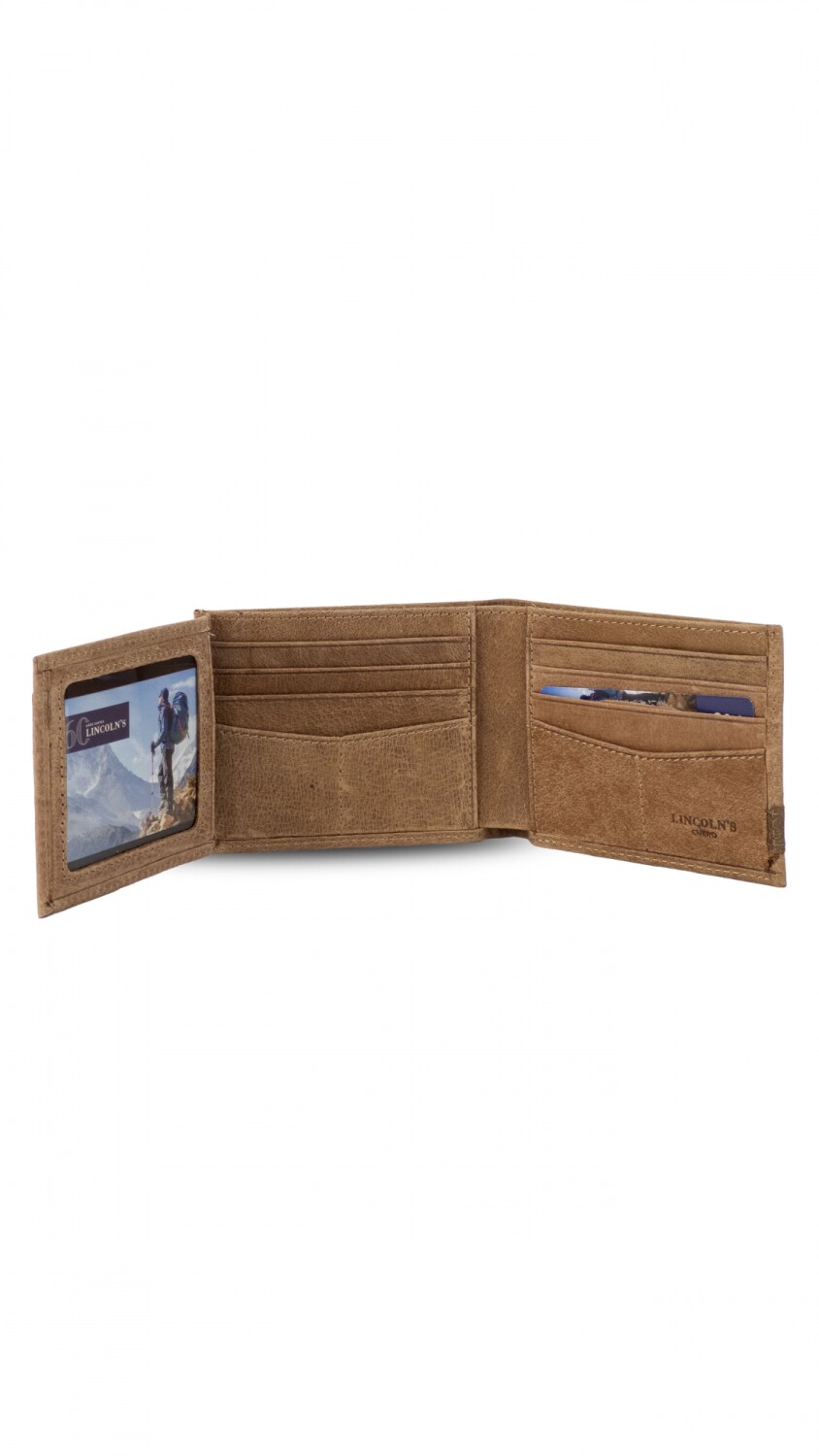 Billetera en cuero con guarda inferior combinada. Volante anterior con dos visores. Doble repartición para billetes, tarjeteros y bolsillos.