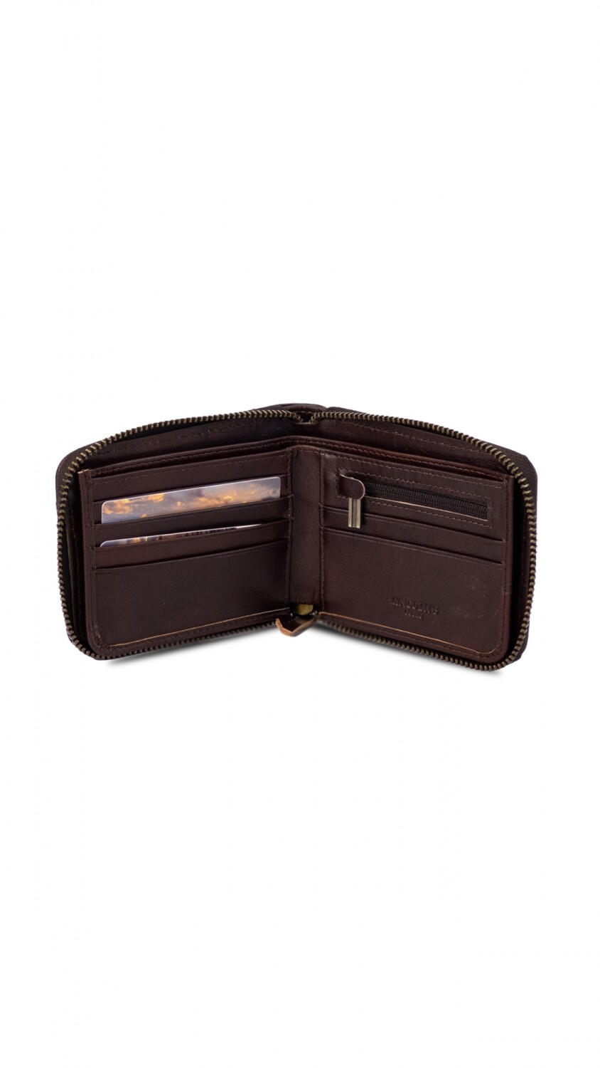 Billetera de cuero con doble repartición, espaciosa y funcional. Incluye tapa y cierre para mayor seguridad. Ideal para organizar tarjetas y billetes con estilo.