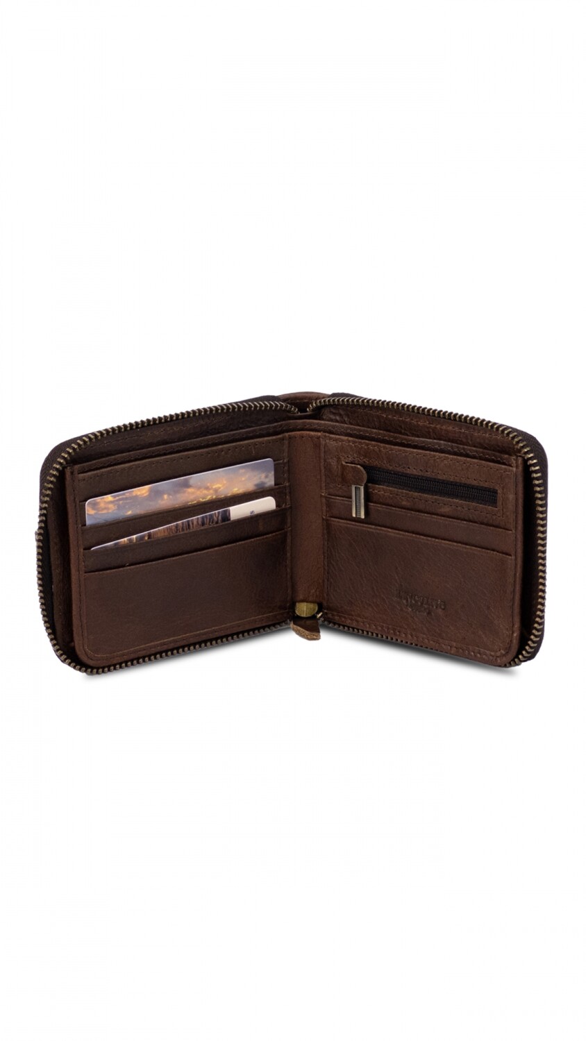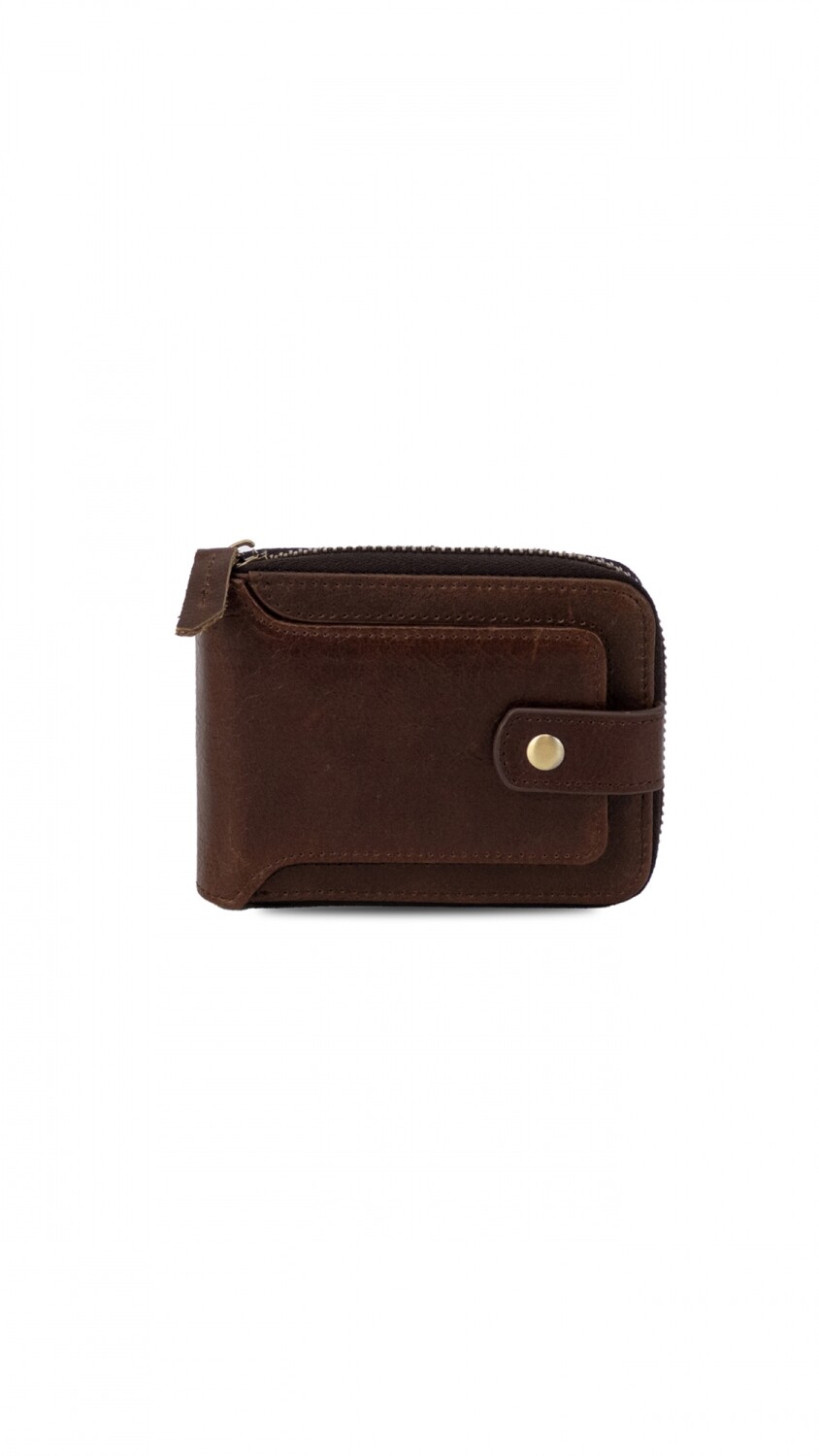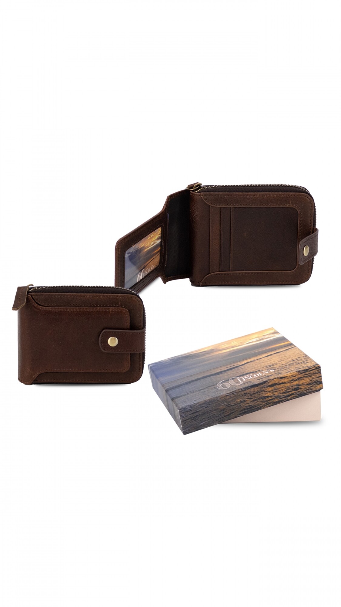Billetera de cuero con tapa y broche metálico, visor transparente, compartimientos internos y cierre seguro. Diseño elegante, resistente y funcional. Ideal para regalo.
