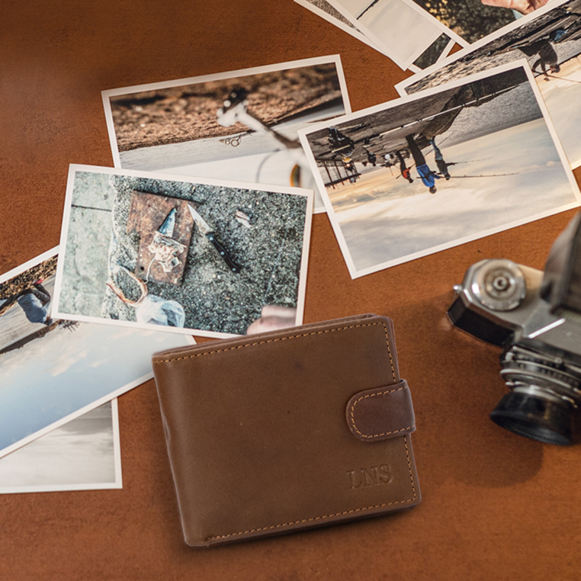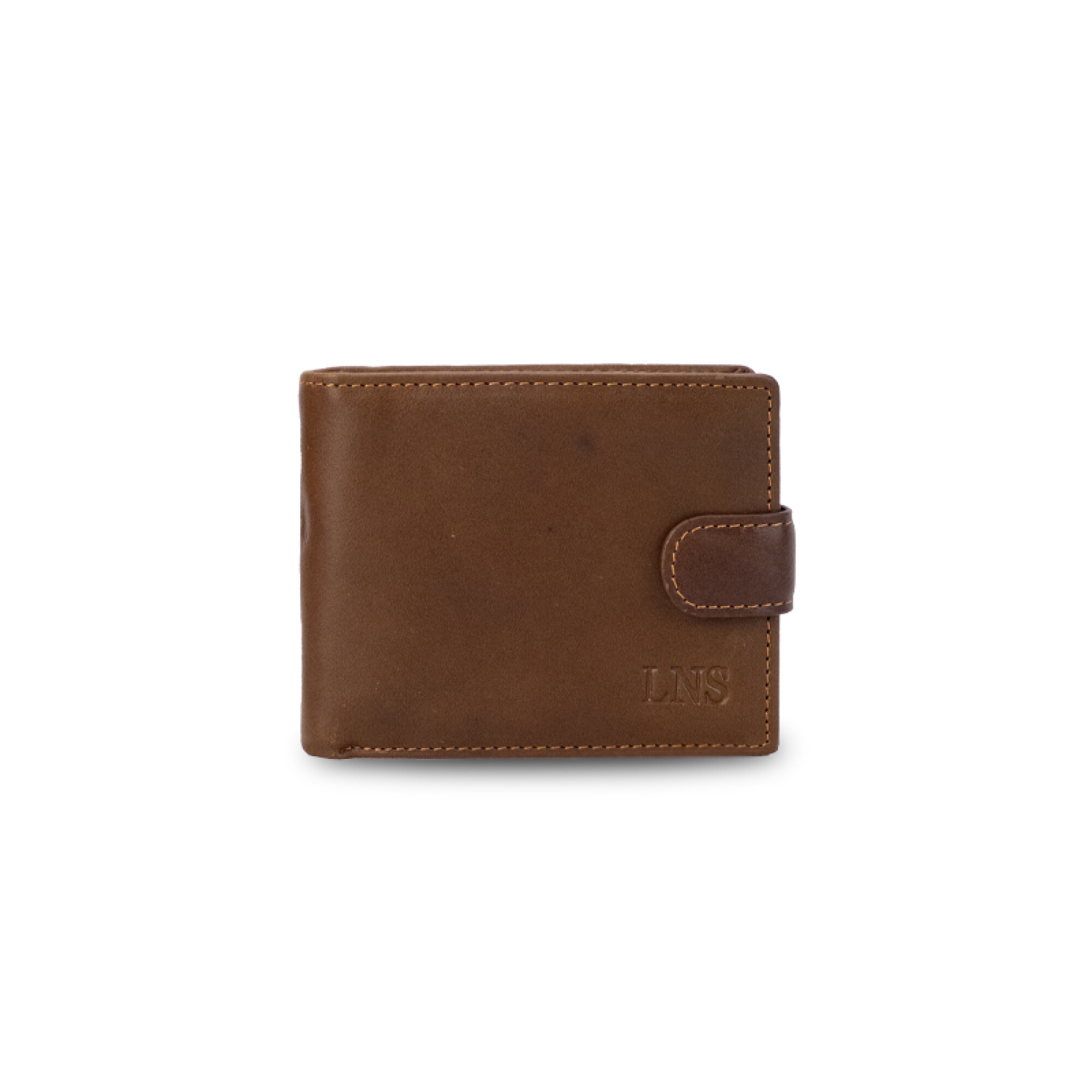 Billetera en cuero con presilla y broche a presión. Interior con volante superior y visor. Doble repartición para billetes, tarjeteros, bolsillos y monedero con cierre.