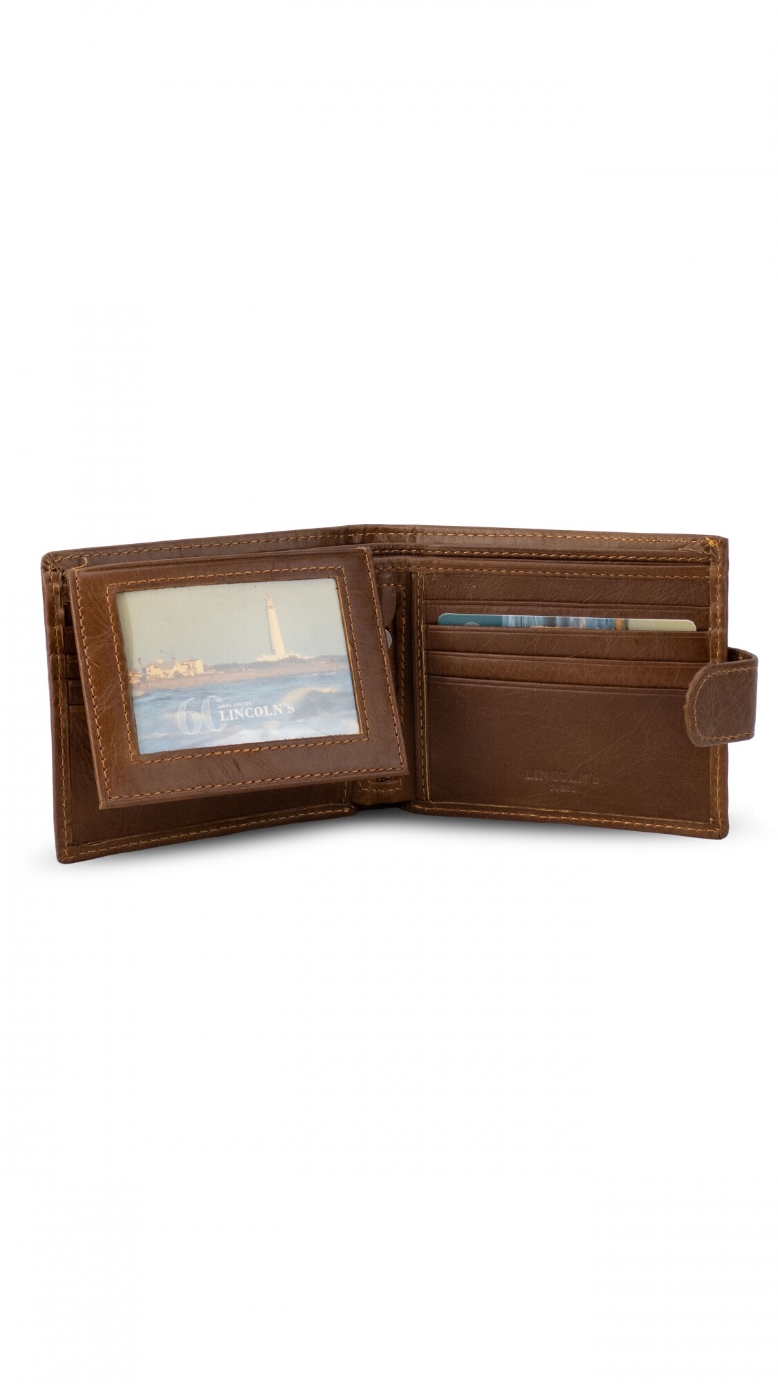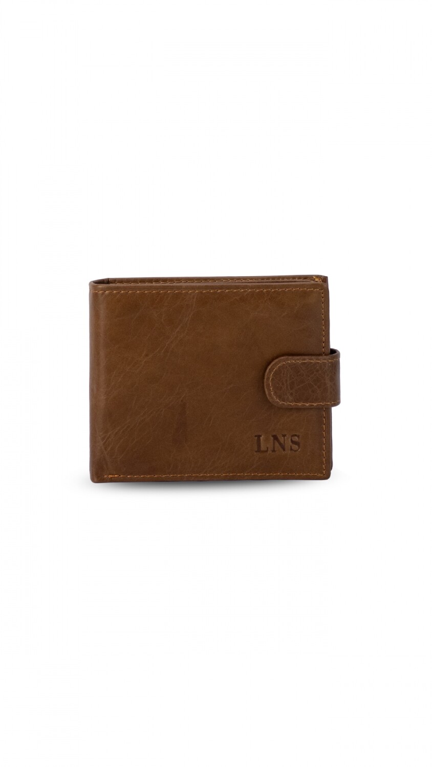 Billetera en cuero con presilla y broche a presión. Interior con volante superior y visor. Doble repartición para billetes, tarjeteros, bolsillos y monedero con cierre.