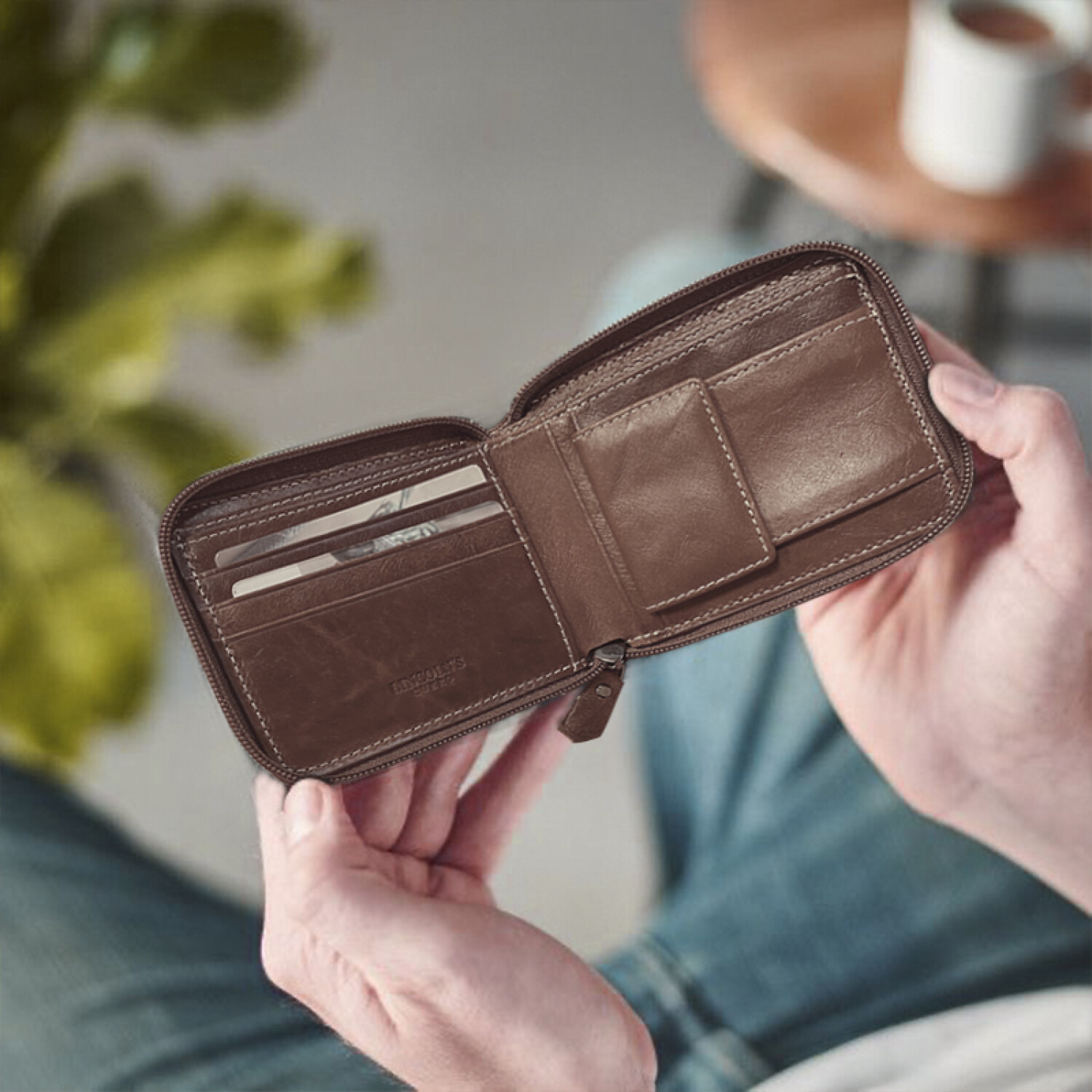 Billetera en cuero con doble pespunte artesanal y cierre alrededor. Interior con repartición para billetes, tarjeteros y monedero con broche