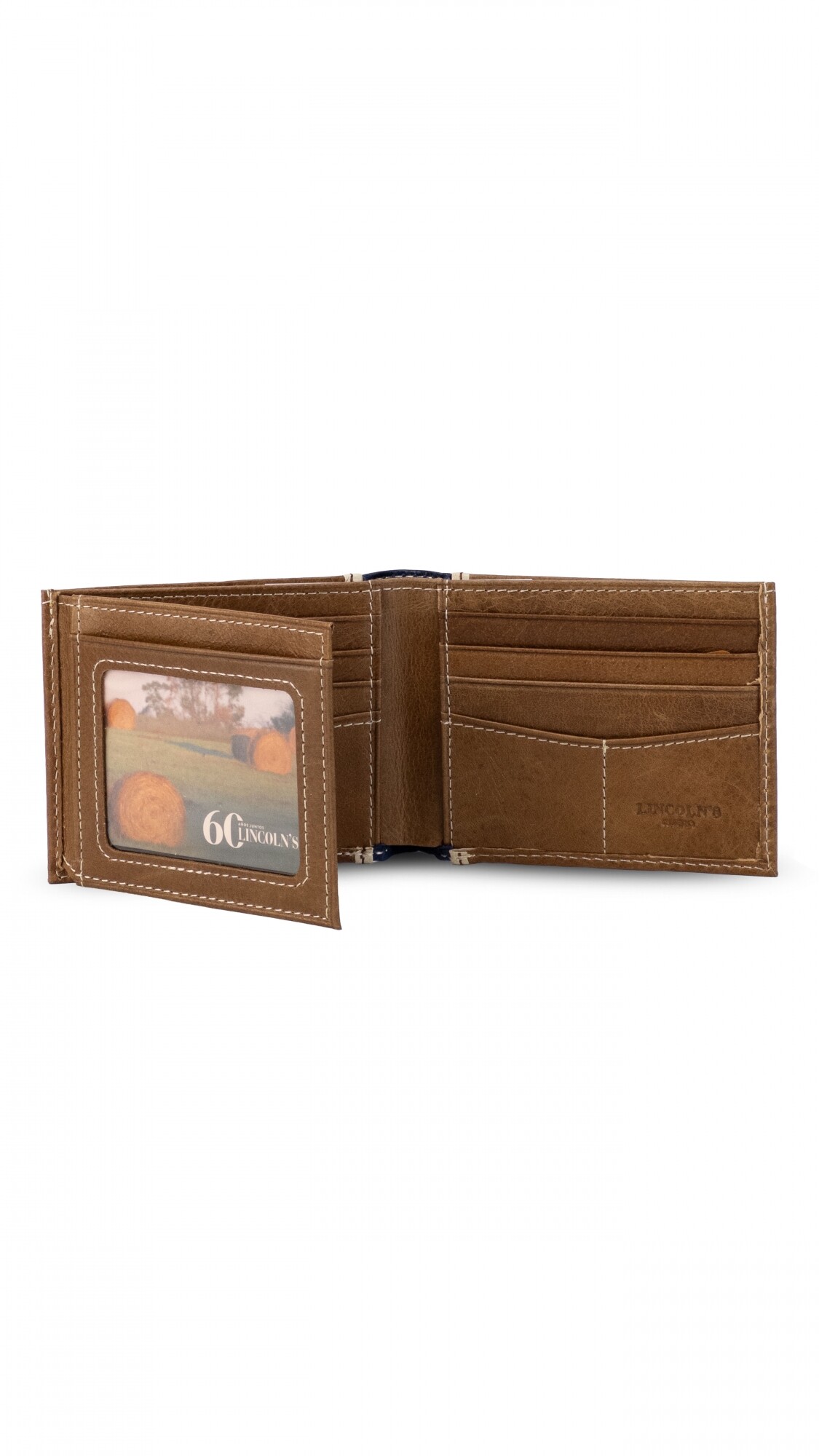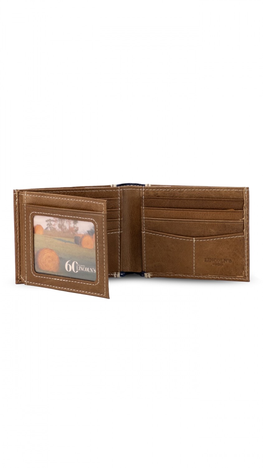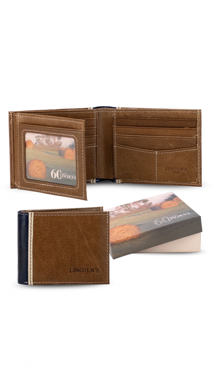 Billetera en cuero combinada con guarda. Bolsillo oculto al frente. Interior con volante anterior y visor. Doble repartición para billetes, tarjeteros, y bolsillos.