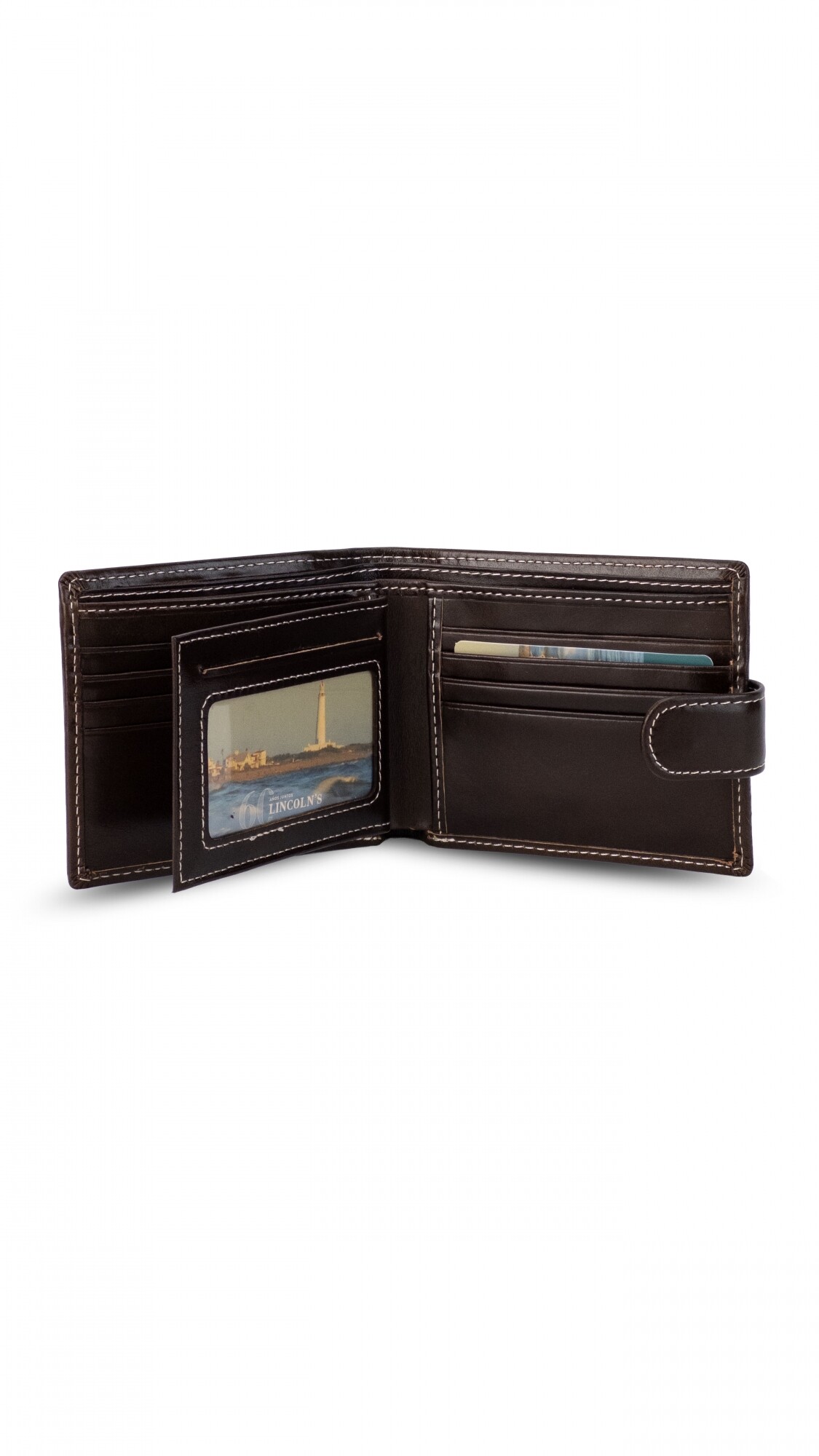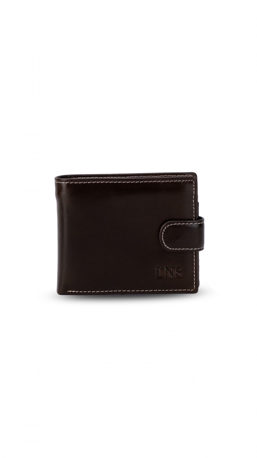 Billetera en cuero con presilla y broche a presión. Interior con volante al medio y visor, tarjeteros y bolsillos. Doble repartición para billetes y una repartición con cierre en la parte posterior interna.