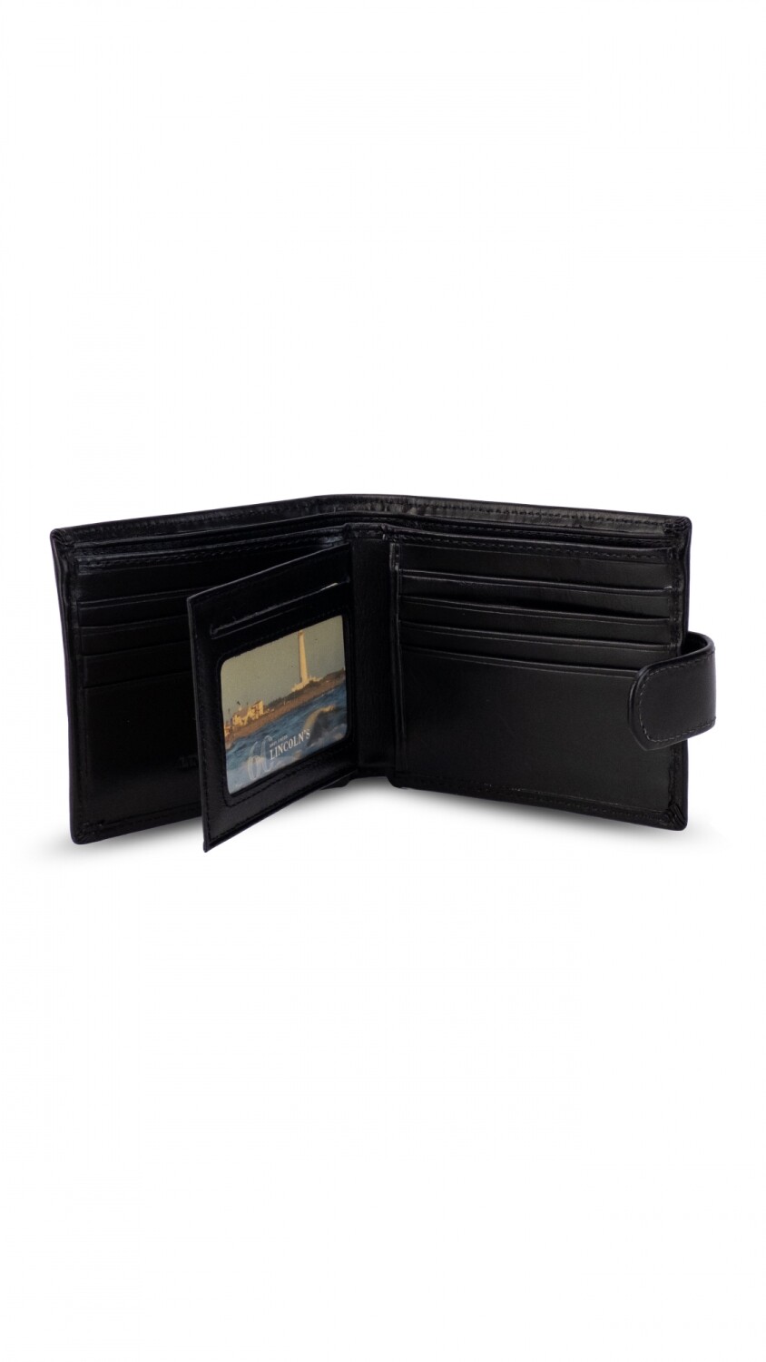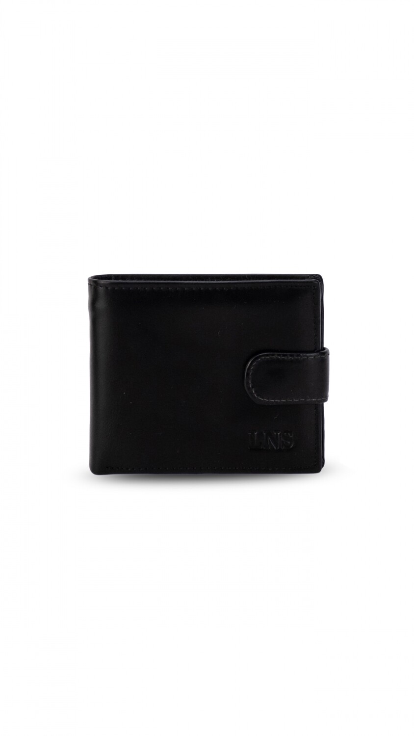 Billetera en cuero con presilla y broche a presión. Interior con volante al medio y visor, tarjeteros y bolsillos. Doble repartición para billetes y una repartición con cierre en la parte posterior interna.