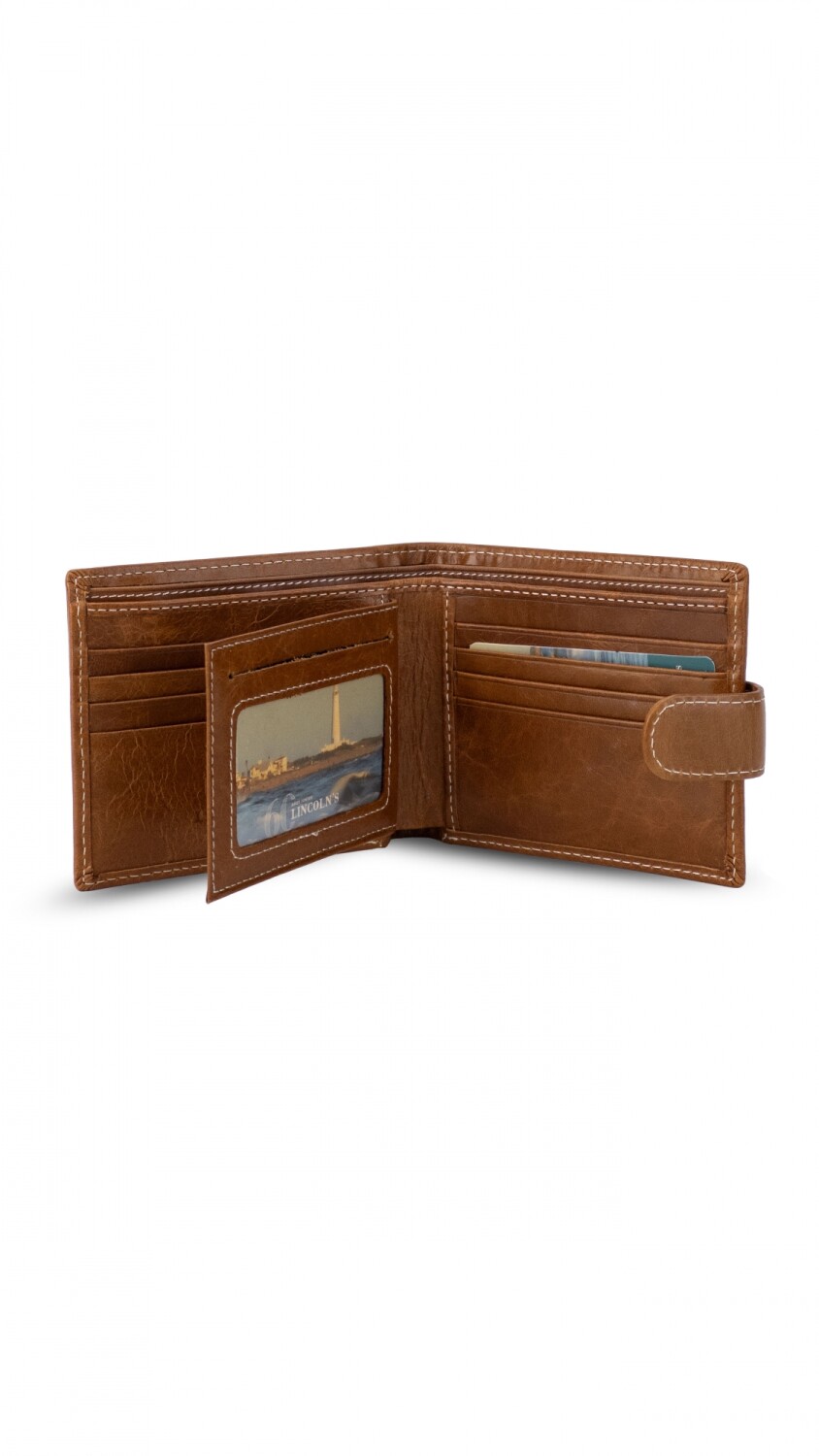 Billetera en cuero con presilla y broche a presión. Interior con volante al medio y visor, tarjeteros y bolsillos. Doble repartición para billetes y una repartición con cierre en la parte posterior interna.