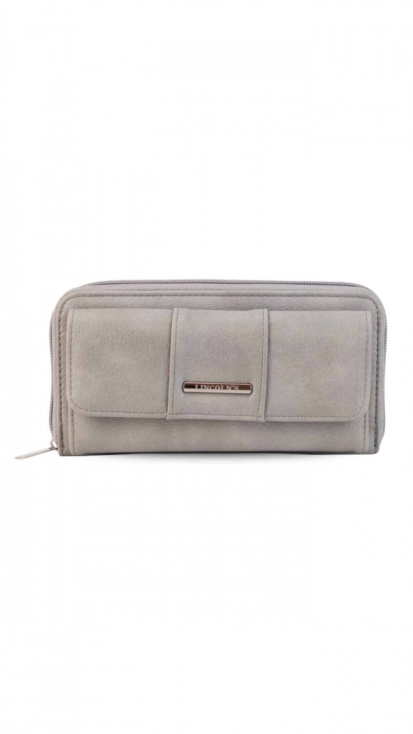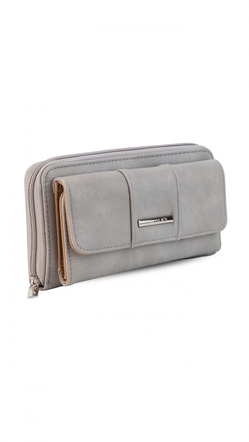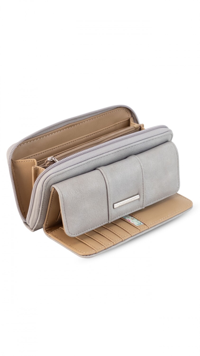 Billetera larga con solapa y broche a presión y repartición con cierre. Compartimento frontal con tarjeteros, visor y bolsillos. Compartimento posterior incluye monedero con cierre, tarjeteros y bolsillos. Bolsillo atrás con cierre.