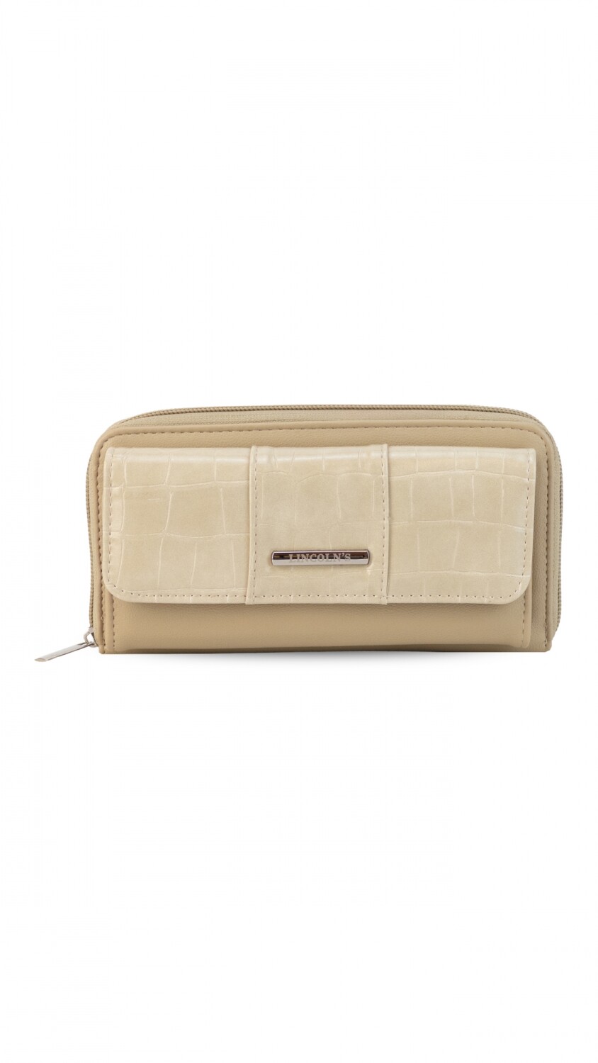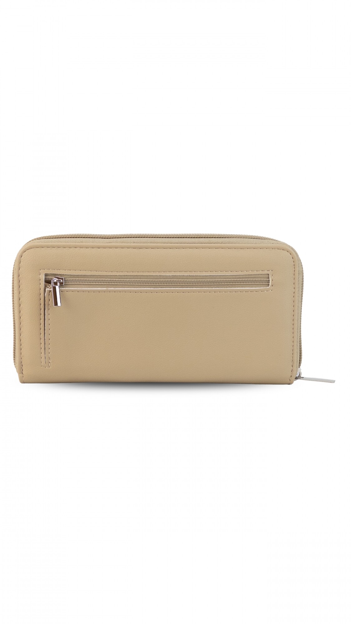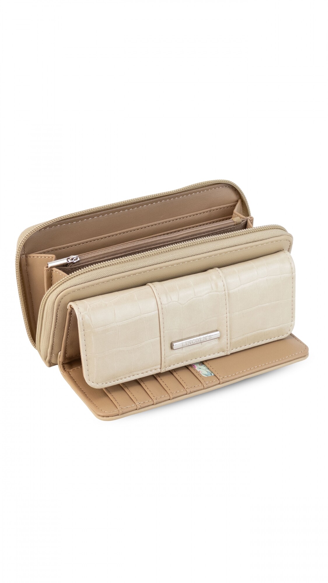 Billetera larga con solapa y broche a presión y repartición con cierre. Compartimento frontal con tarjeteros, visor y bolsillos. Compartimento posterior incluye monedero con cierre, tarjeteros y bolsillos. Bolsillo atrás con cierre.