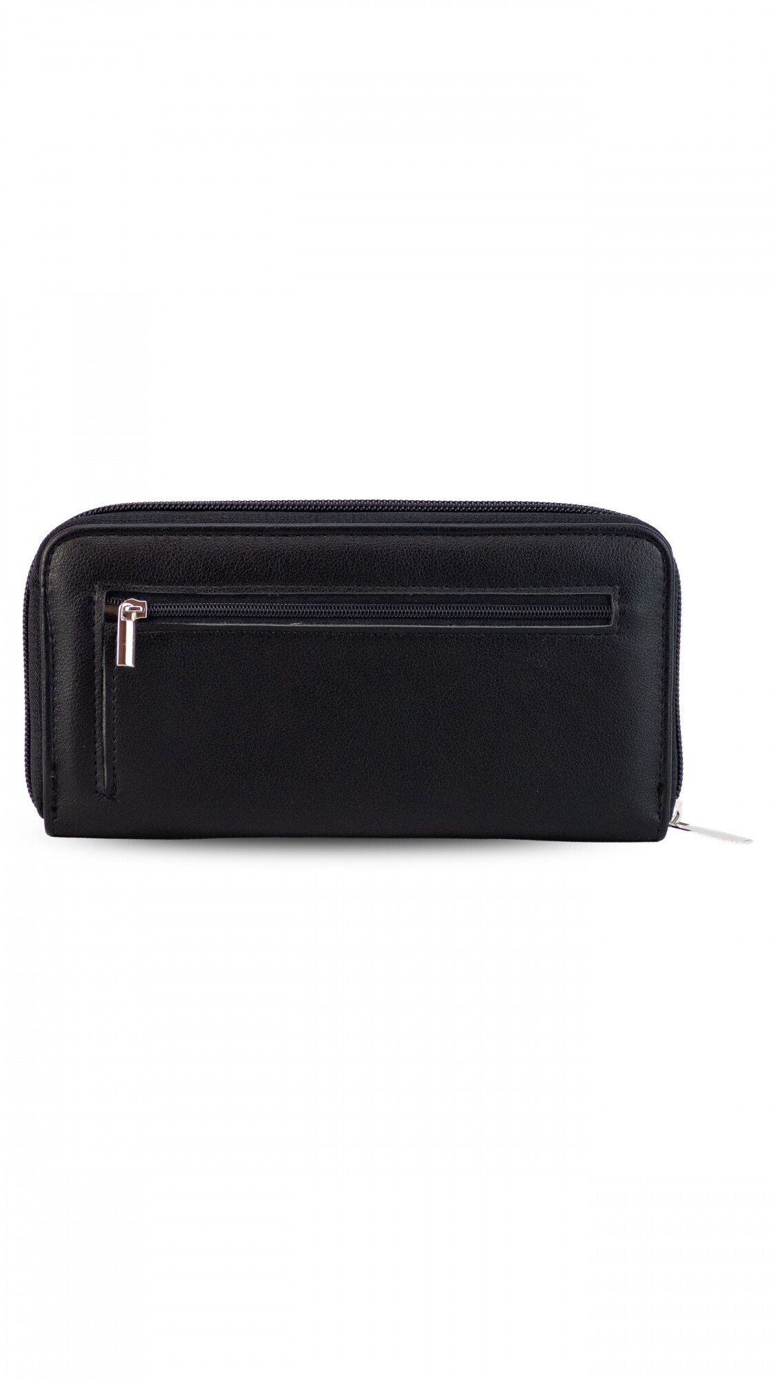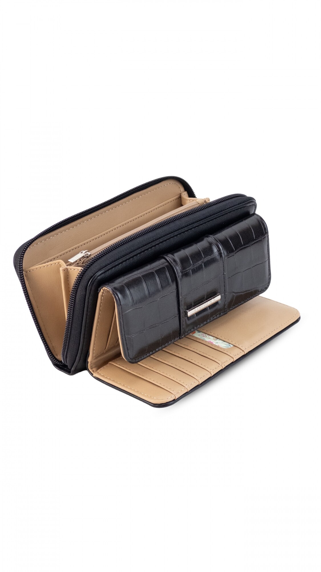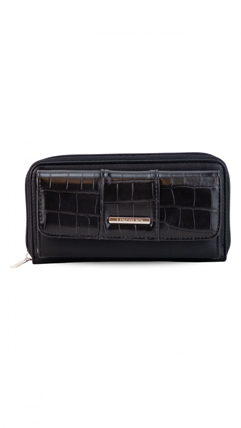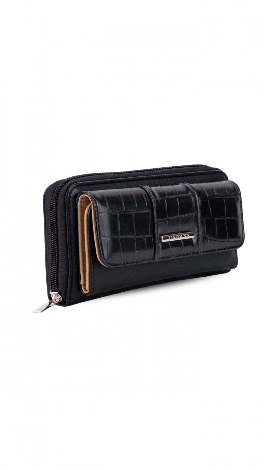 Billetera larga con solapa y broche a presión y repartición con cierre. Compartimento frontal con tarjeteros, visor y bolsillos. Compartimento posterior incluye monedero con cierre, tarjeteros y bolsillos. Bolsillo atrás con cierre.