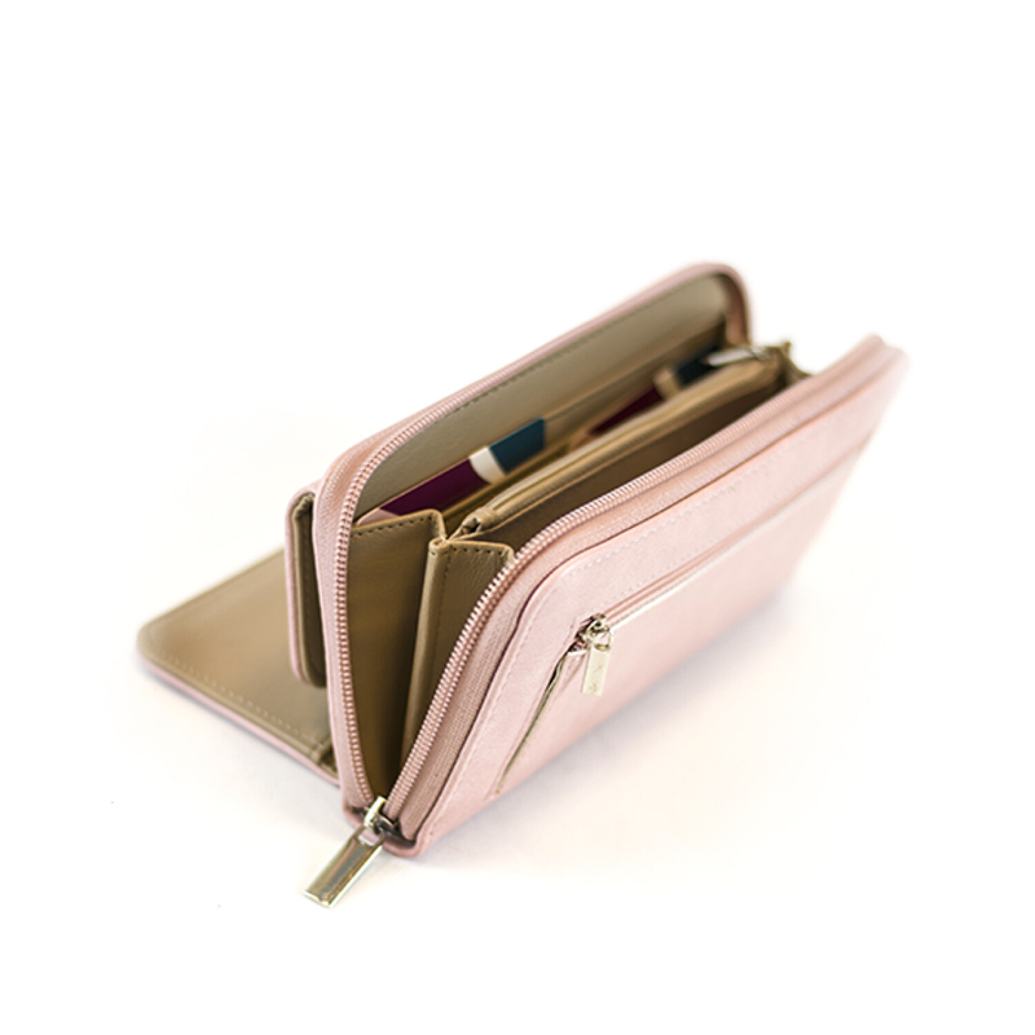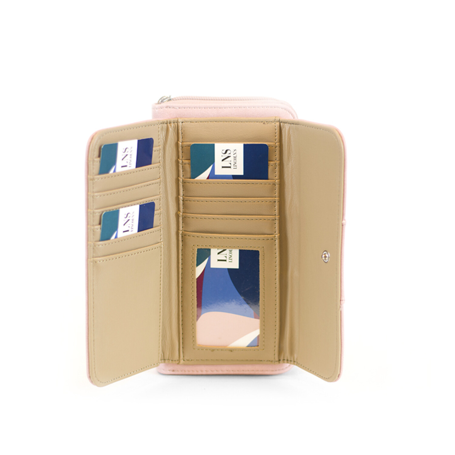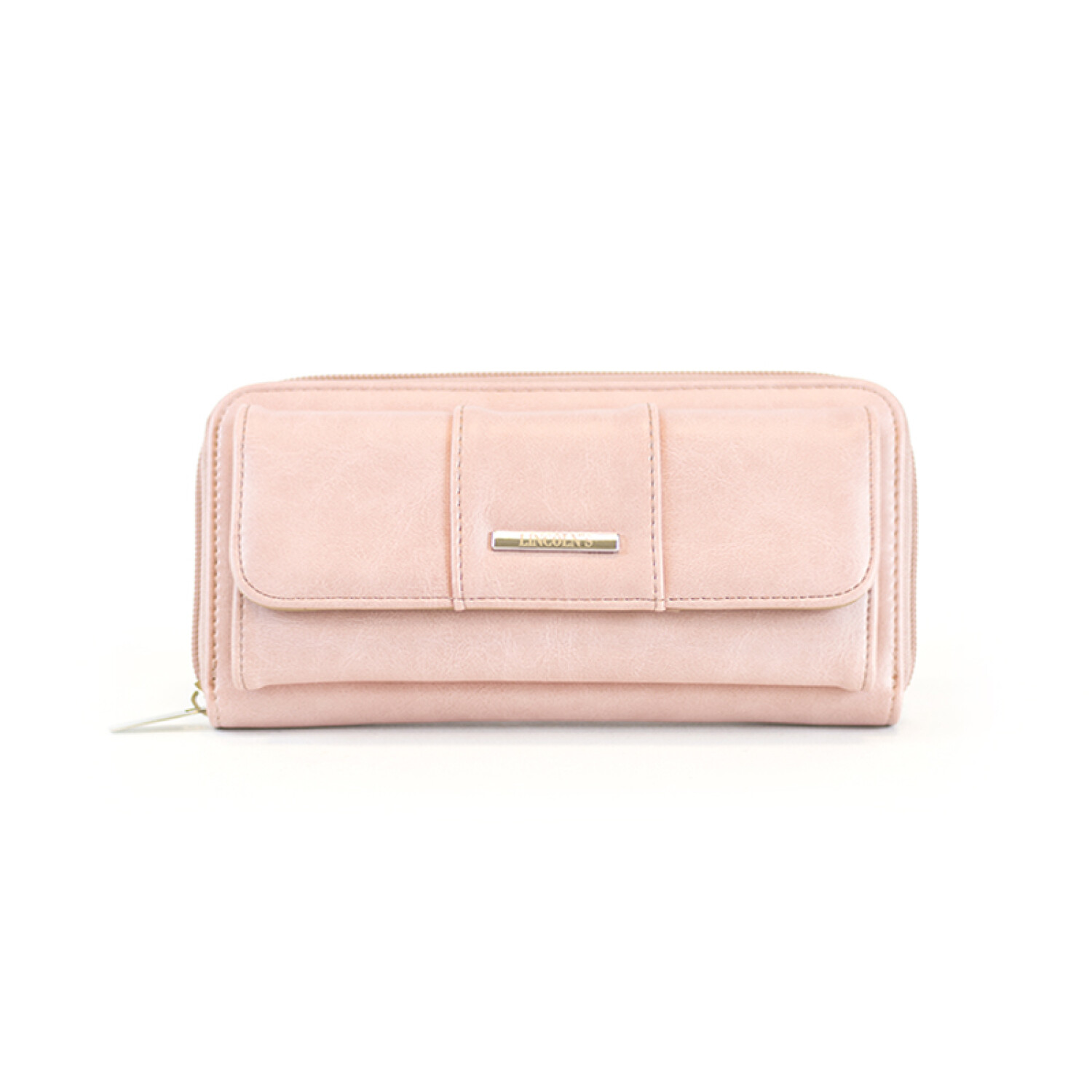 Billetera larga con solapa y broche a presión y repartición con cierre. Compartimento frontal con tarjeteros, visor y bolsillos. Compartimento posterior incluye monedero con cierre, tarjeteros y bolsillos. Bolsillo atrás con cierre.