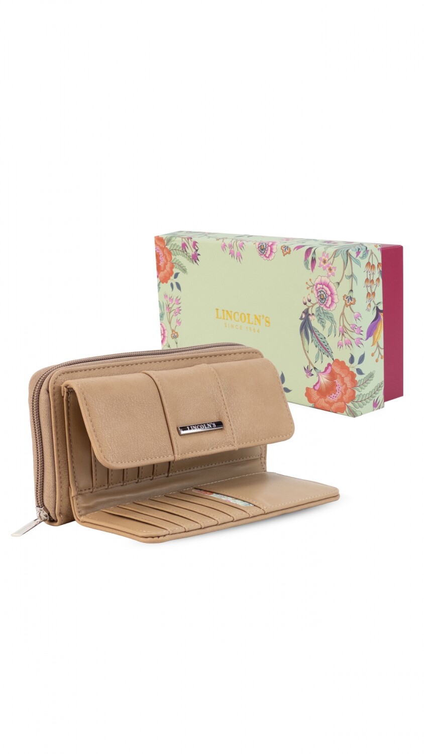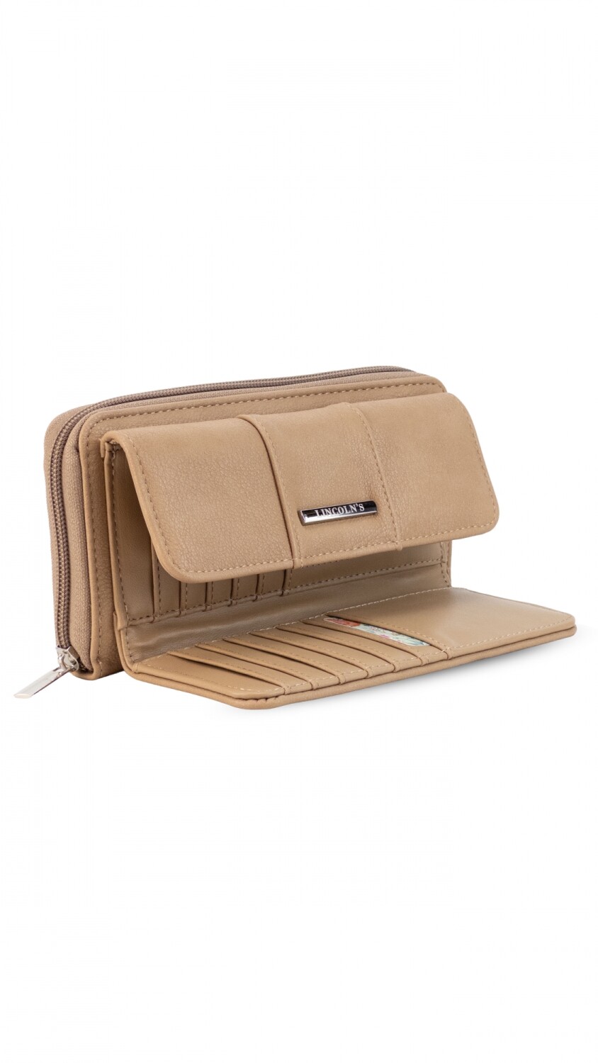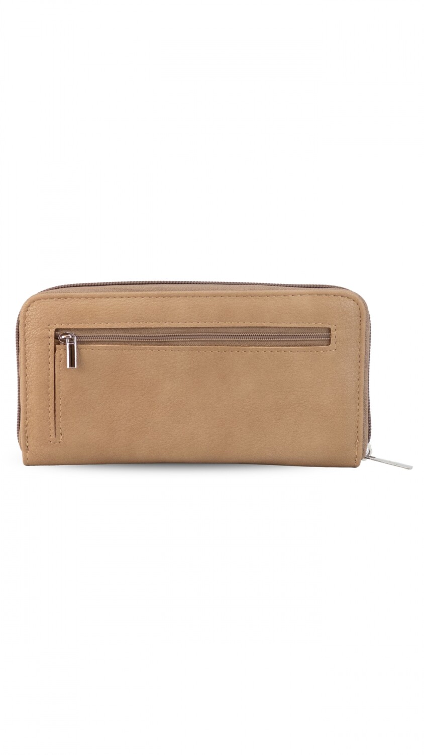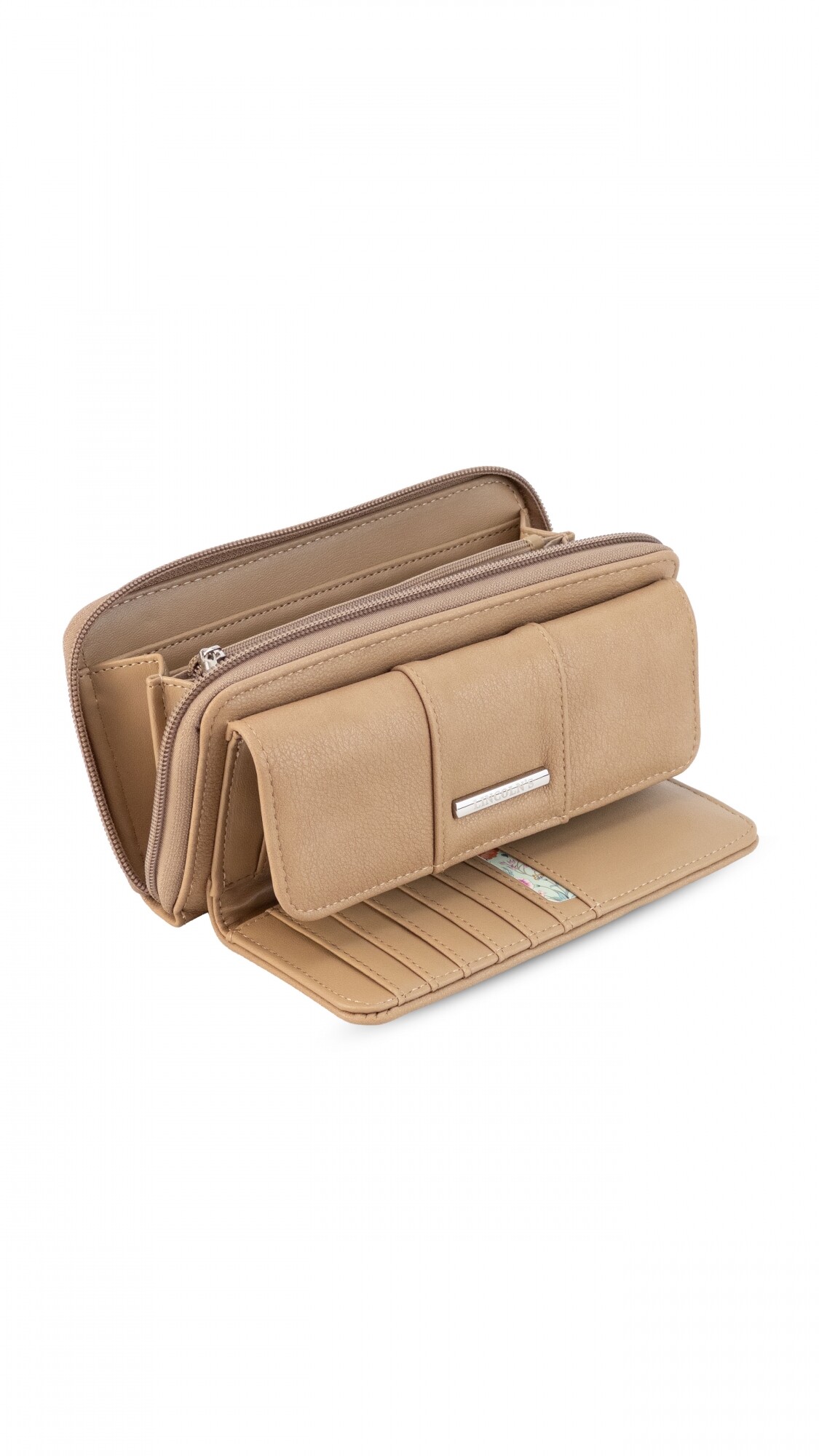 Billetera larga con solapa y broche a presión y repartición con cierre. Compartimento frontal con tarjeteros, visor y bolsillos. Compartimento posterior incluye monedero con cierre, tarjeteros y bolsillos. Bolsillo atrás con cierre.