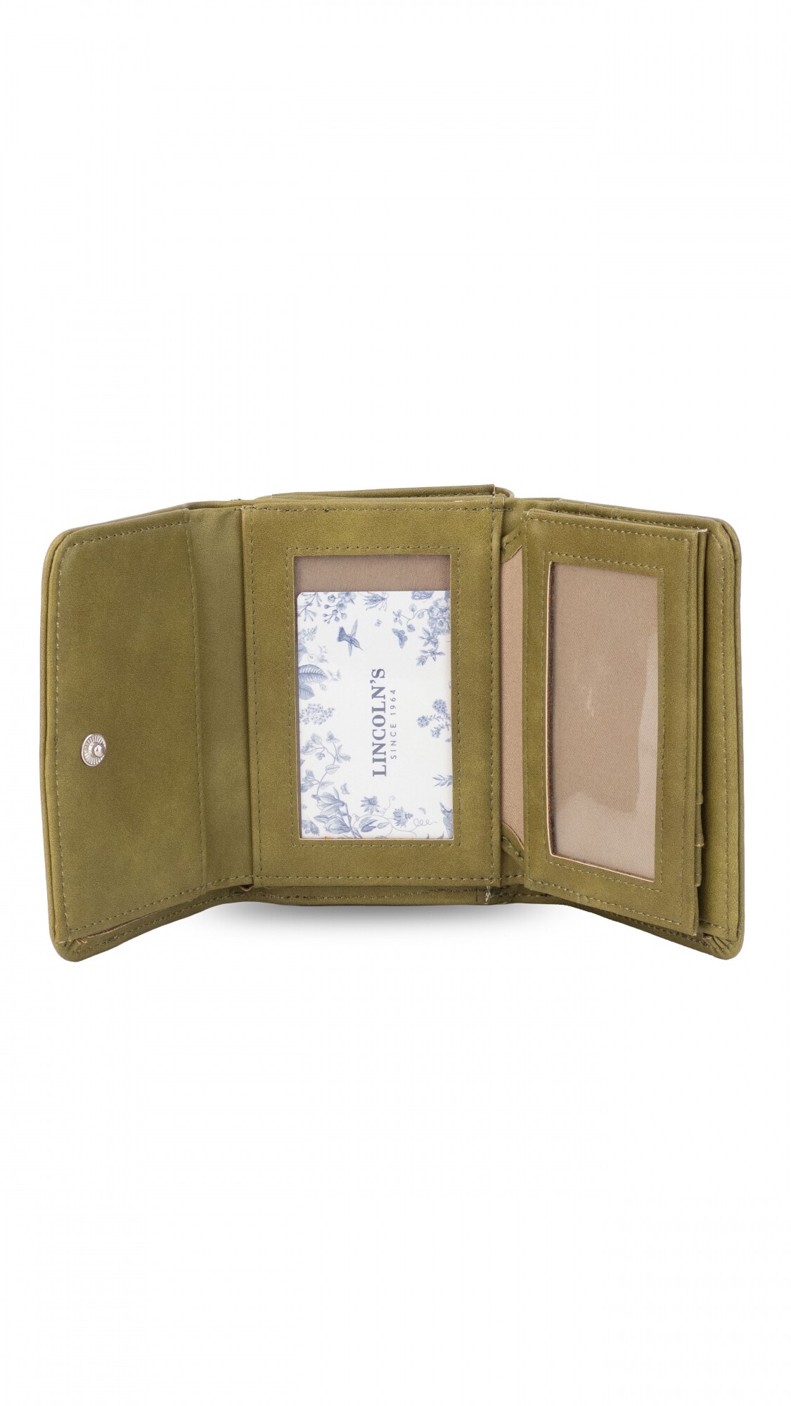 Billetera mediana con broche a presión. Interior con volante, tarjeteros, visores, bolsillos y repartición para billetes. Compartimento posterior con cierre y dos divisiones internas.