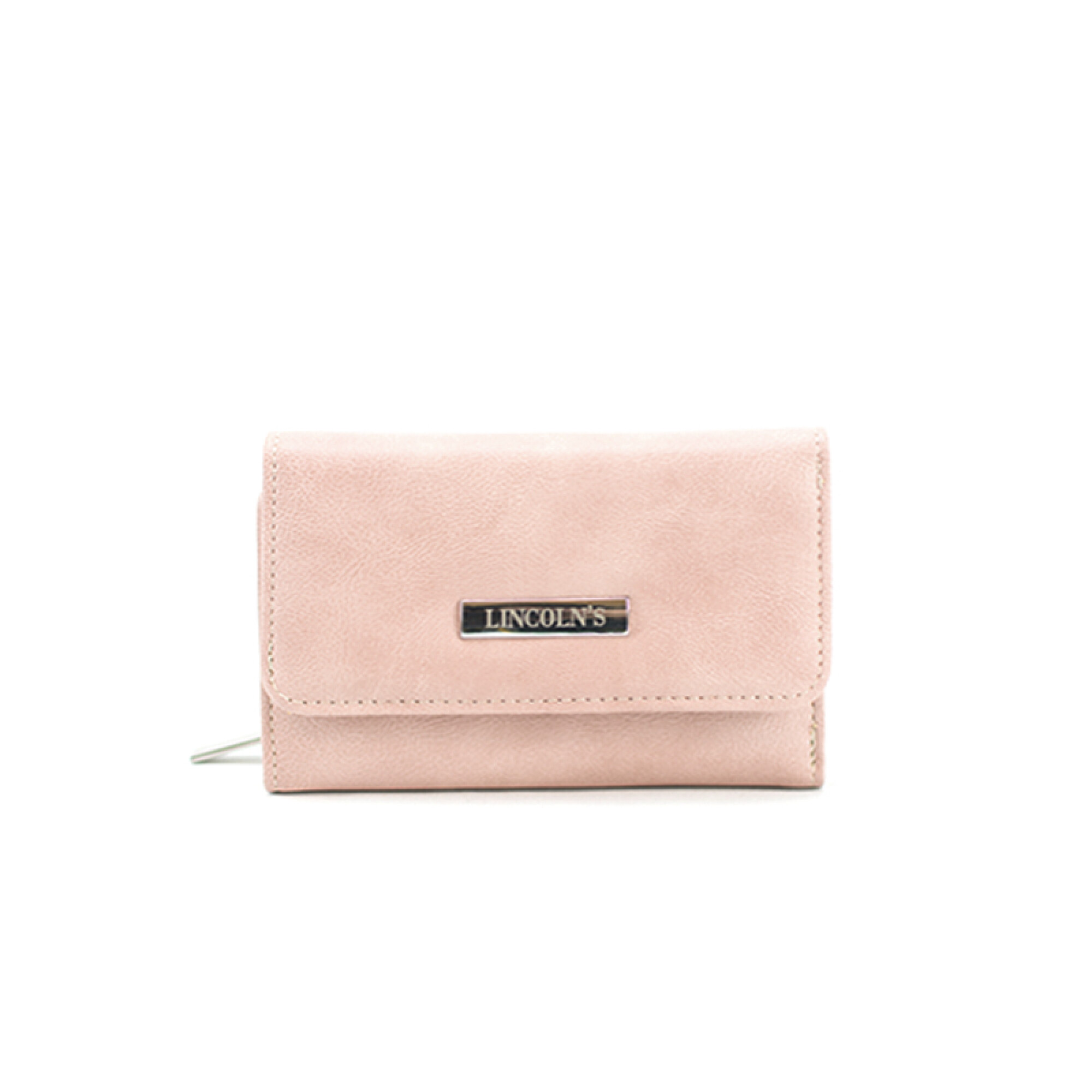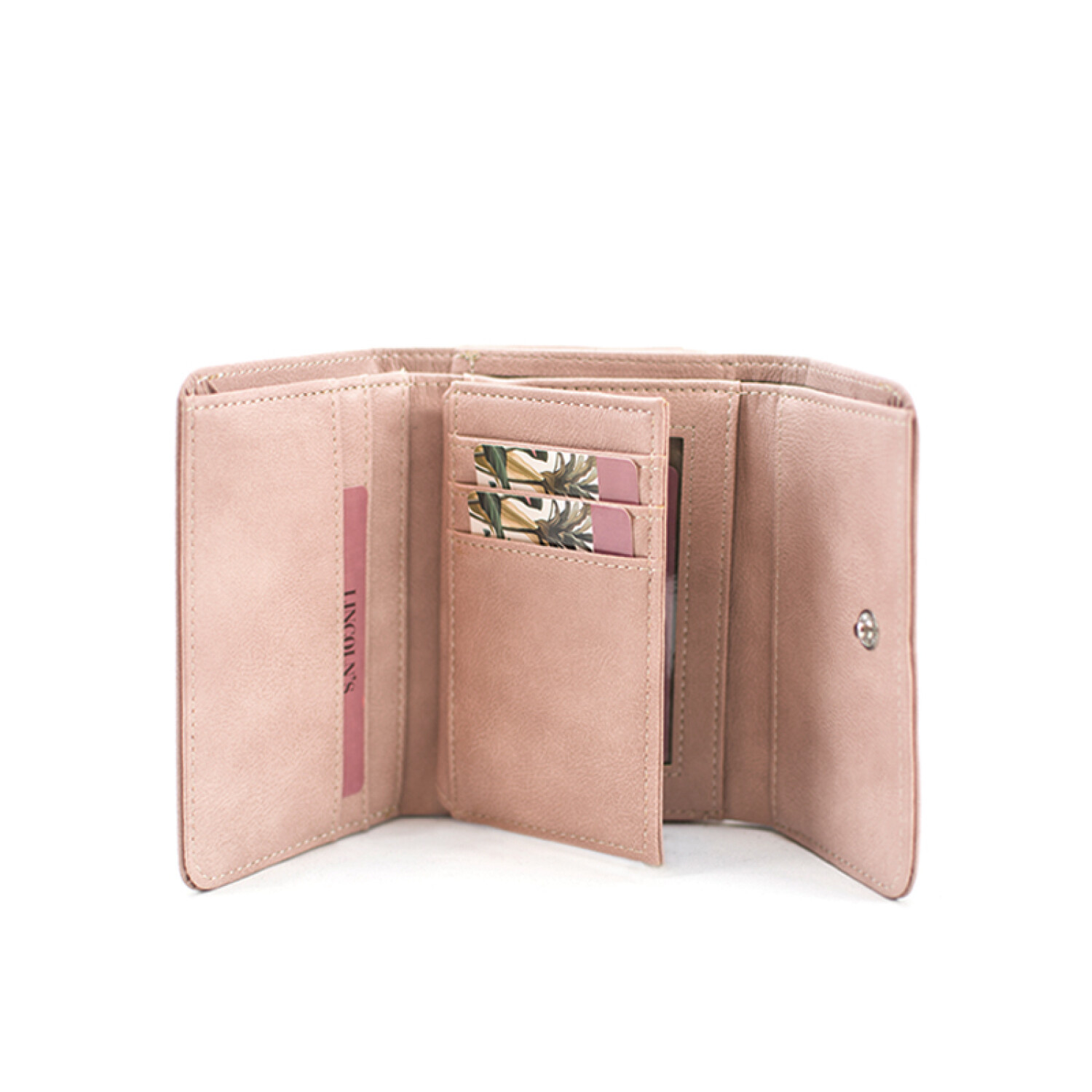 Billetera mediana con broche a presión. Interior con volante, tarjeteros, visores, bolsillos y repartición para billetes. Compartimento posterior con cierre y dos divisiones internas.