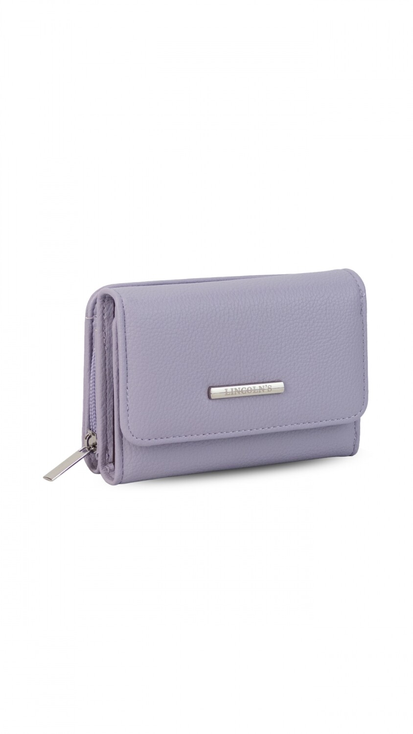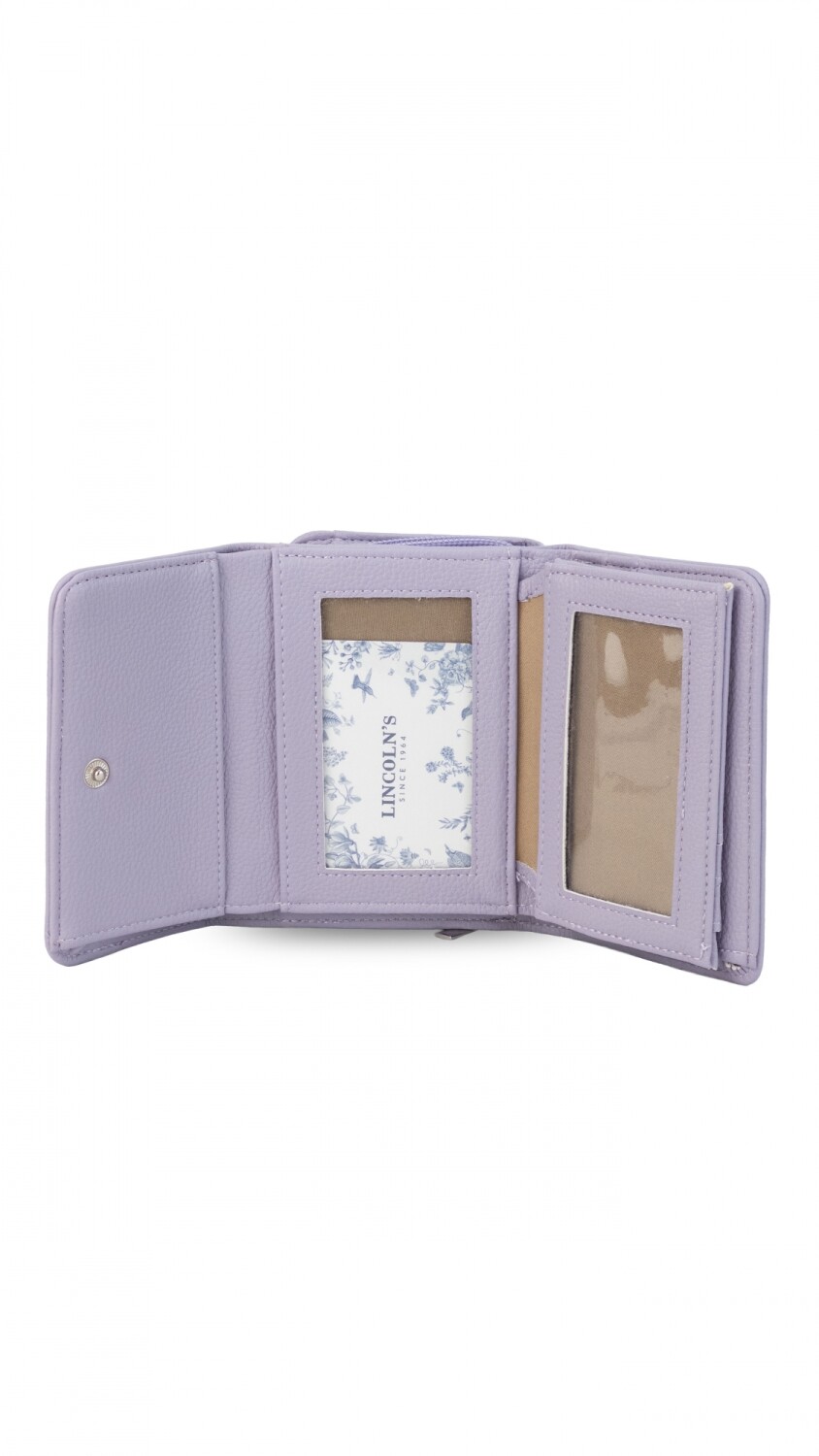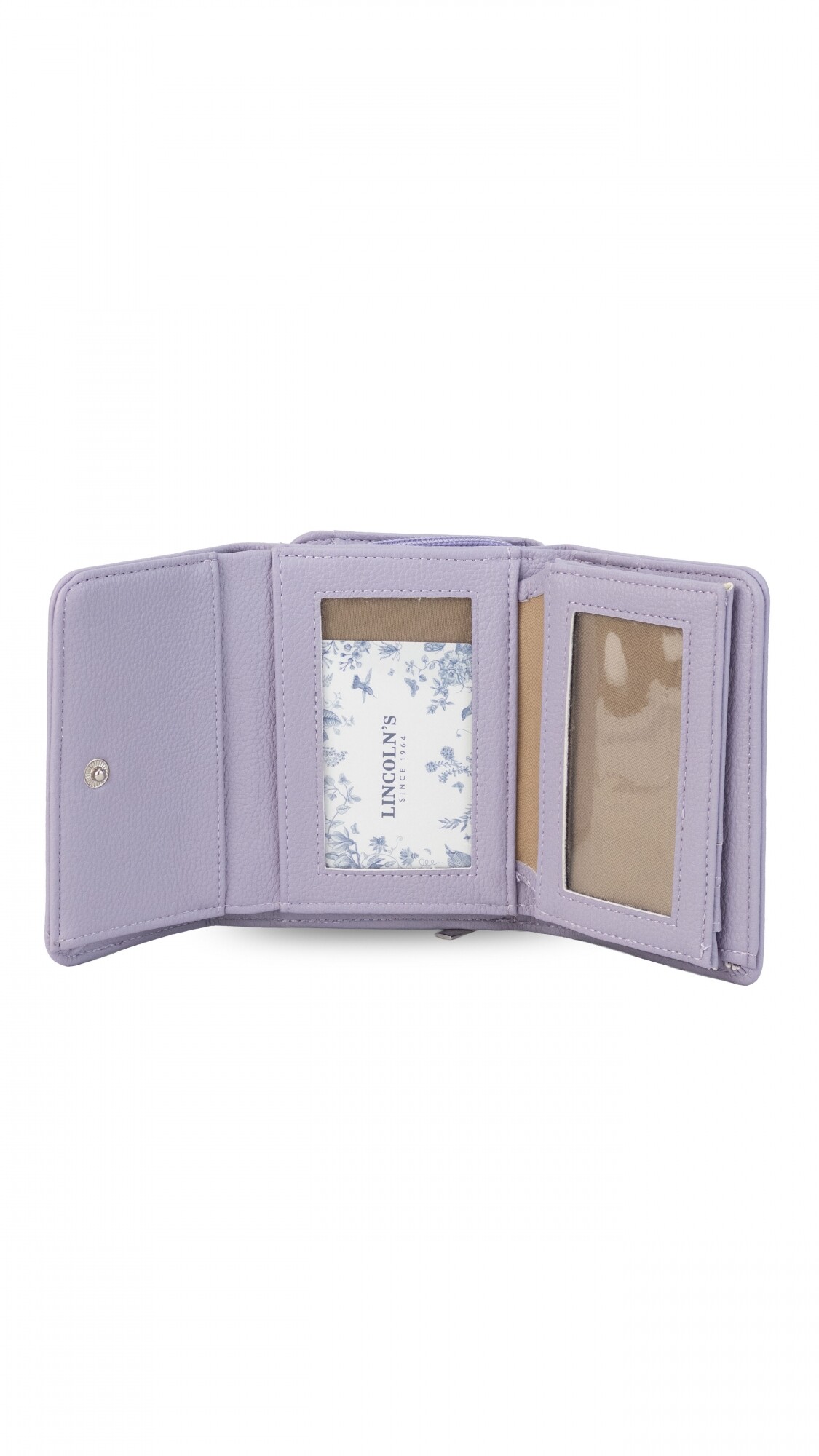 Billetera mediana con broche a presión. Interior con volante, tarjeteros, visores, bolsillos y repartición para billetes. Compartimento posterior con cierre y dos divisiones internas.