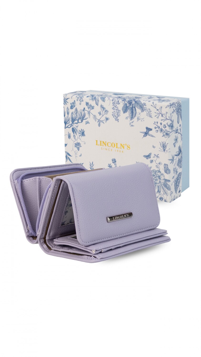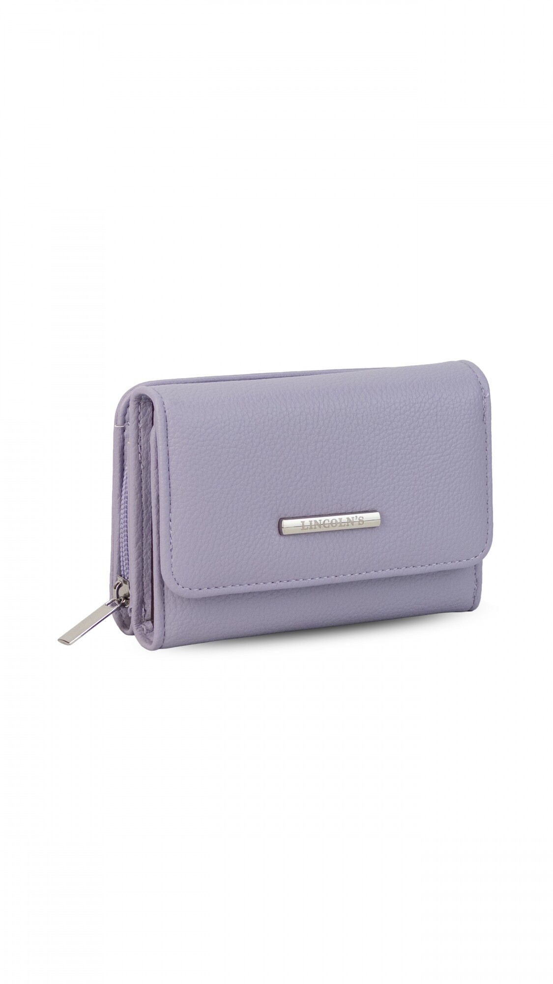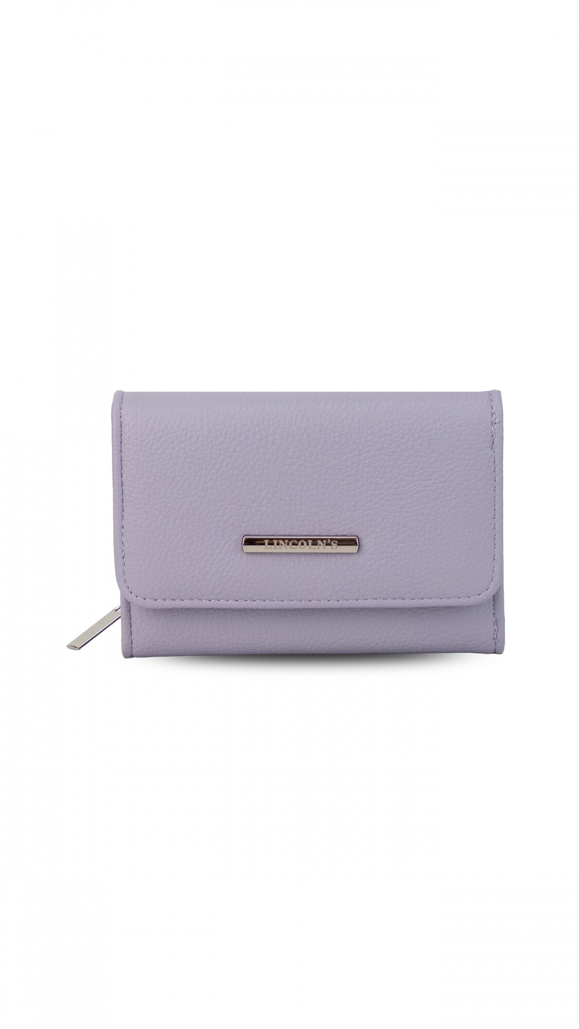 Billetera mediana con broche a presión. Interior con volante, tarjeteros, visores, bolsillos y repartición para billetes. Compartimento posterior con cierre y dos divisiones internas.
