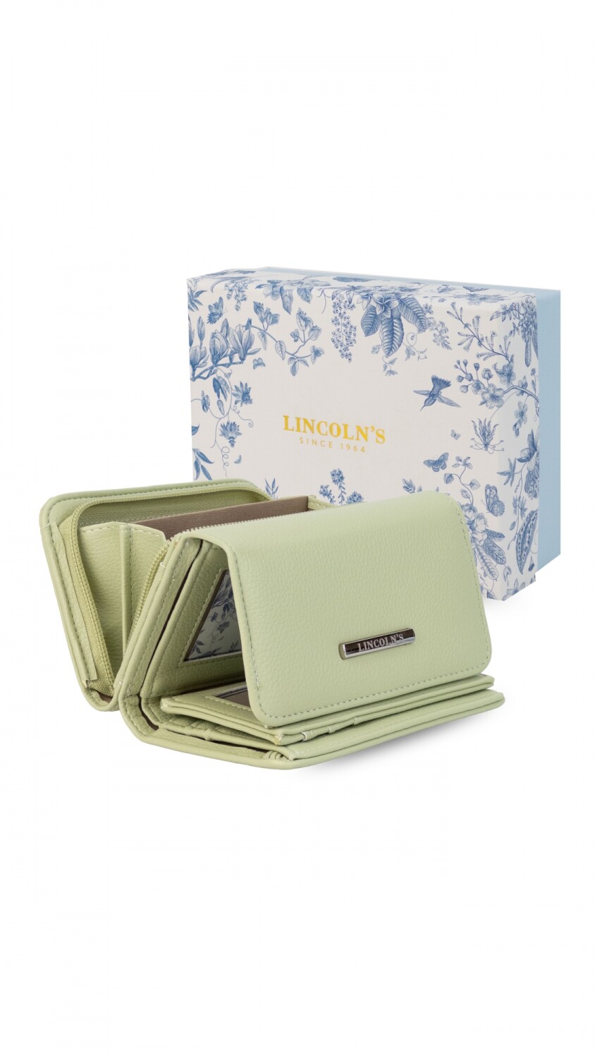 Billetera mediana con broche a presión. Interior con volante, tarjeteros, visores, bolsillos y repartición para billetes. Compartimento posterior con cierre y dos divisiones internas.