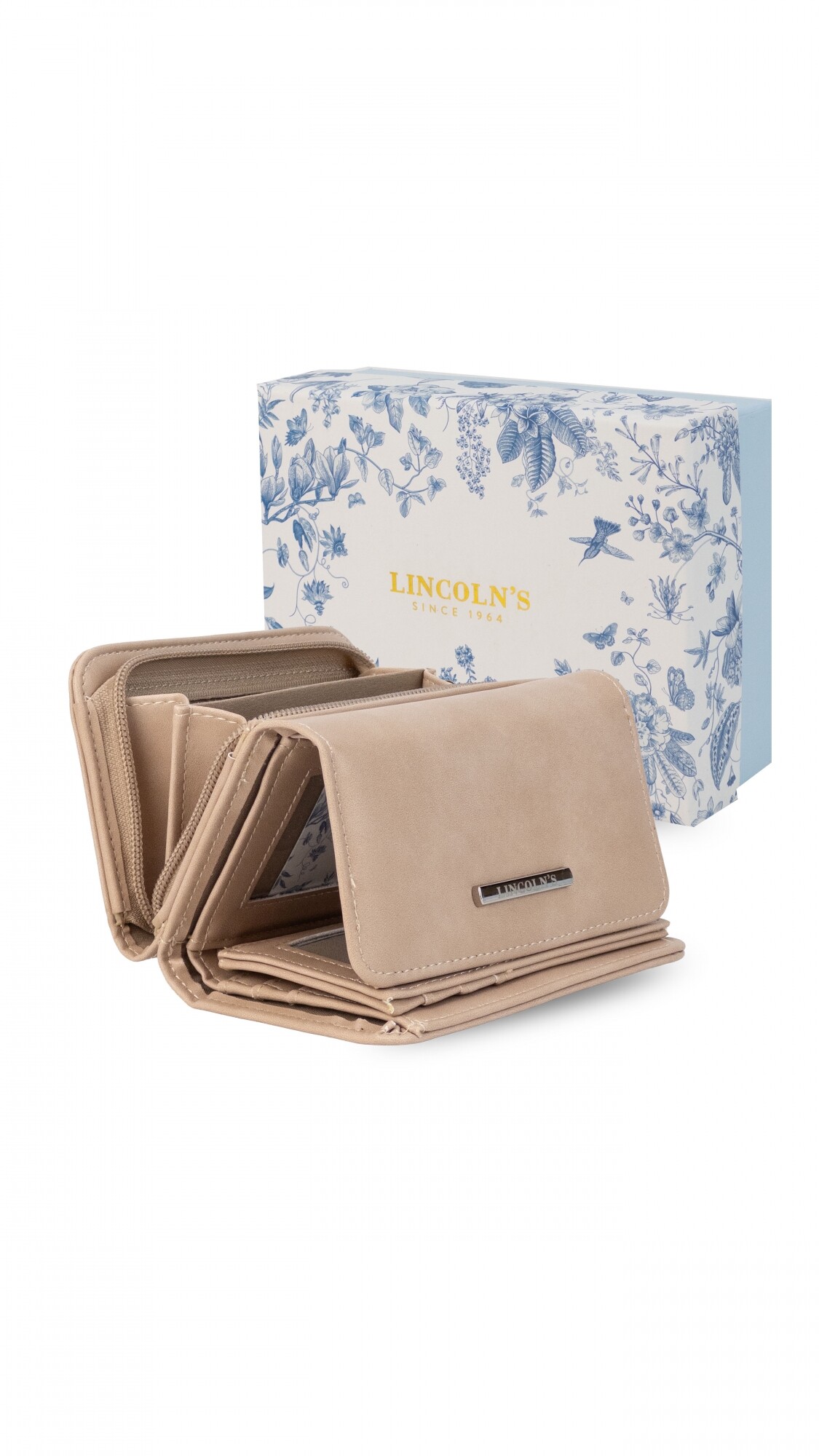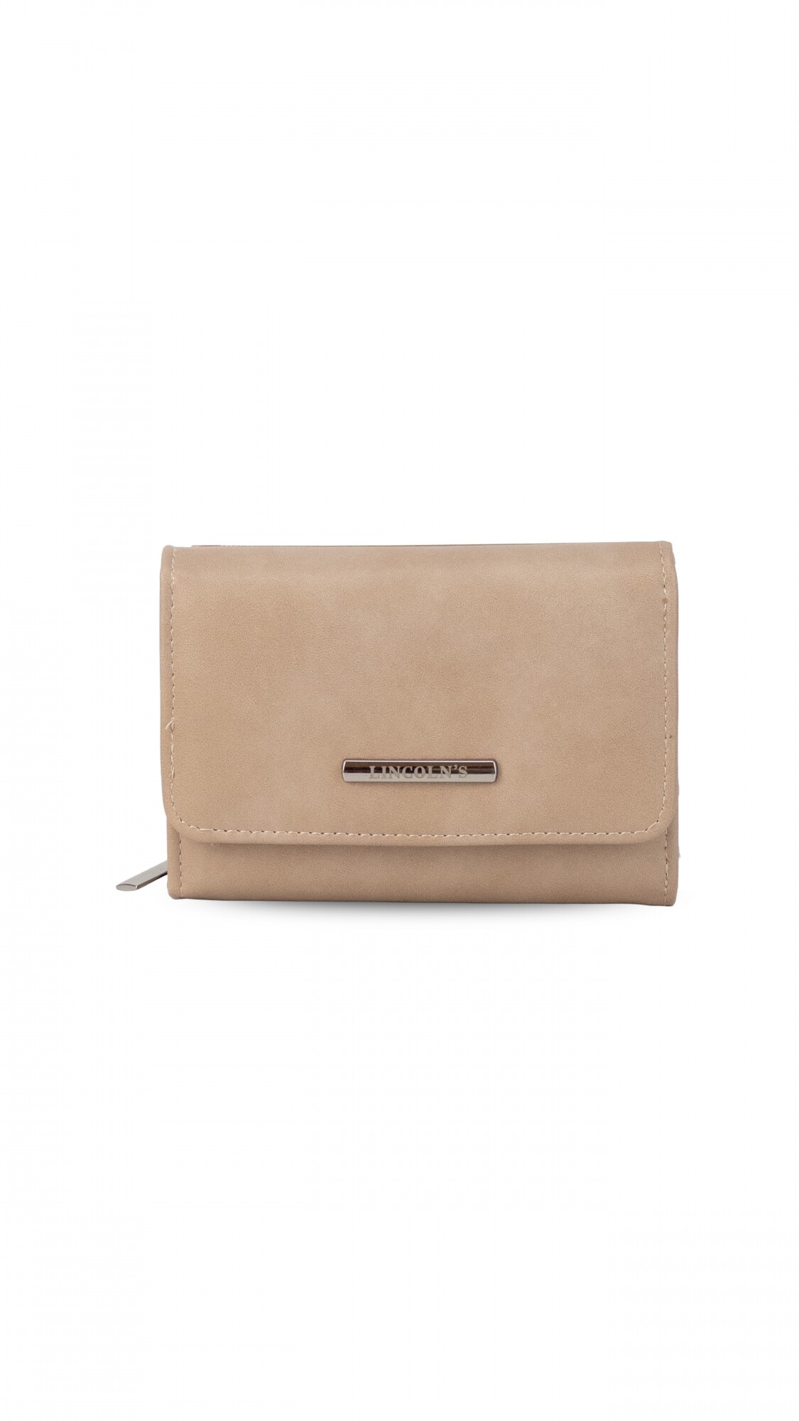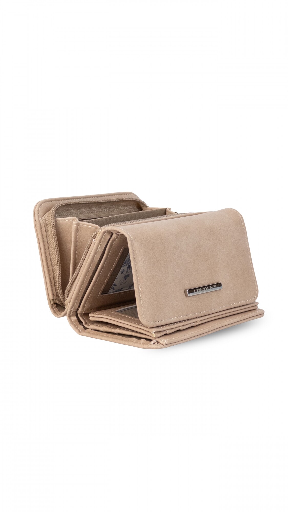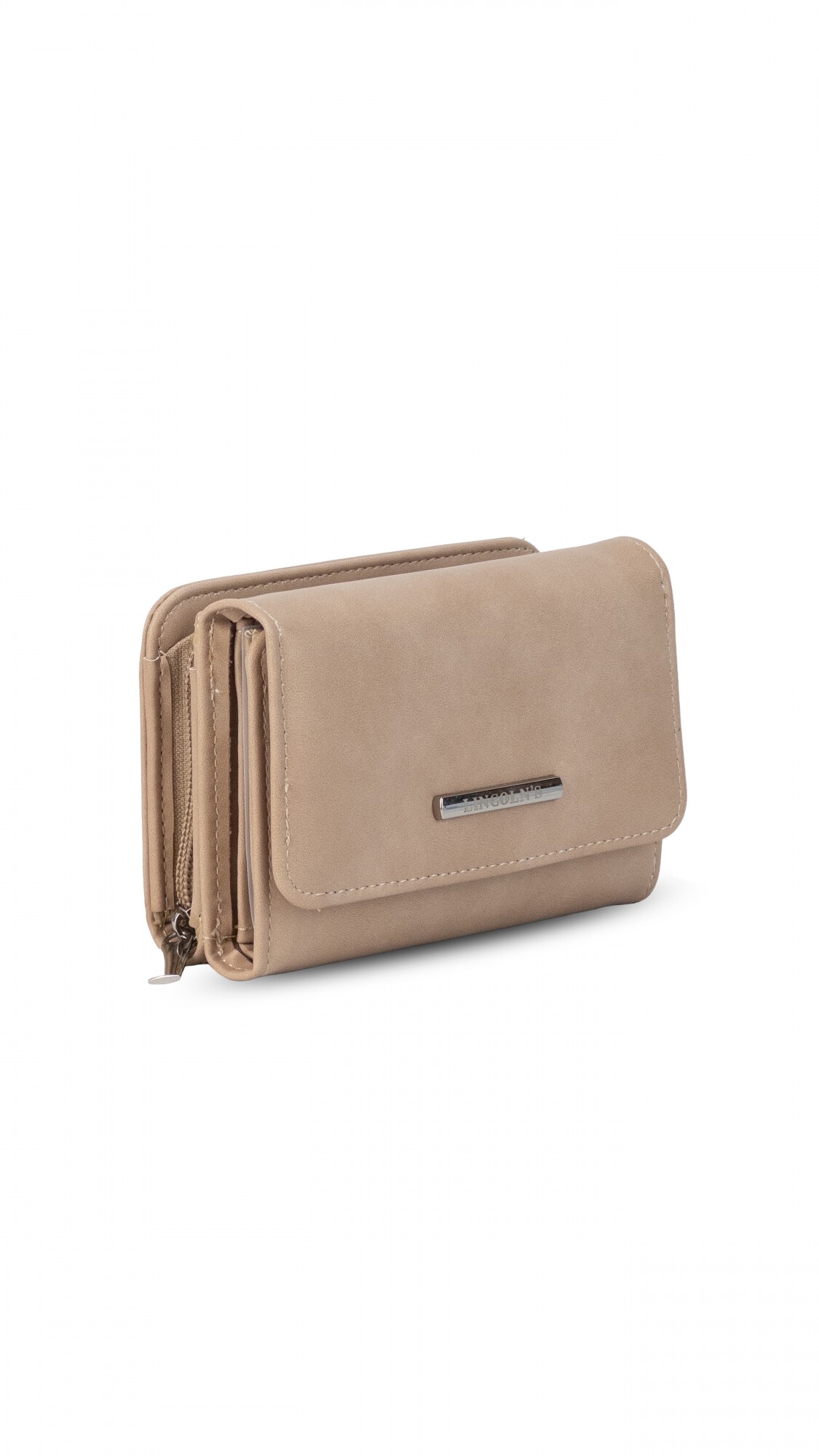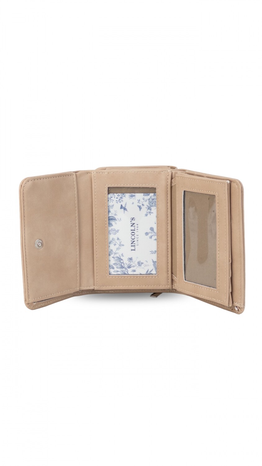 Billetera mediana con broche a presión. Interior con volante, tarjeteros, visores, bolsillos y repartición para billetes. Compartimento posterior con cierre y dos divisiones internas.