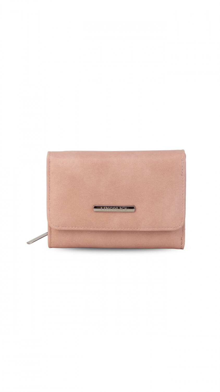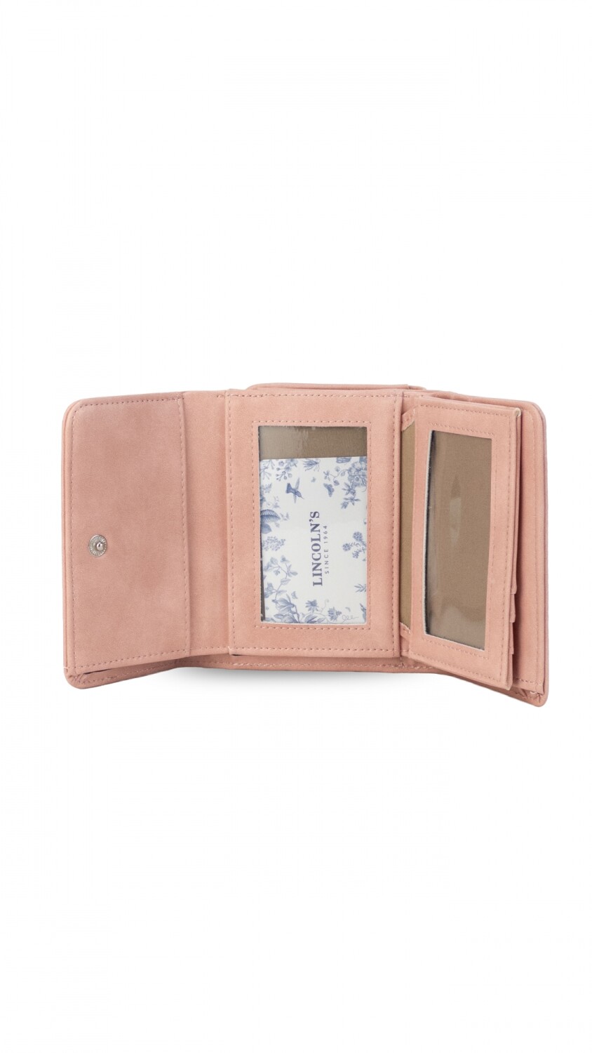 Billetera mediana con broche a presión. Interior con volante, tarjeteros, visores, bolsillos y repartición para billetes. Compartimento posterior con cierre y dos divisiones internas.