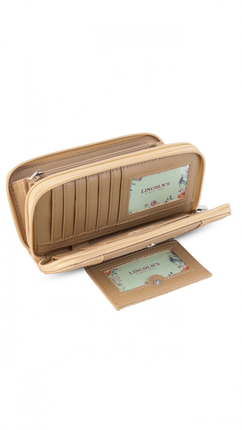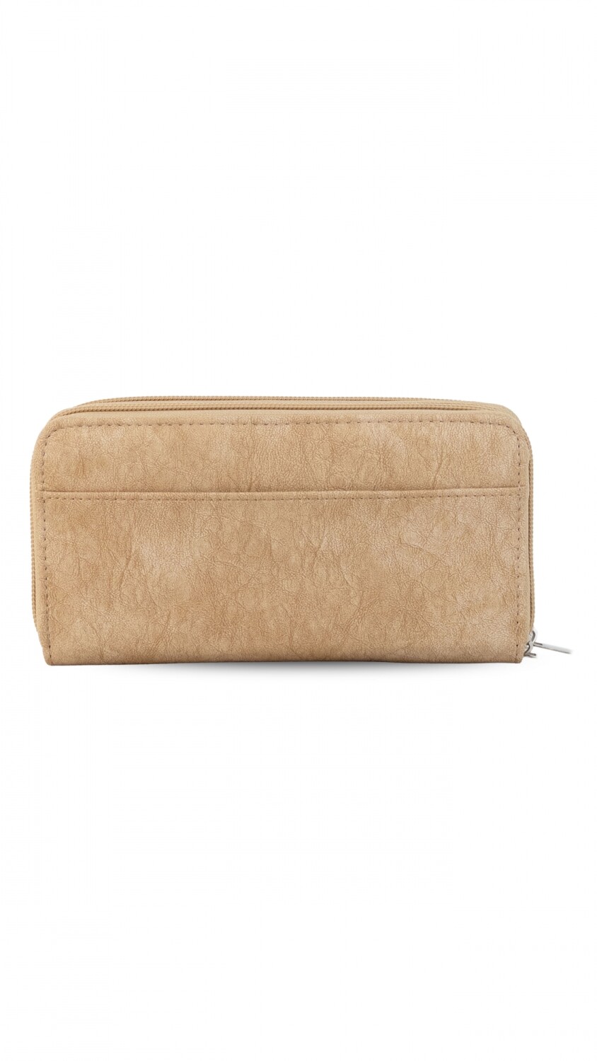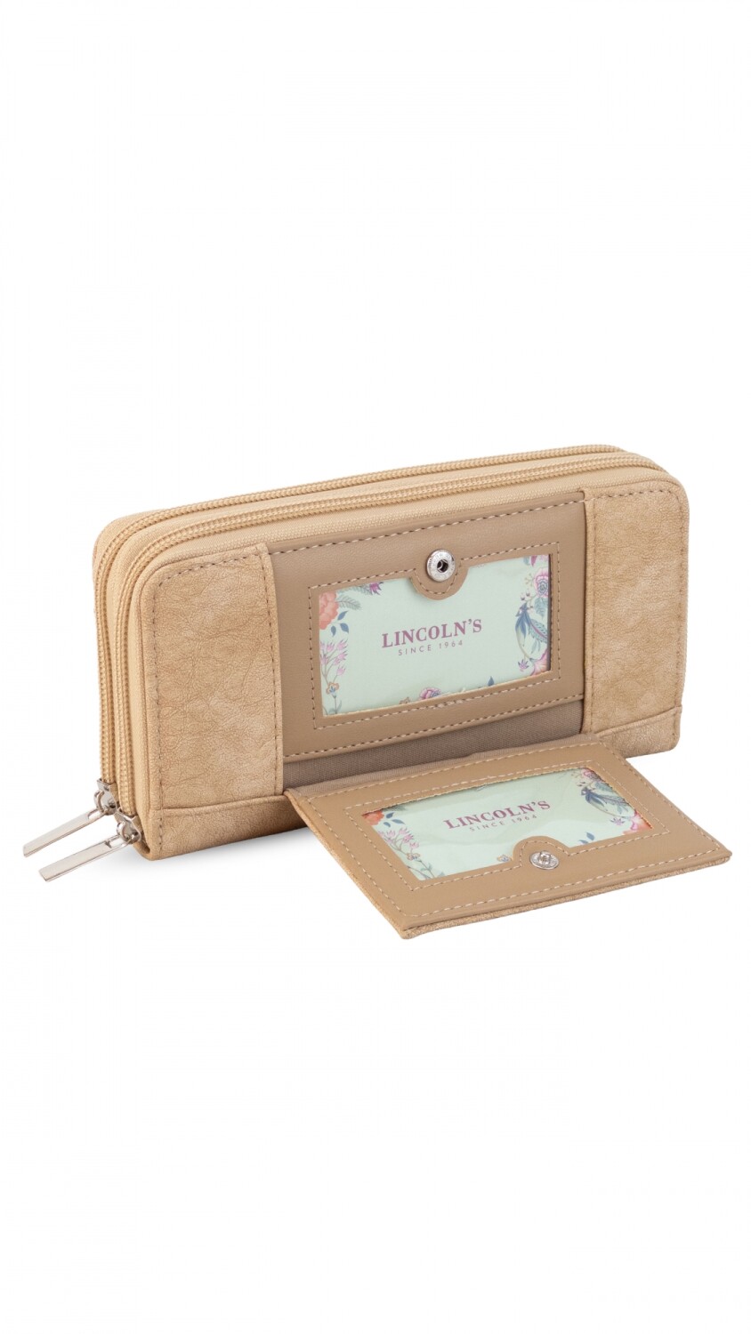 Billetera larga con dos reparticiones y cierre. Solapa con broche a presión y visor al frente. Compartimento frontal con tarjeteros, visor, bolsillos y repartición para billetes. Compartimento posterior incluye monedero con cierre, tarjeteros y bolsillos.