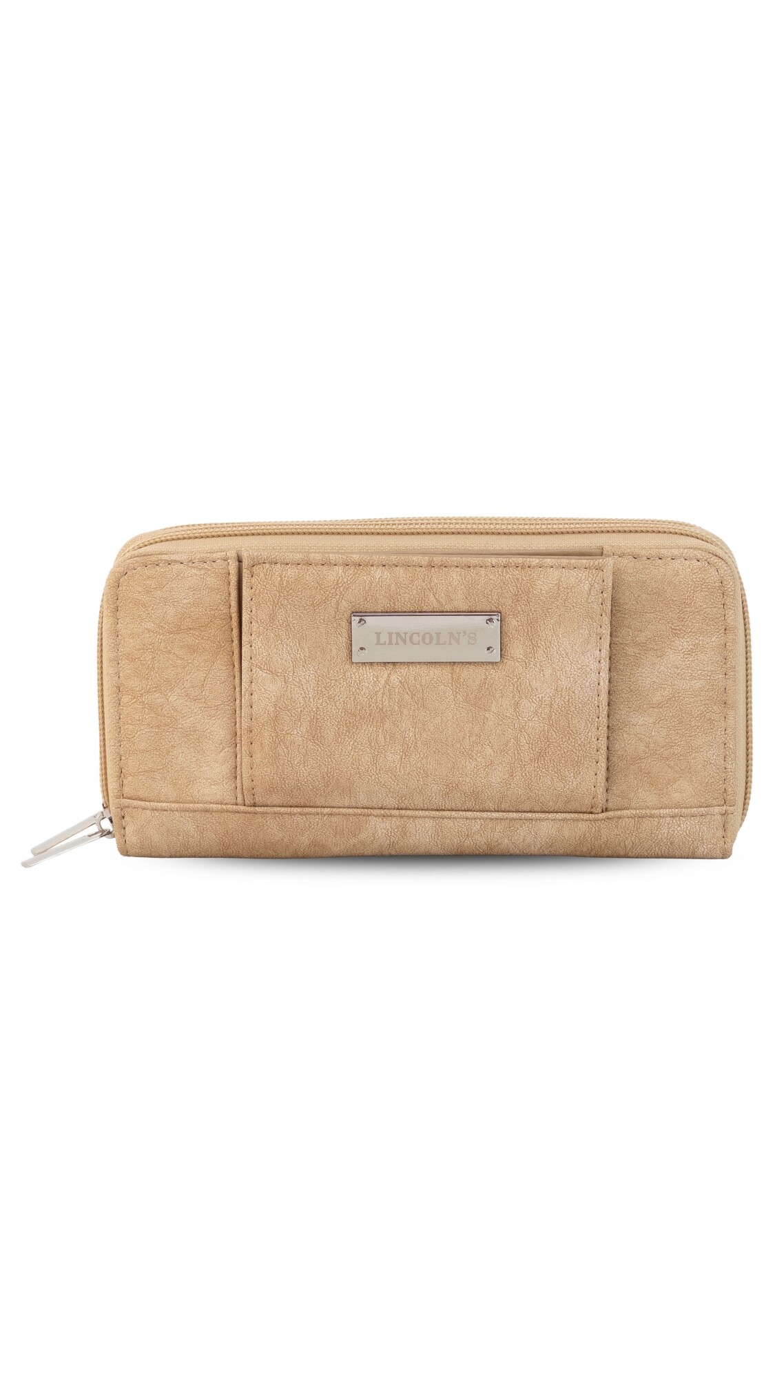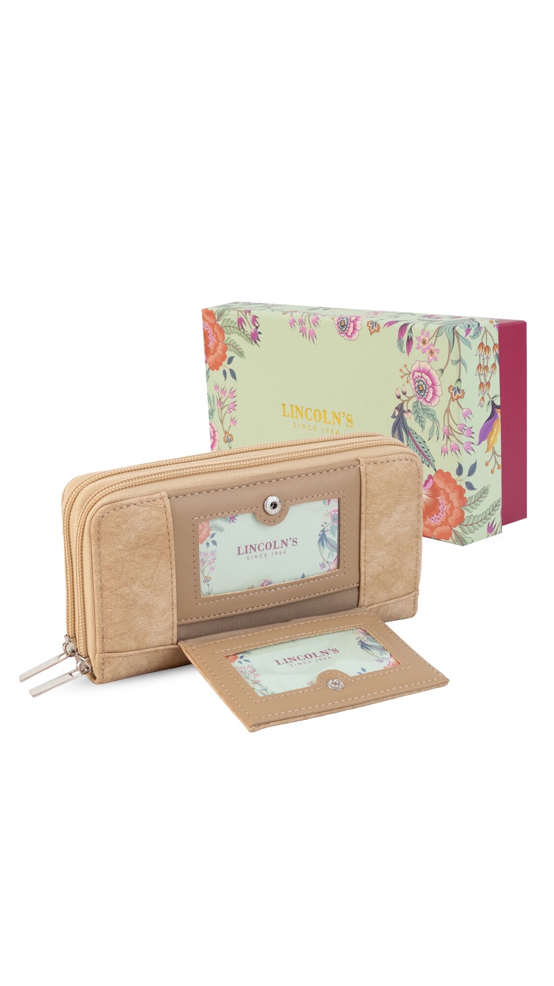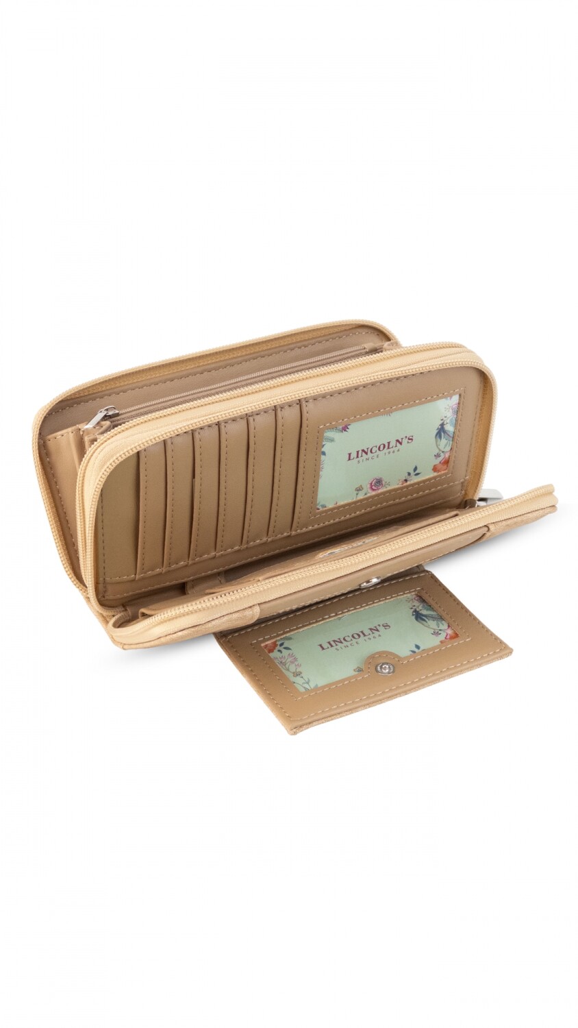 Billetera larga con dos reparticiones y cierre. Solapa con broche a presión y visor al frente. Compartimento frontal con tarjeteros, visor, bolsillos y repartición para billetes. Compartimento posterior incluye monedero con cierre, tarjeteros y bolsillos.
