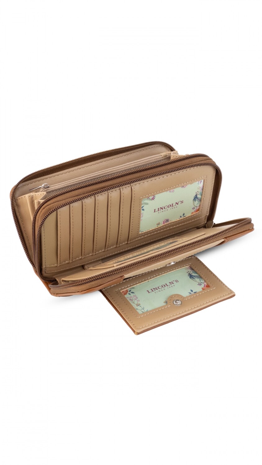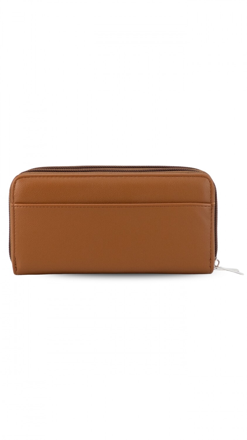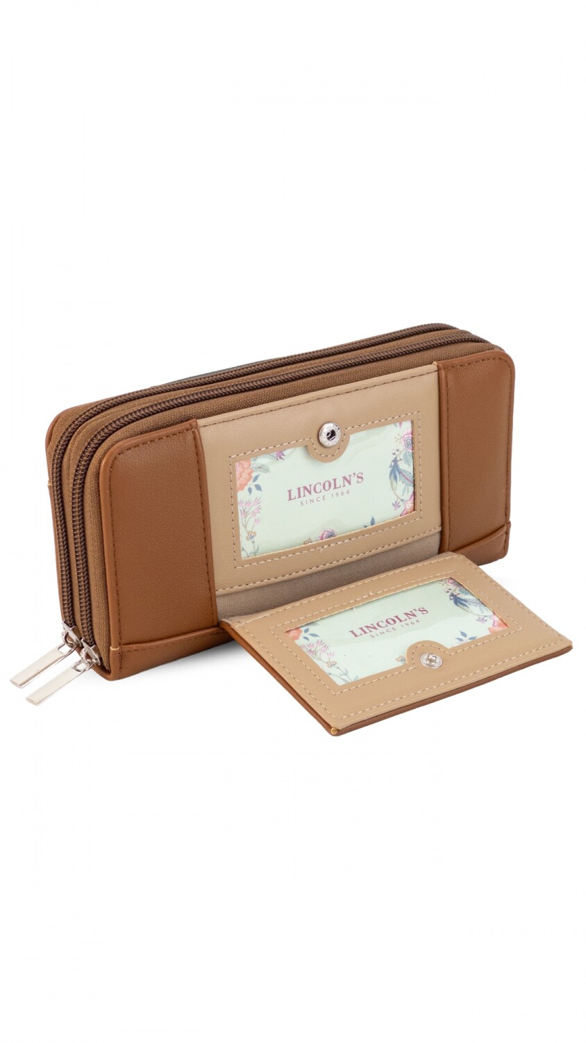 Billetera larga con dos reparticiones y cierre. Solapa con broche a presión y visor al frente. Compartimento frontal con tarjeteros, visor, bolsillos y repartición para billetes. Compartimento posterior incluye monedero con cierre, tarjeteros y bolsillos.