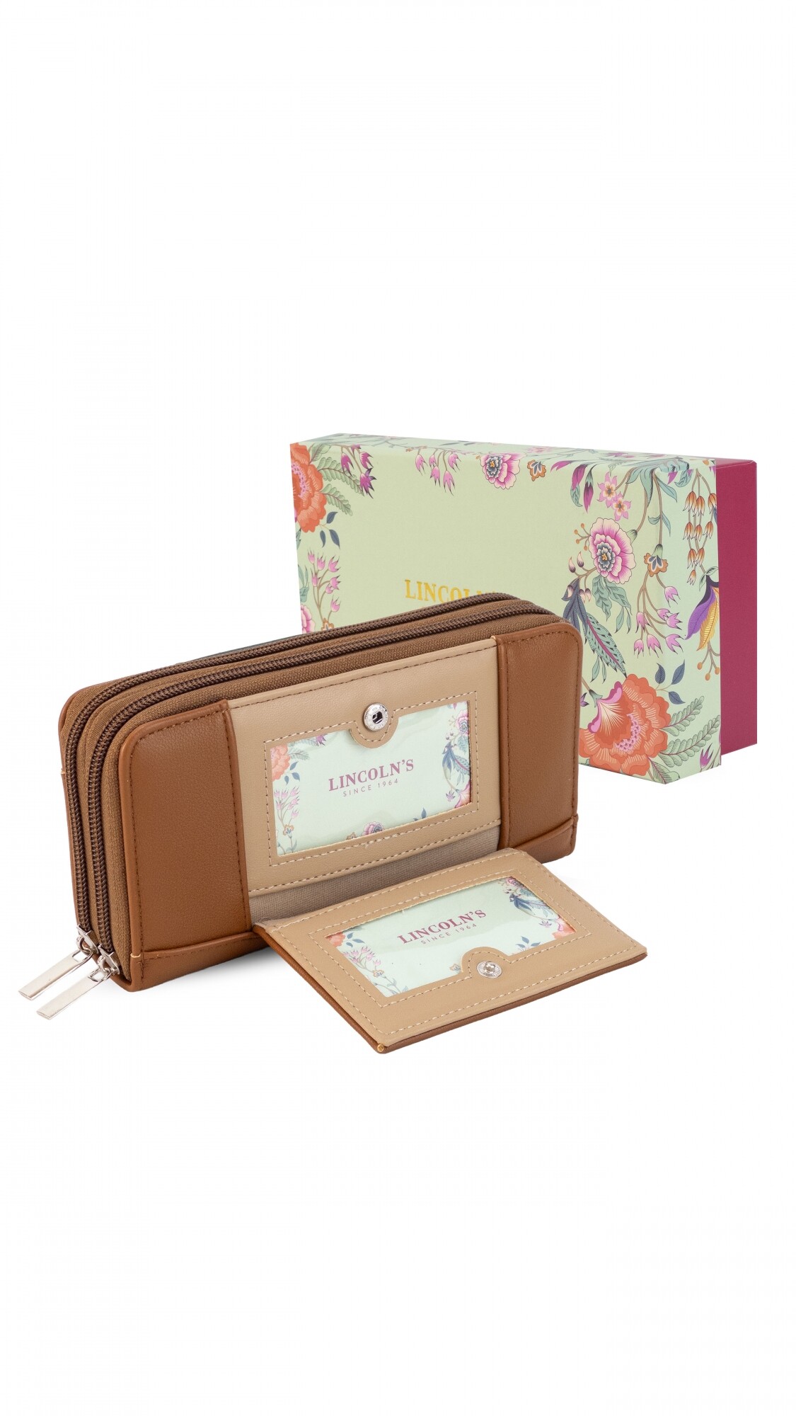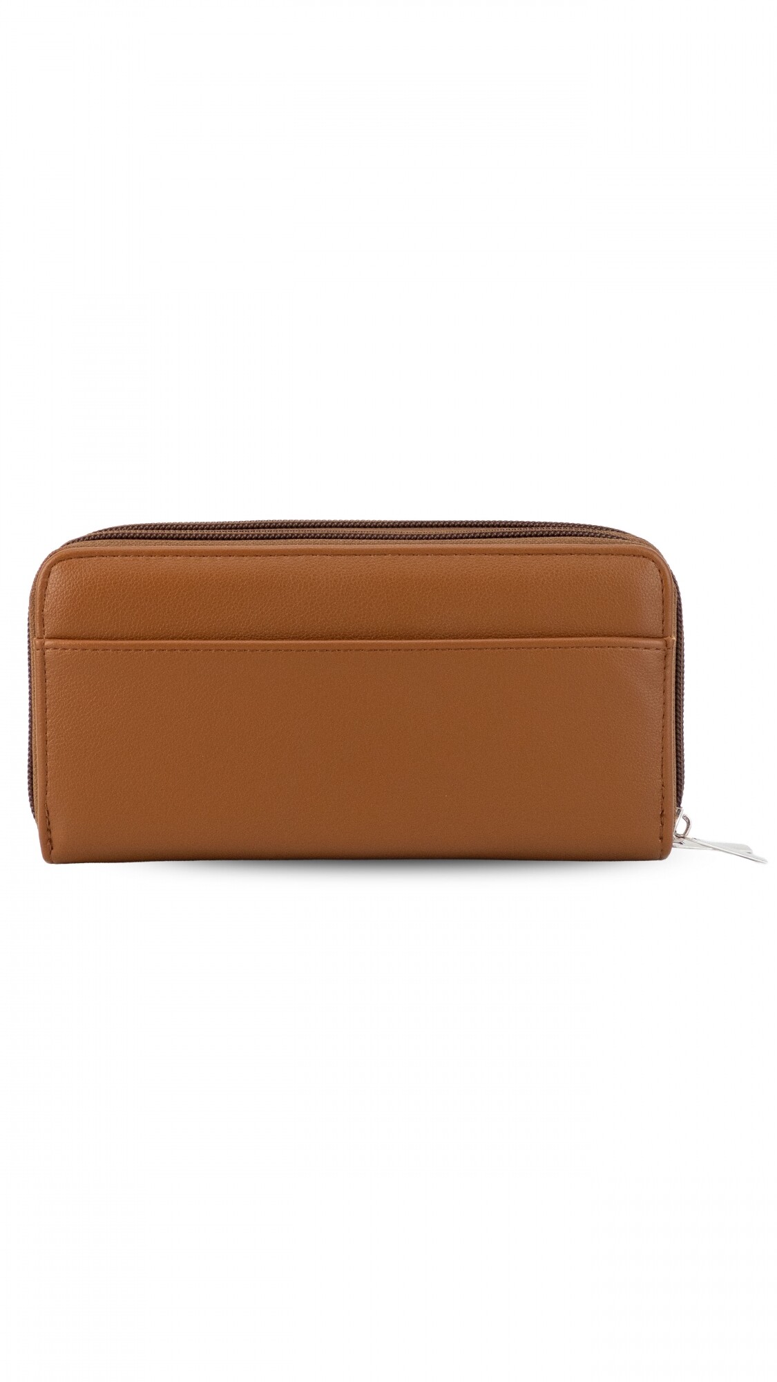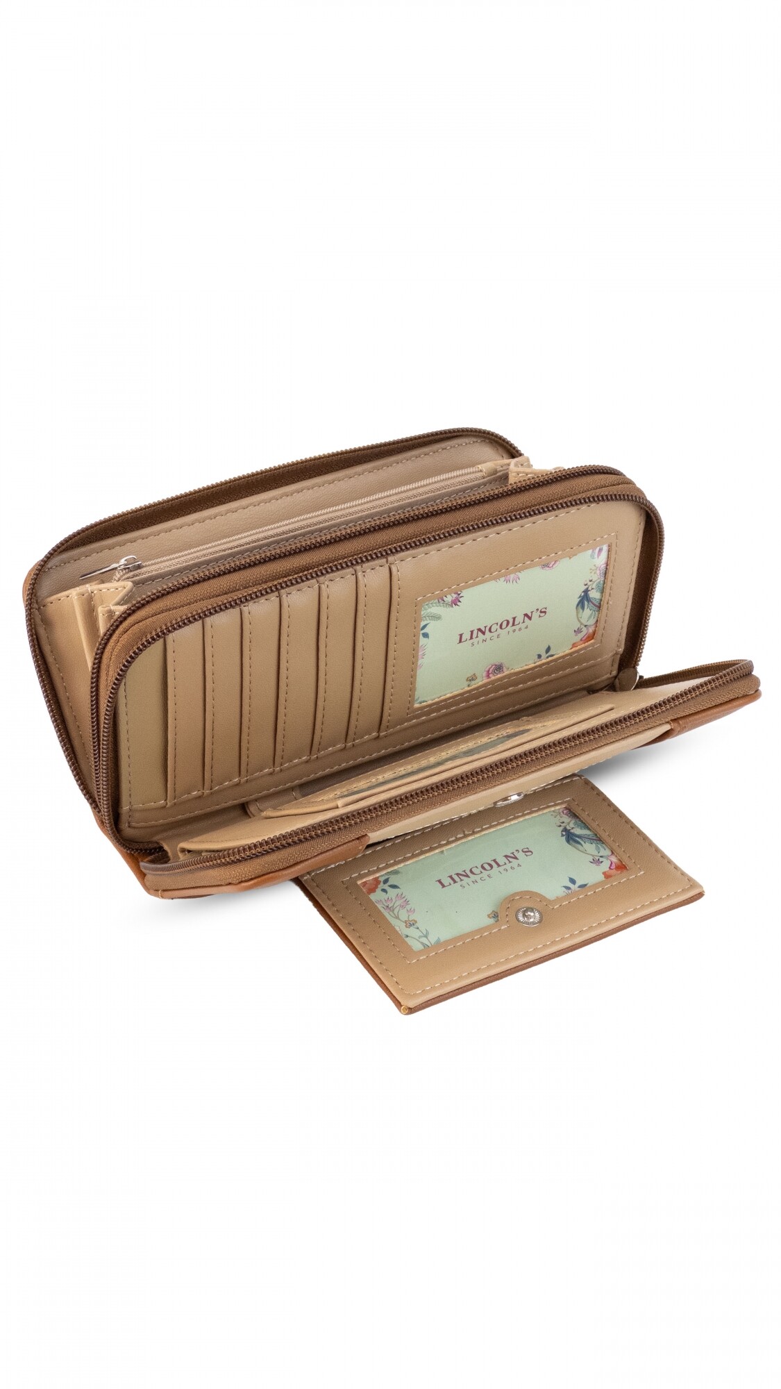 Billetera larga con dos reparticiones y cierre. Solapa con broche a presión y visor al frente. Compartimento frontal con tarjeteros, visor, bolsillos y repartición para billetes. Compartimento posterior incluye monedero con cierre, tarjeteros y bolsillos.