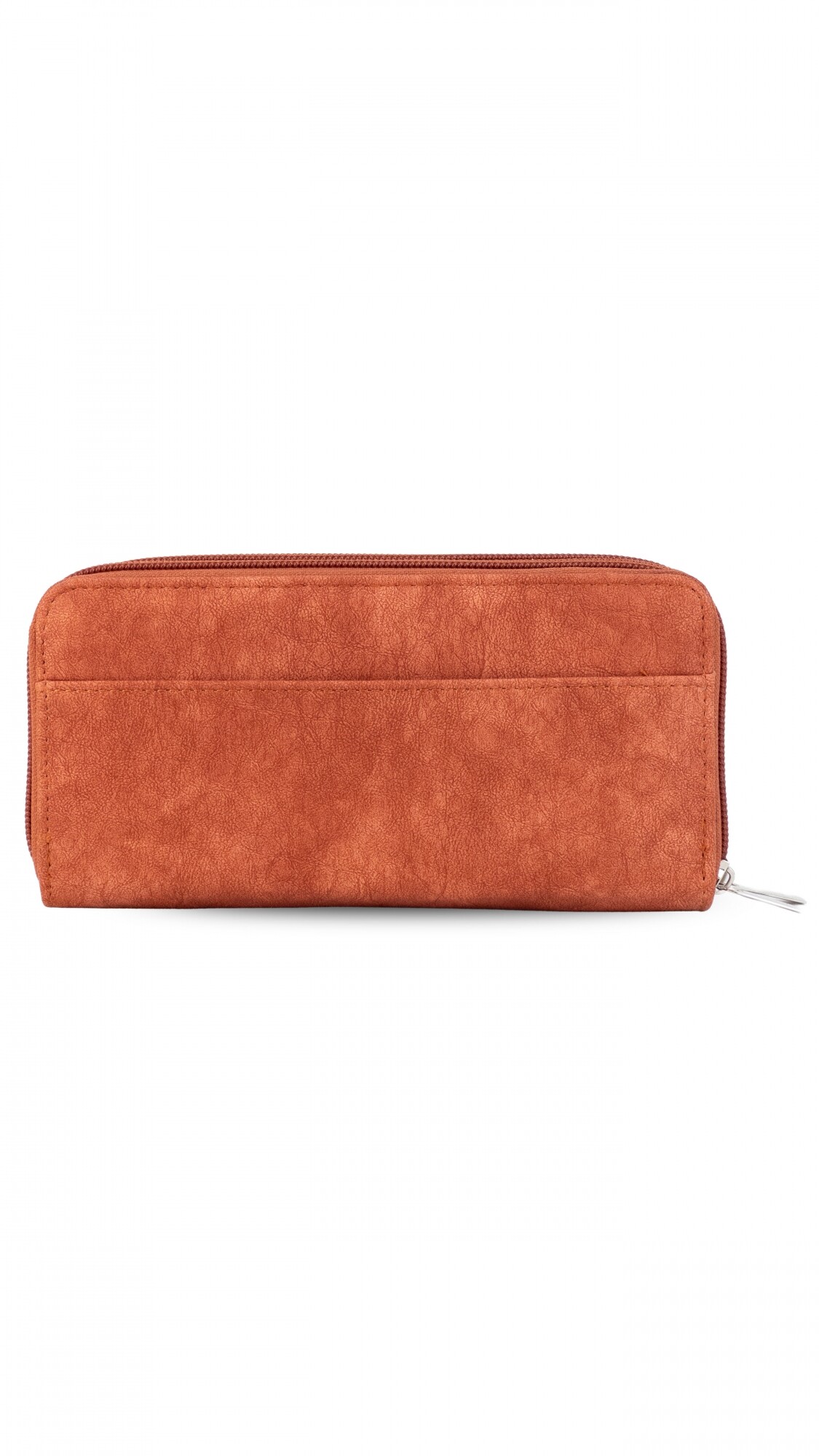 Billetera larga con dos reparticiones y cierre. Solapa con broche a presión y visor al frente. Compartimento frontal con tarjeteros, visor, bolsillos y repartición para billetes. Compartimento posterior incluye monedero con cierre, tarjeteros y bolsillos.