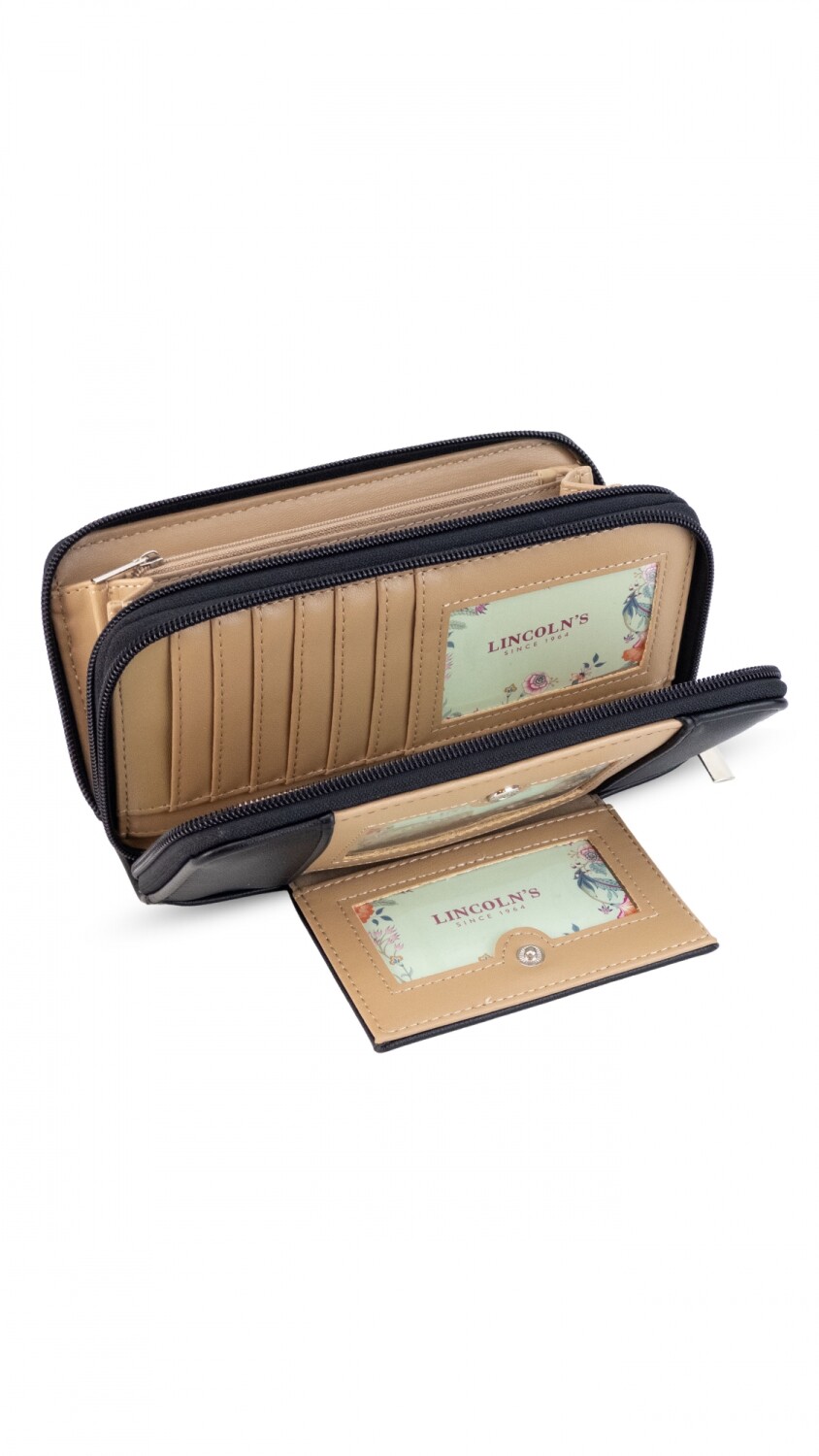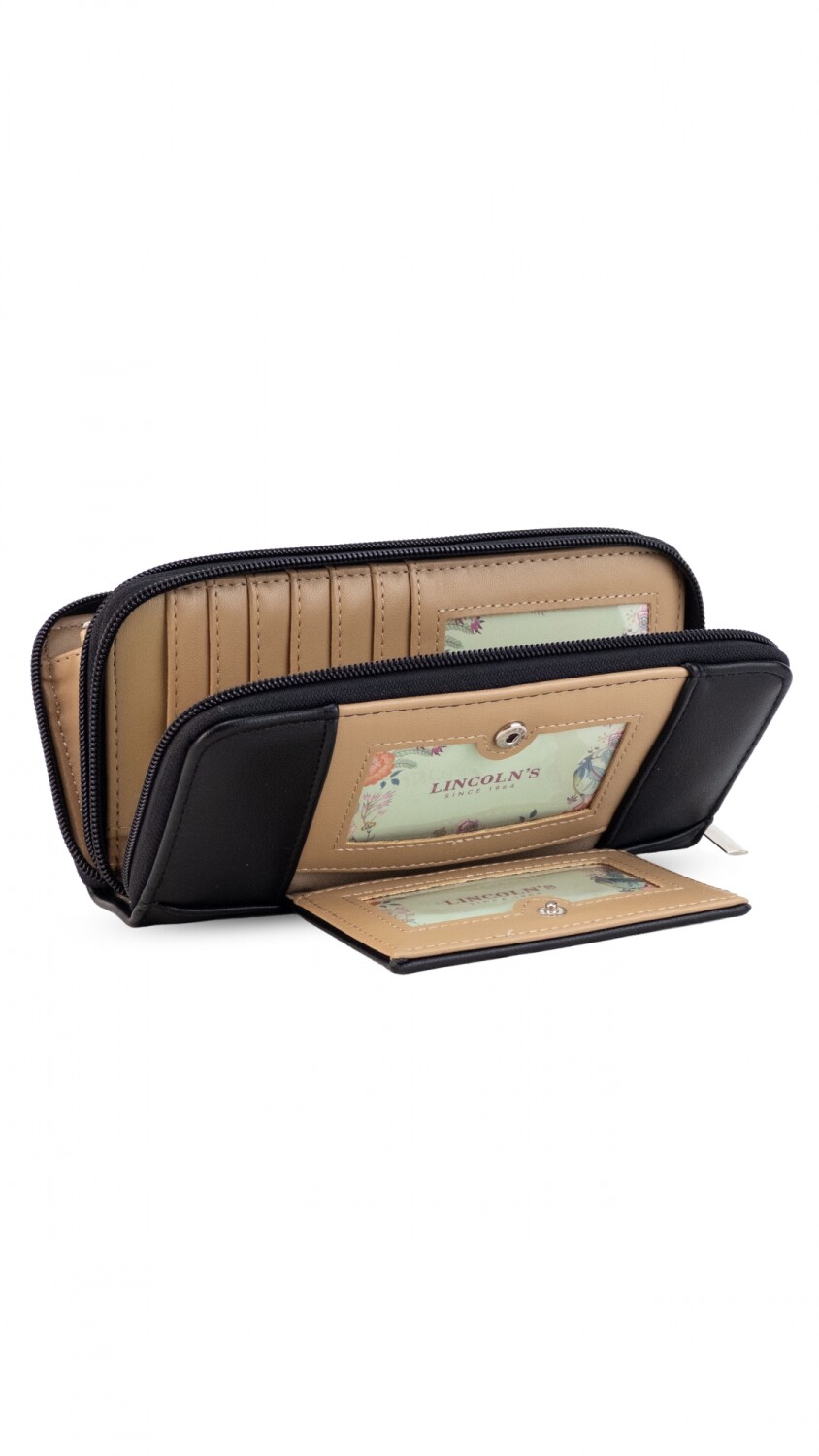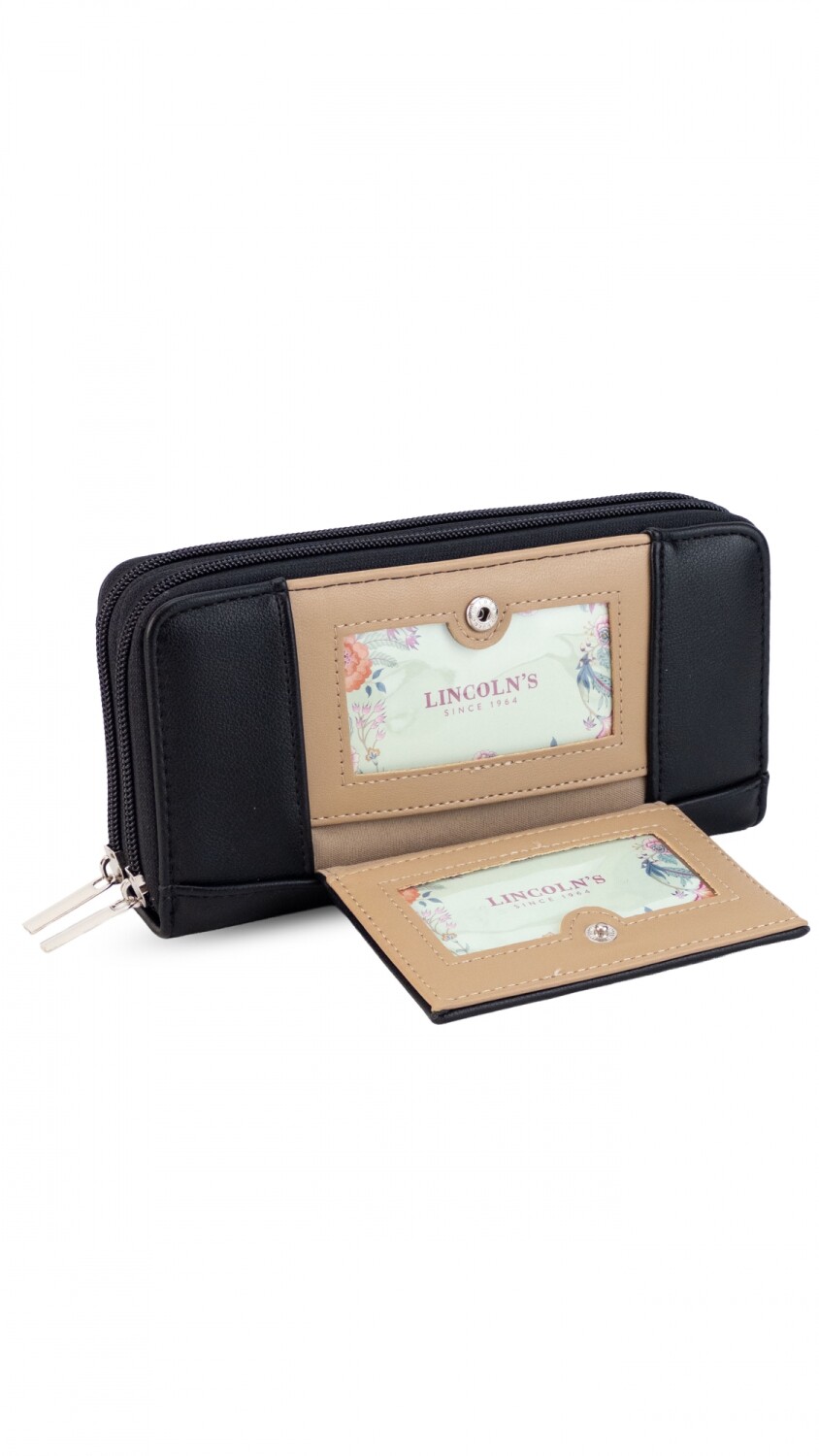 Billetera larga con dos reparticiones y cierre. Solapa con broche a presión y visor al frente. Compartimento frontal con tarjeteros, visor, bolsillos y repartición para billetes. Compartimento posterior incluye monedero con cierre, tarjeteros y bolsillos.