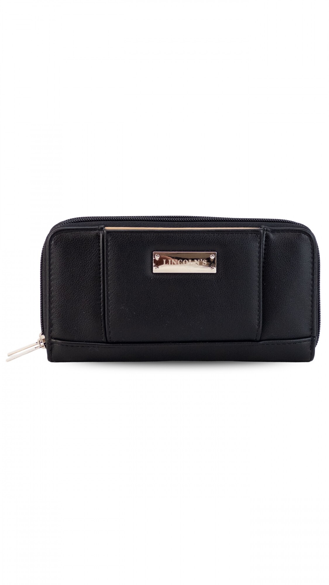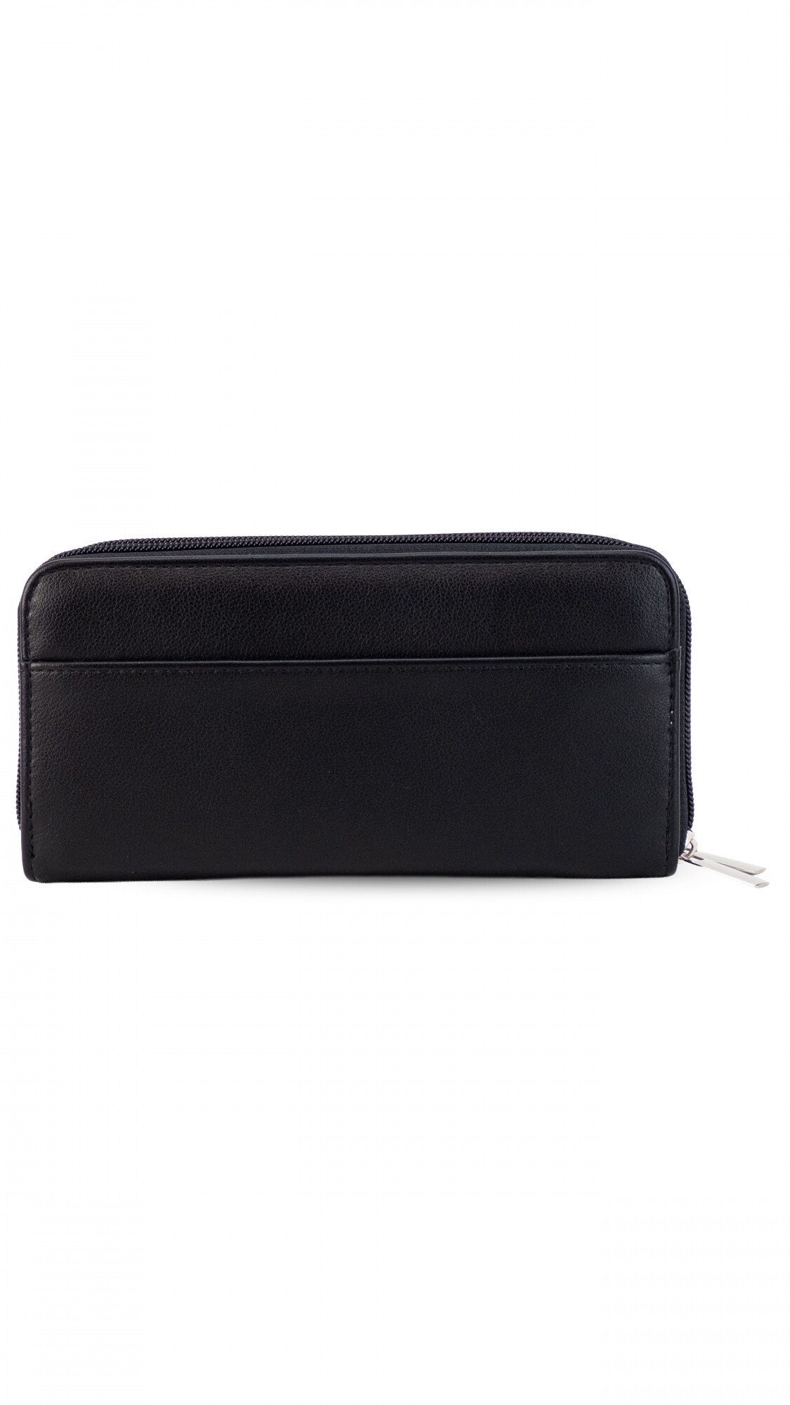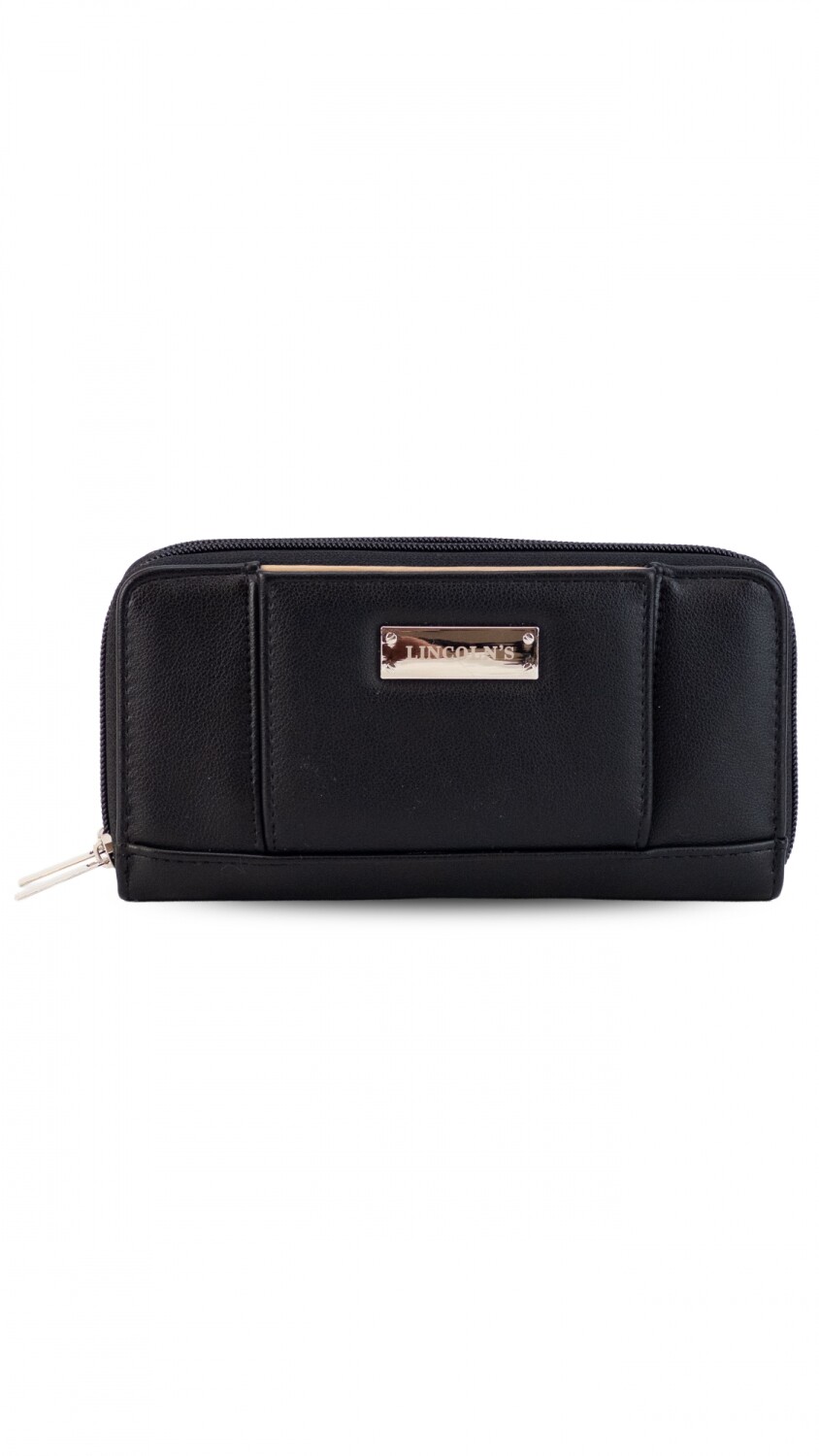 Billetera larga con dos reparticiones y cierre. Solapa con broche a presión y visor al frente. Compartimento frontal con tarjeteros, visor, bolsillos y repartición para billetes. Compartimento posterior incluye monedero con cierre, tarjeteros y bolsillos.