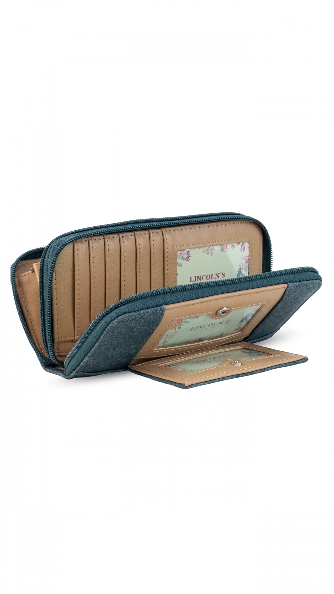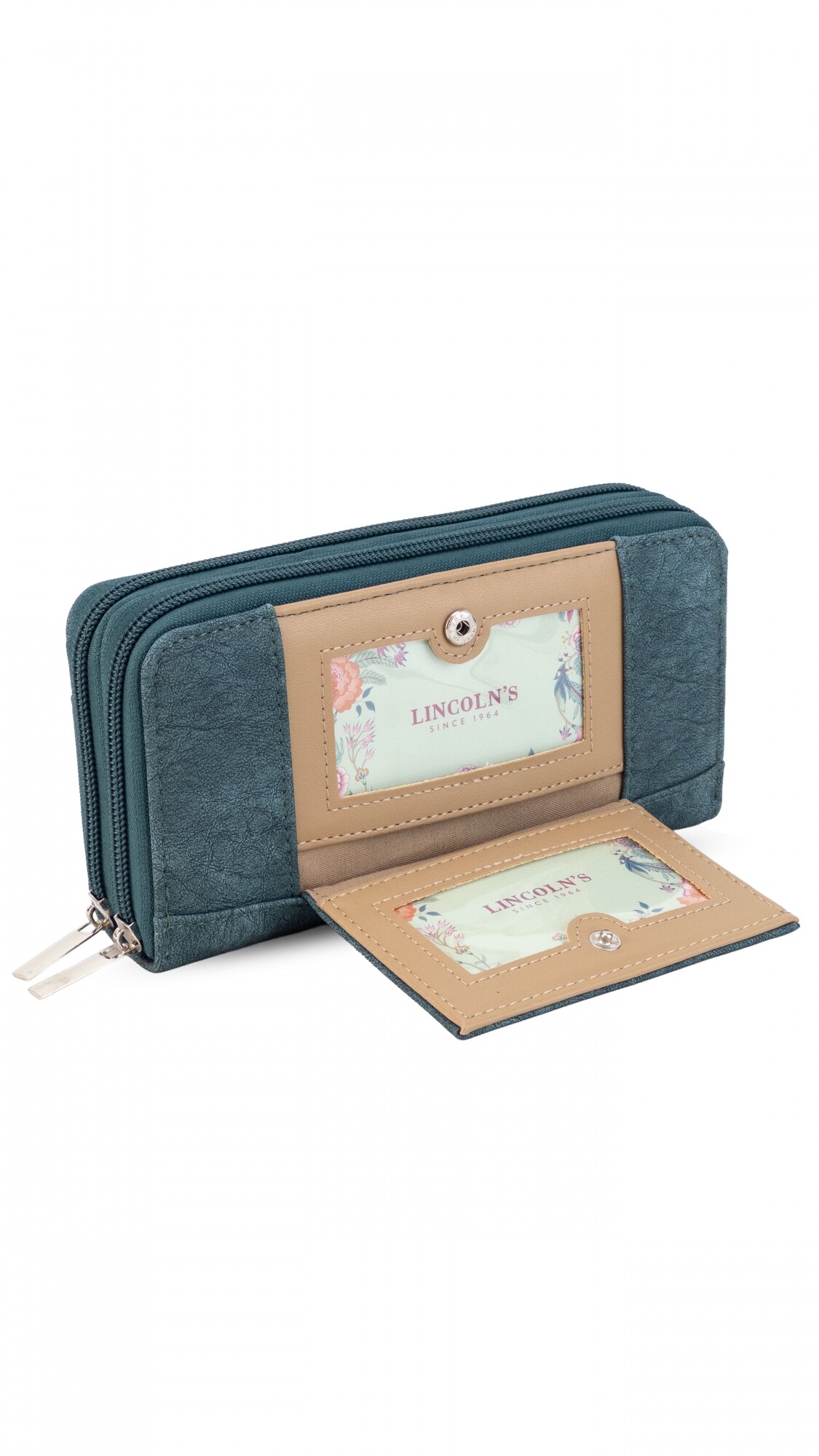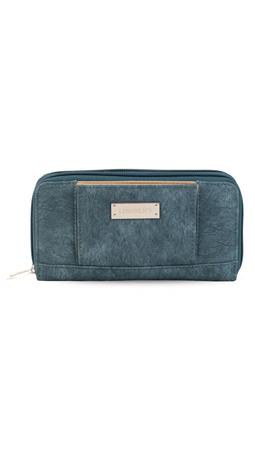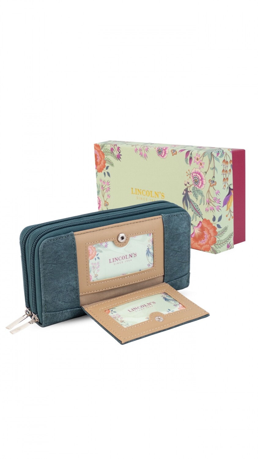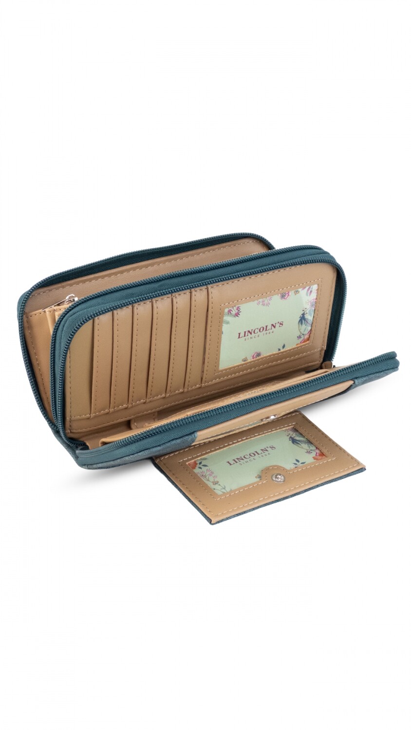 Billetera larga con dos reparticiones y cierre. Solapa con broche a presión y visor al frente. Compartimento frontal con tarjeteros, visor, bolsillos y repartición para billetes. Compartimento posterior incluye monedero con cierre, tarjeteros y bolsillos.