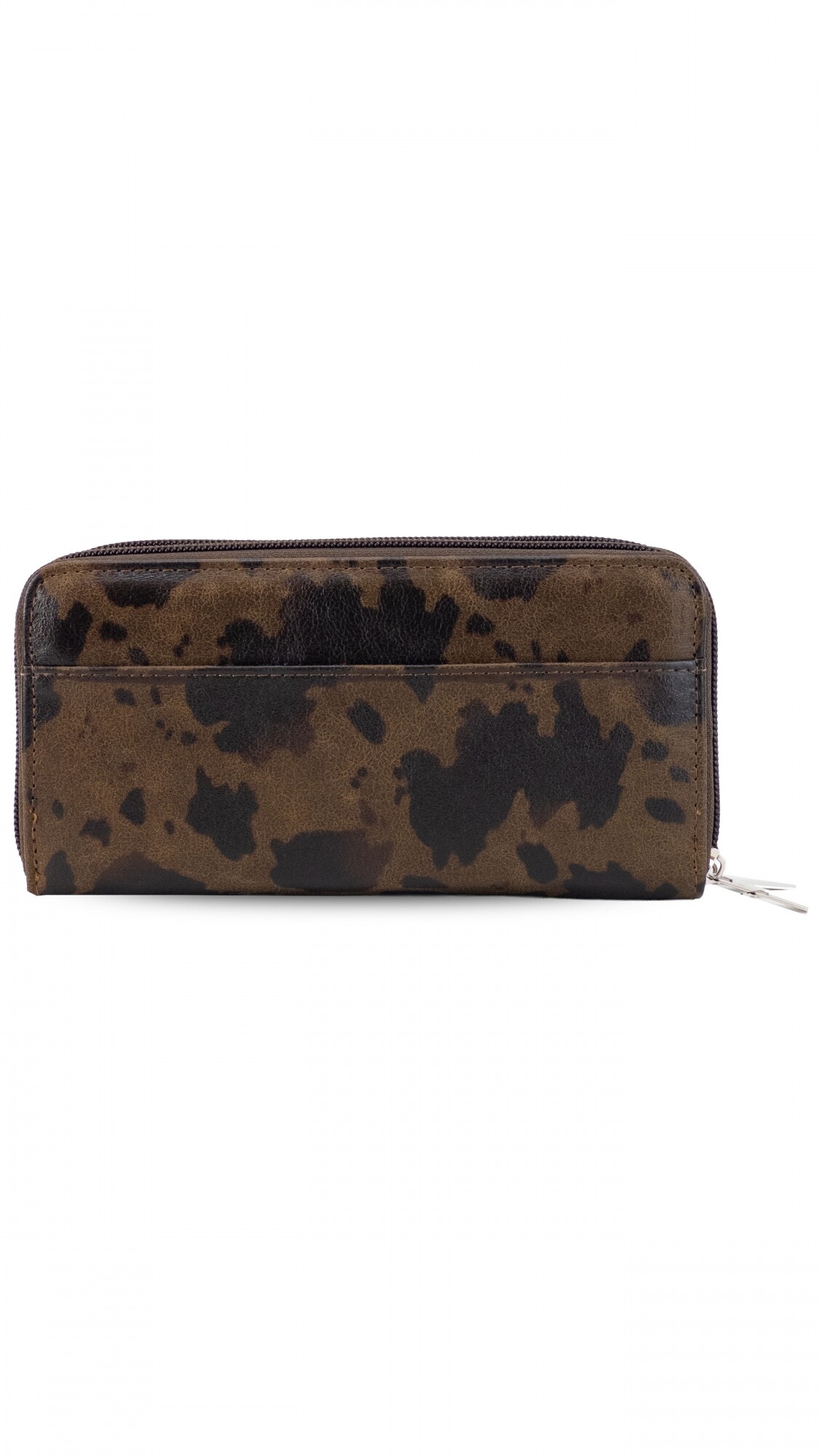 Billetera larga con dos reparticiones y cierre. Solapa con broche a presión y visor al frente. Compartimento frontal con tarjeteros, visor, bolsillos y repartición para billetes. Compartimento posterior incluye monedero con cierre, tarjeteros y bolsillos.