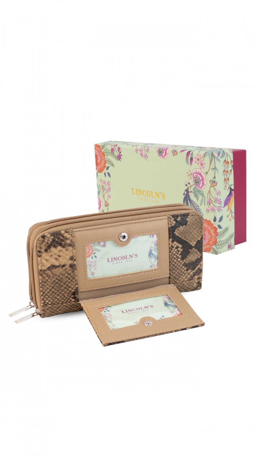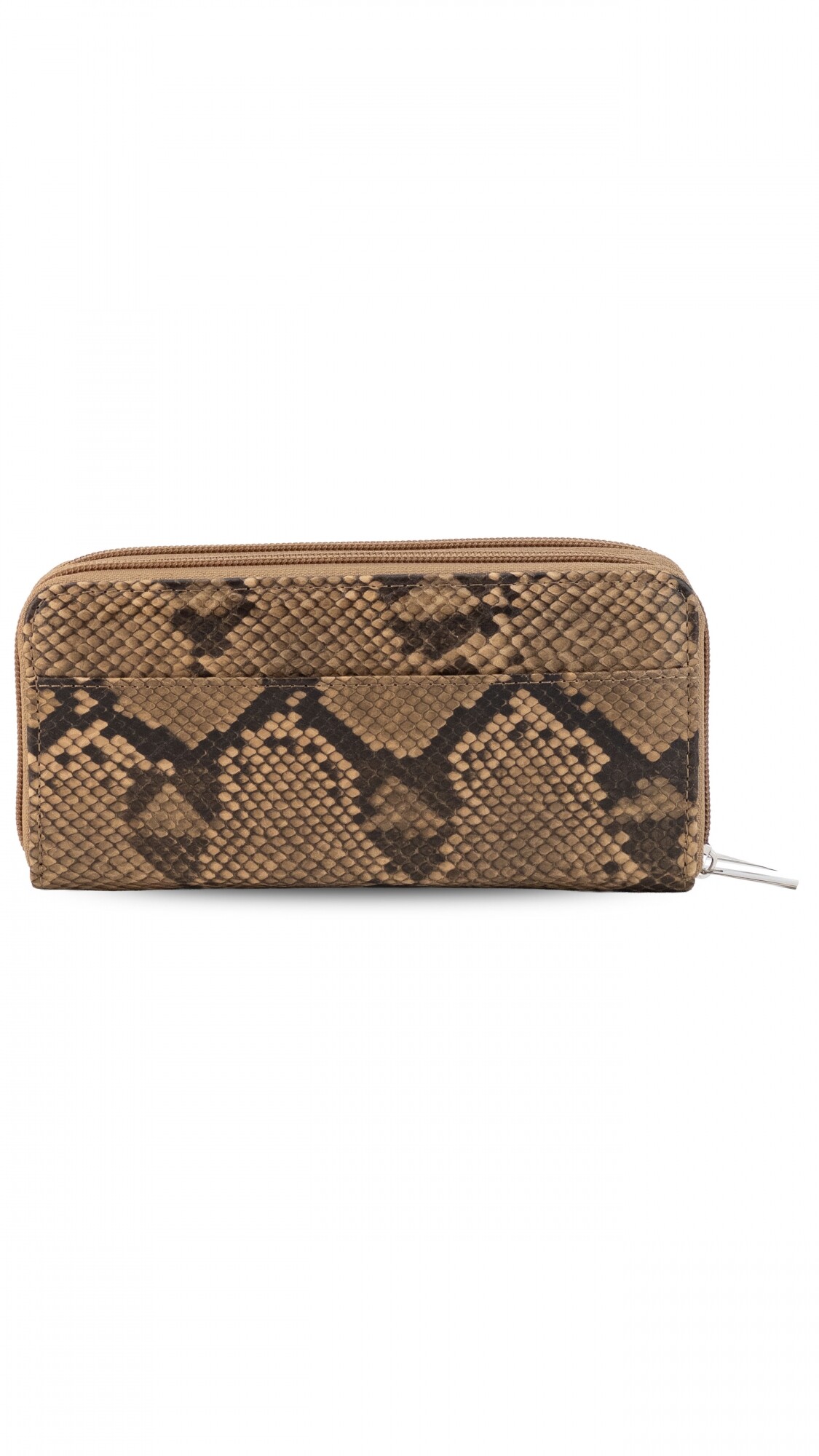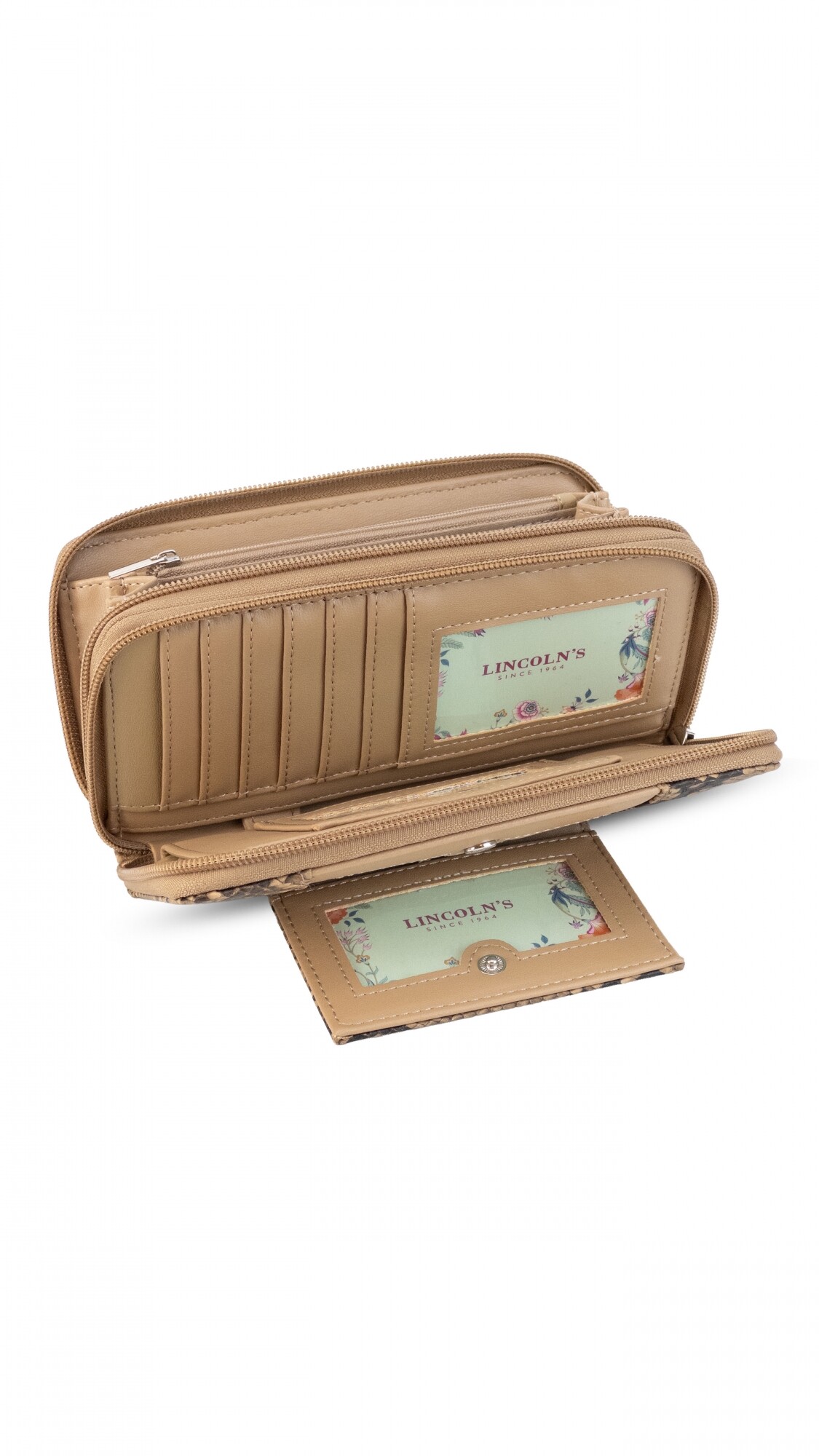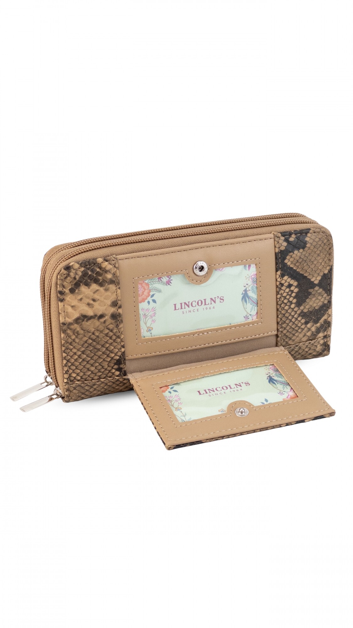 Billetera larga con dos reparticiones y cierre. Solapa con broche a presión y visor al frente. Compartimento frontal con tarjeteros, visor, bolsillos y repartición para billetes. Compartimento posterior incluye monedero con cierre, tarjeteros y bolsillos.