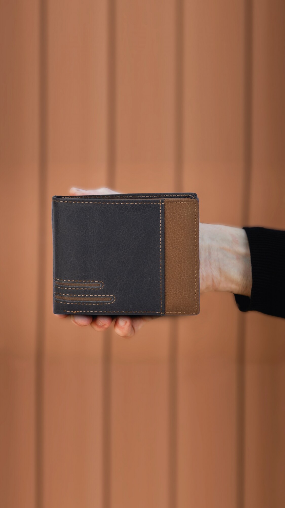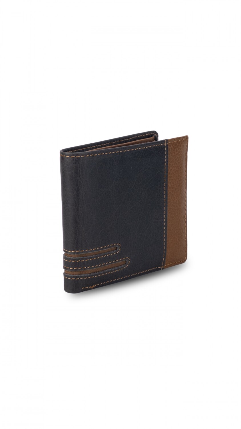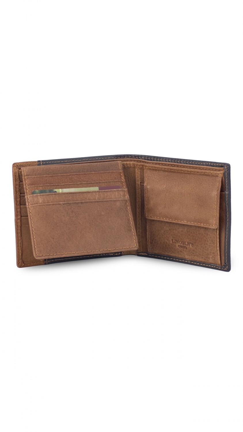 Billetera de hombre en cuero, con solapa superior y monedero con tapa y broche. cuenta con espacio para billetes y reparticiones para tarjetas.