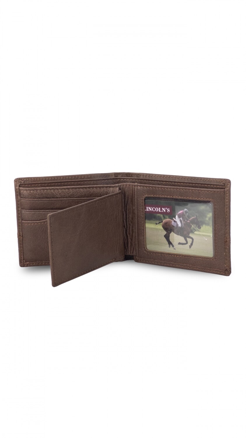 Billetera hombre en cuero, clásica con solapa al medio. incluye compartimiento para billetes y repartición para tarjetas mas visor.