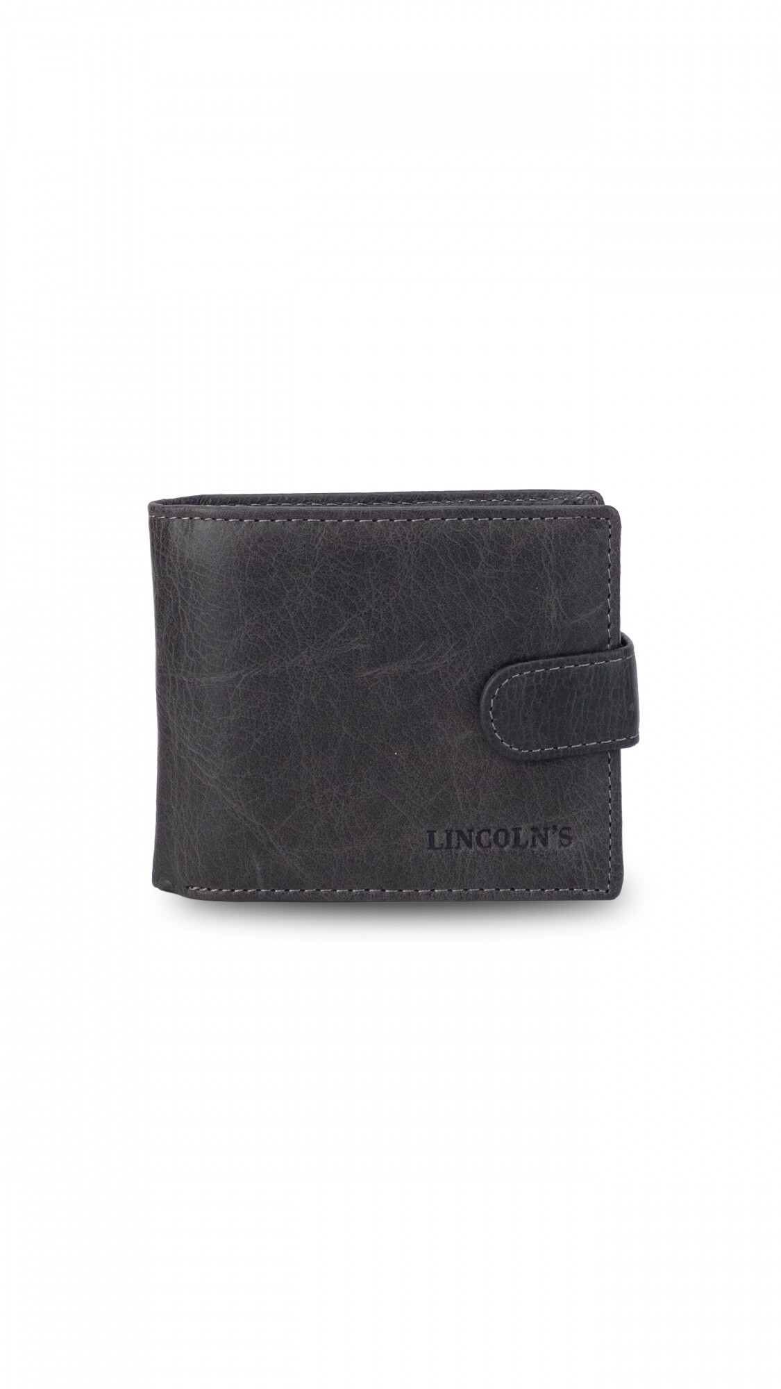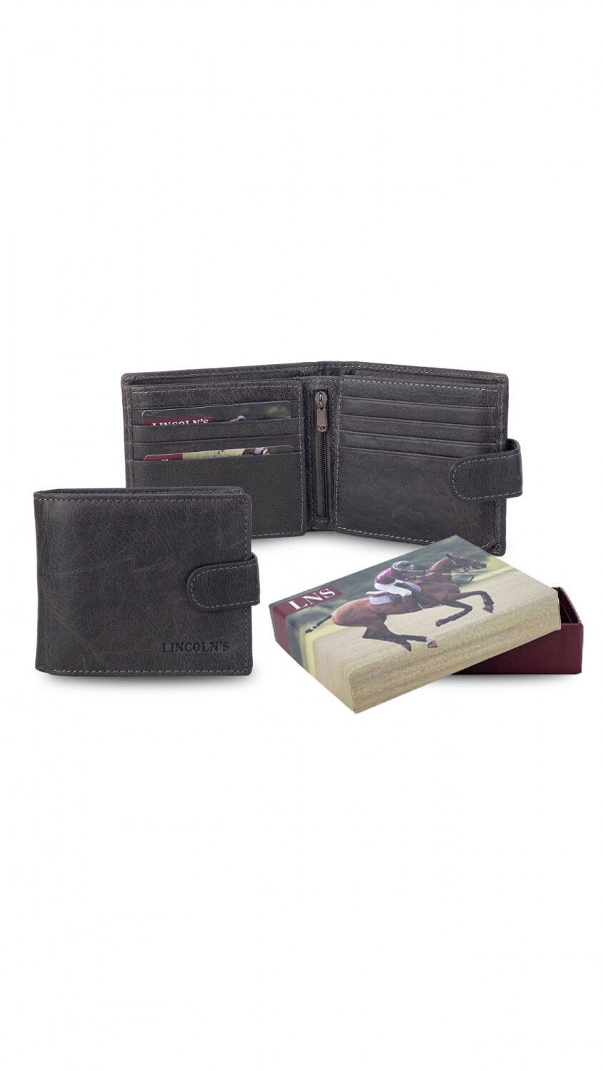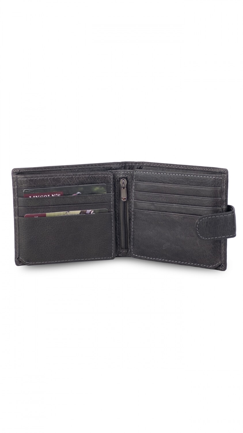 Billetera de Hombre en cuero, con cierre central para monedas y presilla con broche. Incluye varios espacios para tarjetas y compartimiento para billetes.