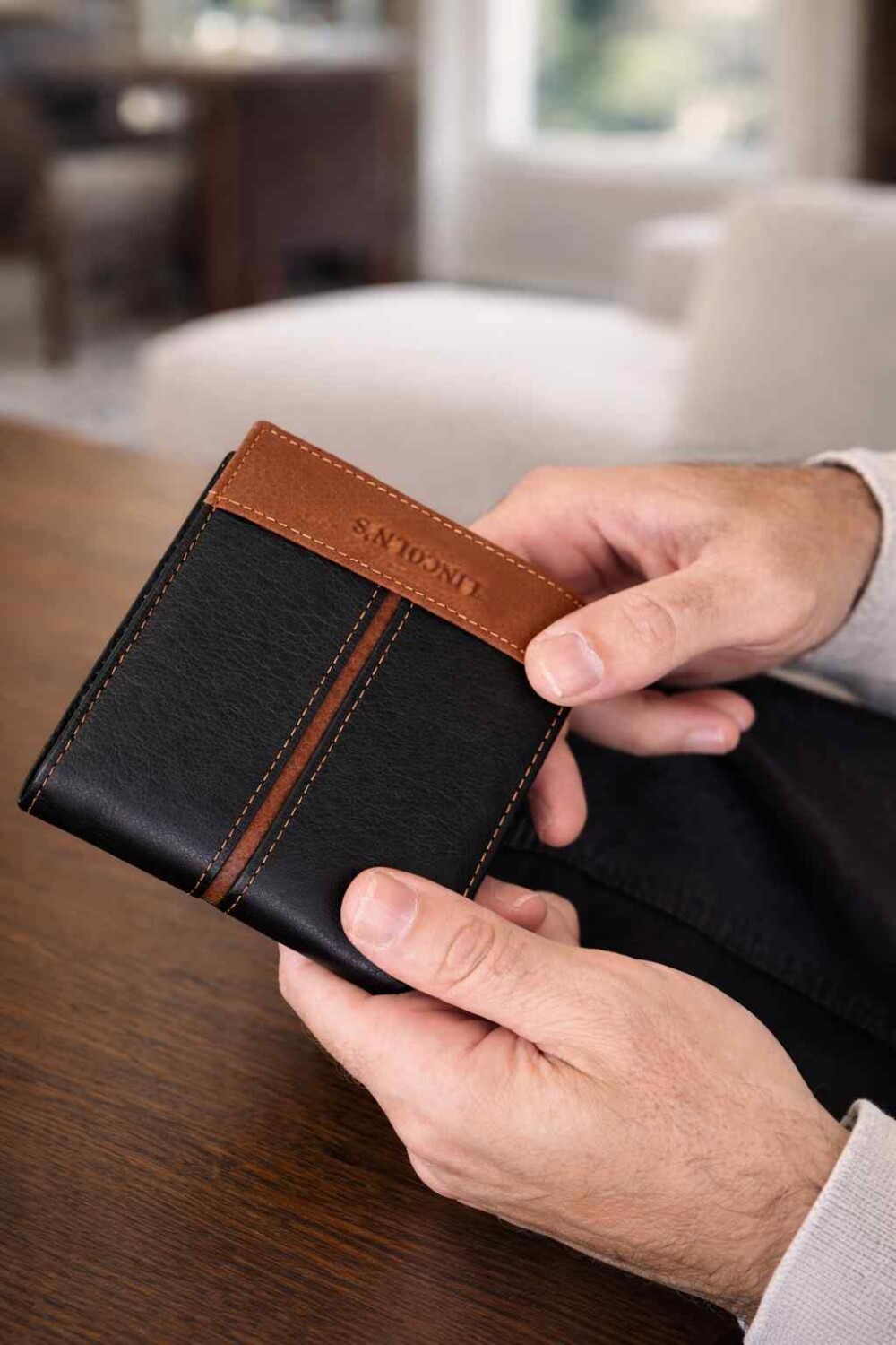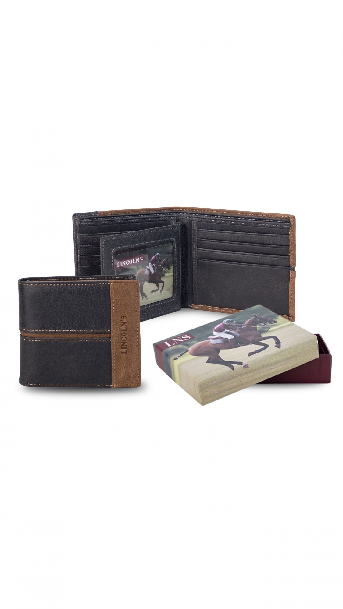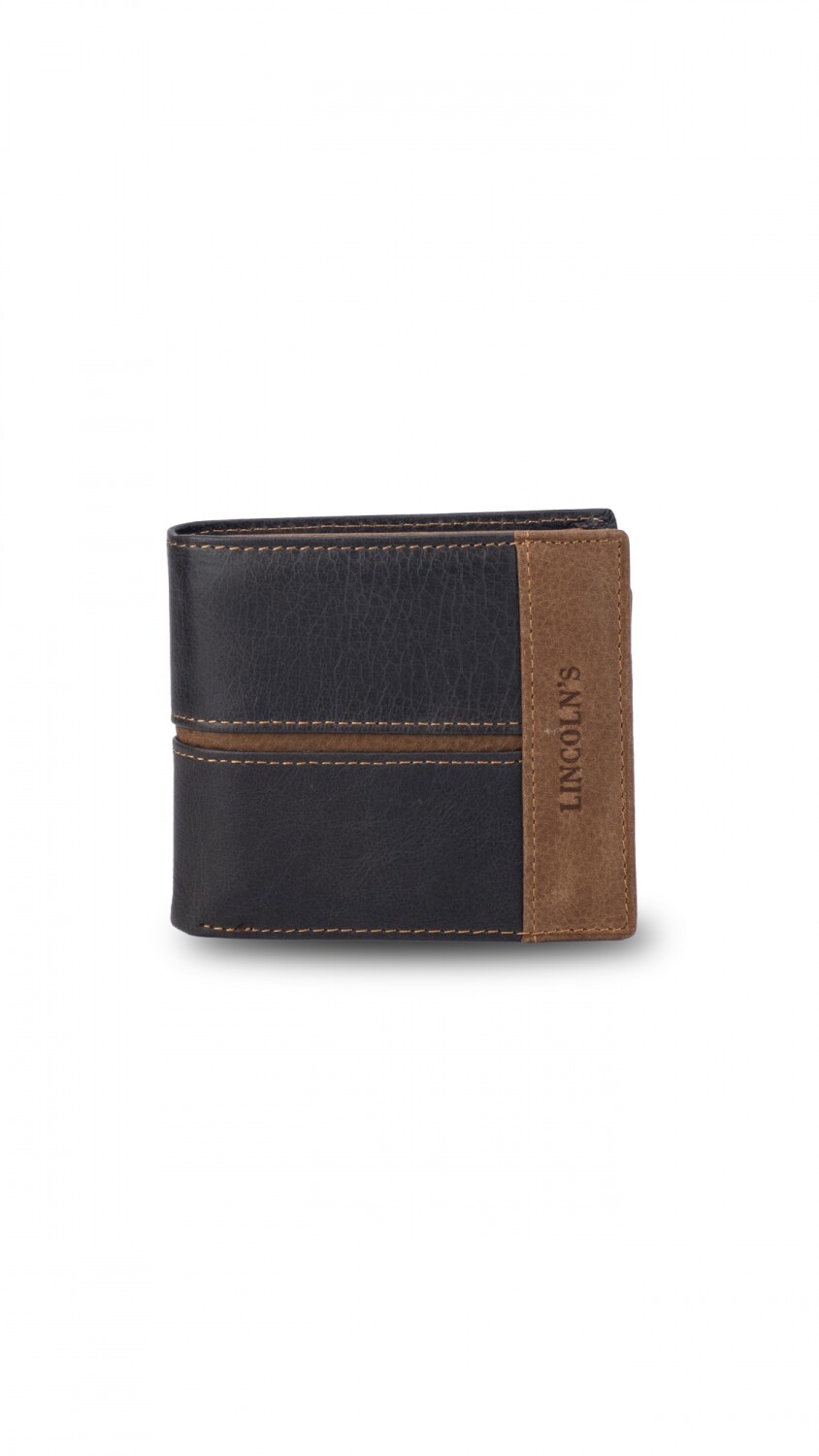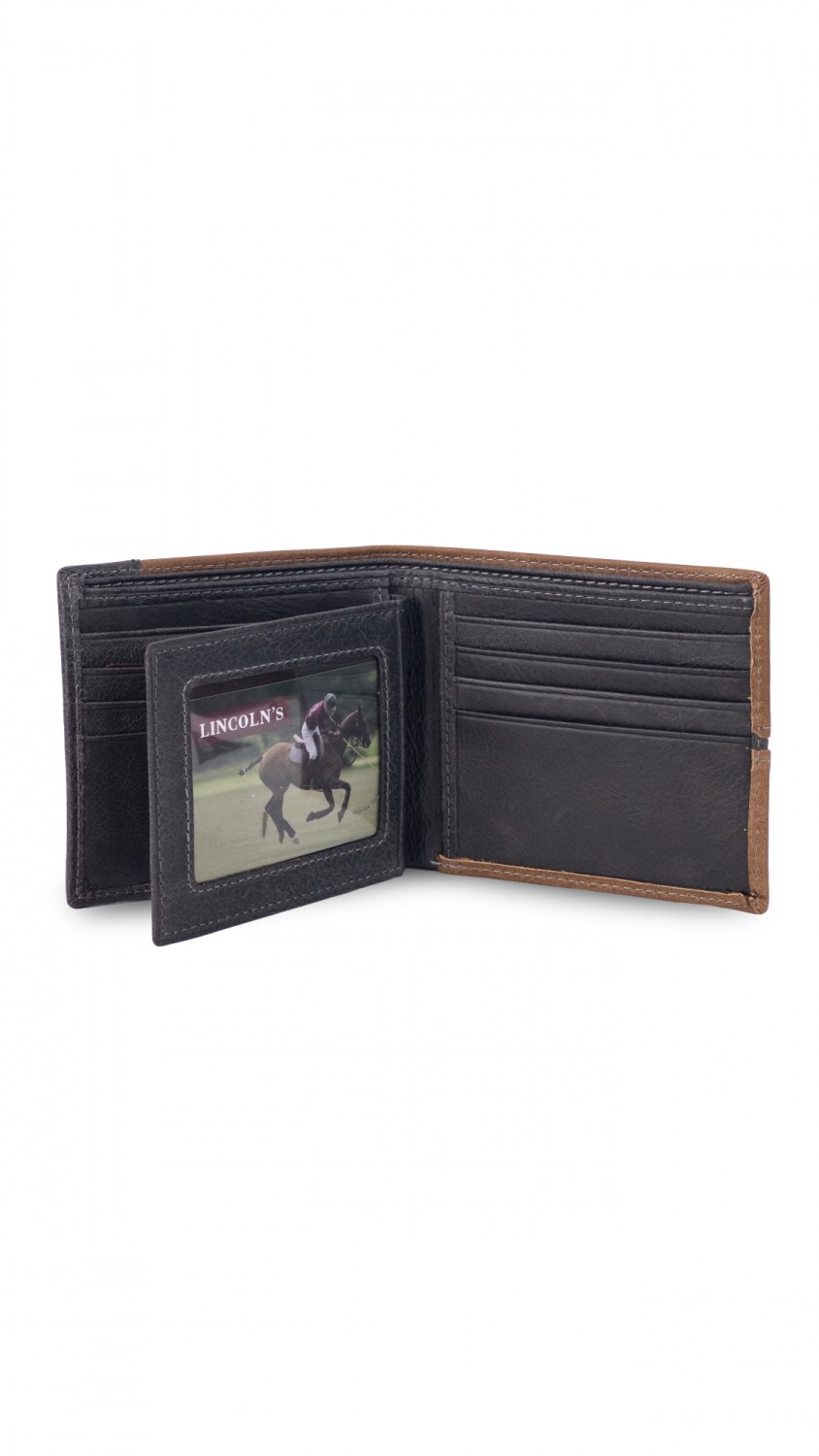 Billetera de hombre en cuero con solapa central, múltiples ranuras para tarjetas, compartimiento para billetes y visor transparente. Diseño combinado en dos tonos.