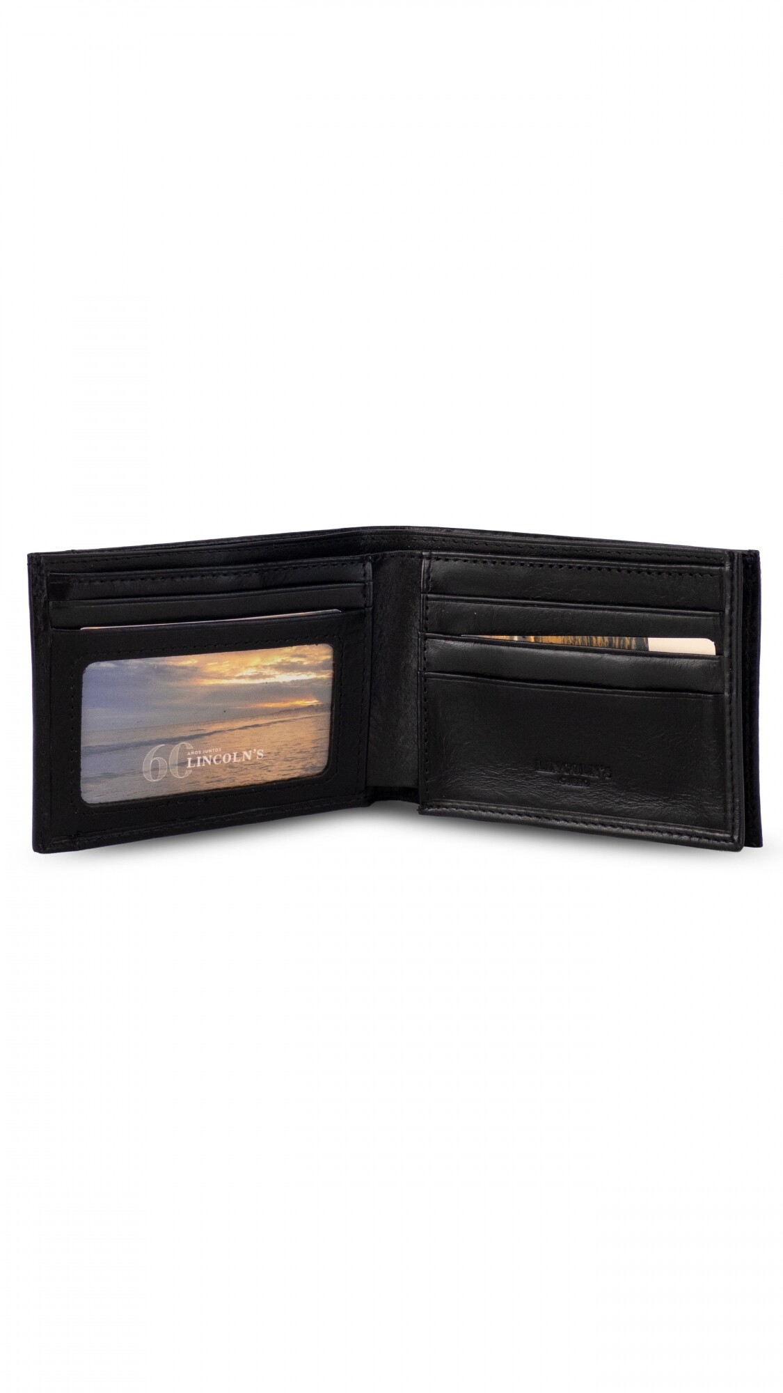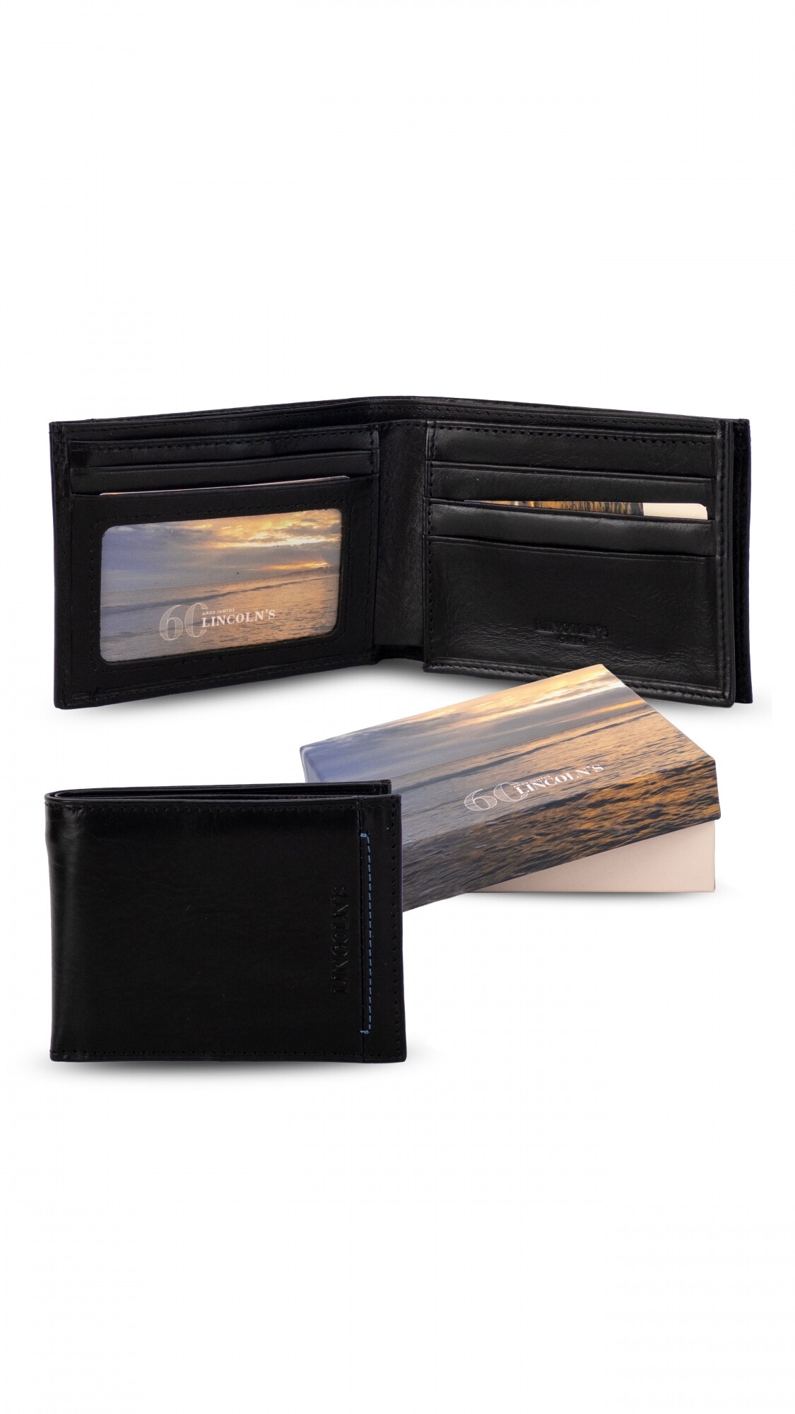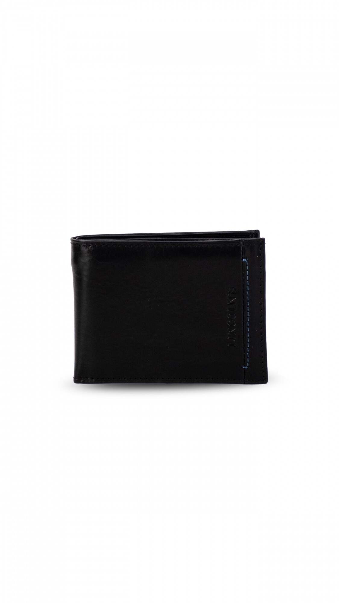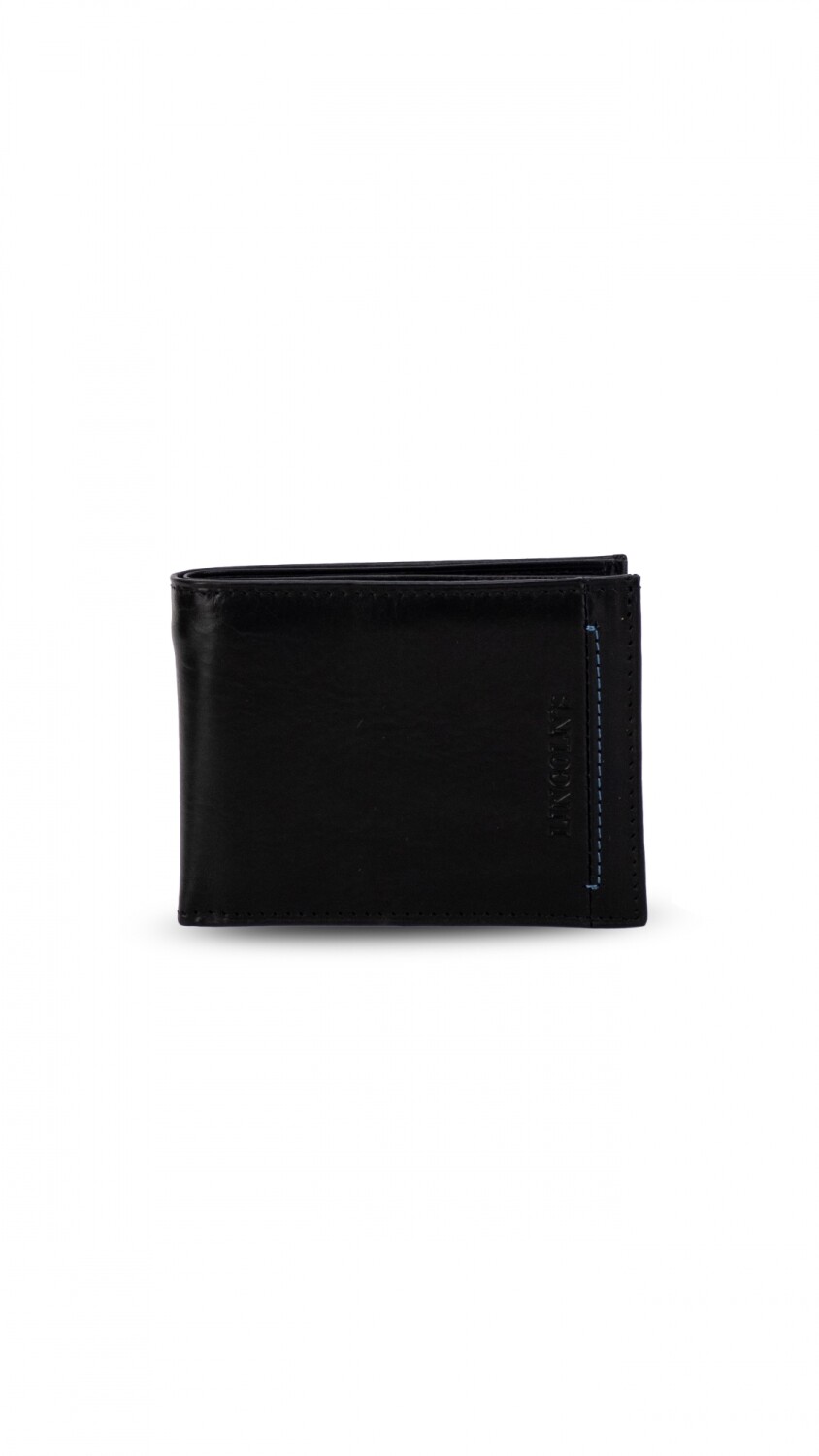 Billetera en cuero lisa con detalle de pespunte azul. Interior con repartición para billetes, visor y tarjeteros.