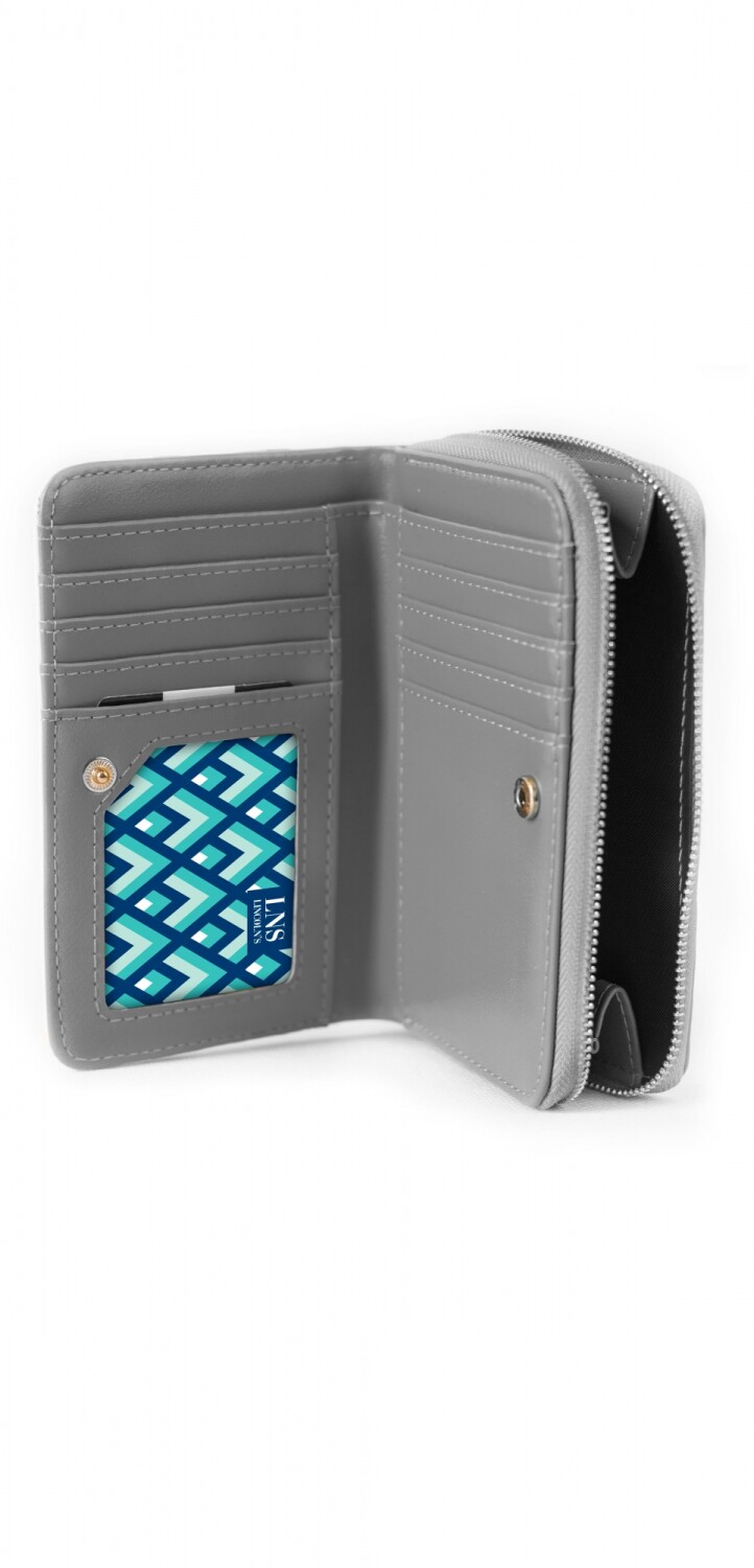 Billetera mediana en símil cuero con franjas combinadas, con tapa al frente con compartimento interior con 8 tarjeteros y lugar para billetes, Monedero con cierre alrededor.