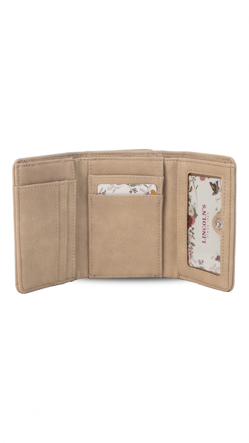 Billetera corta con broche a presión. Interior con tarjeteros, visor, bolsillos y repartición para billetes. Compartimento posterior con cierre y dos divisiones internas.