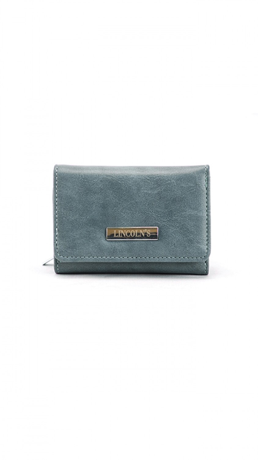 Billetera corta con broche a presión. Interior con tarjeteros, visor, bolsillos y repartición para billetes. Compartimento posterior con cierre y dos divisiones internas.
