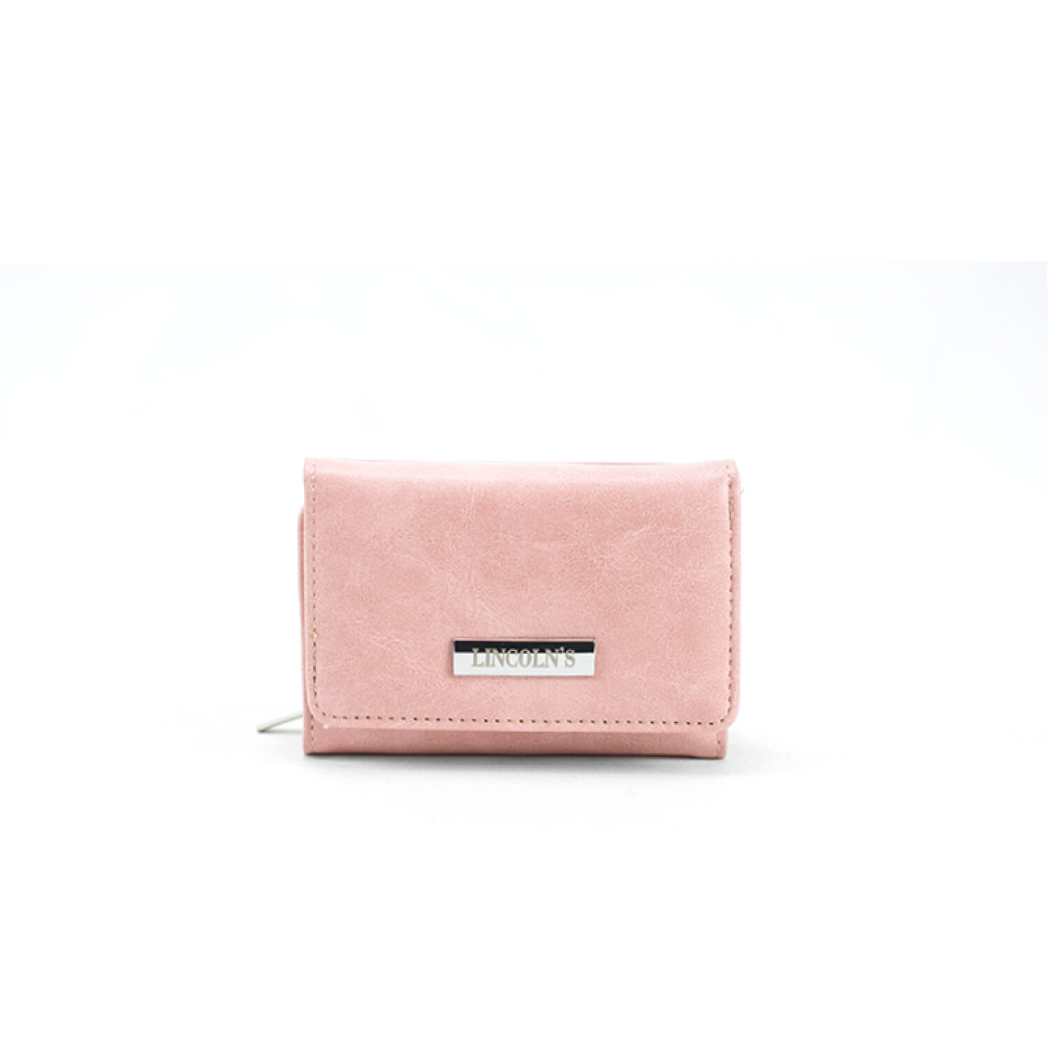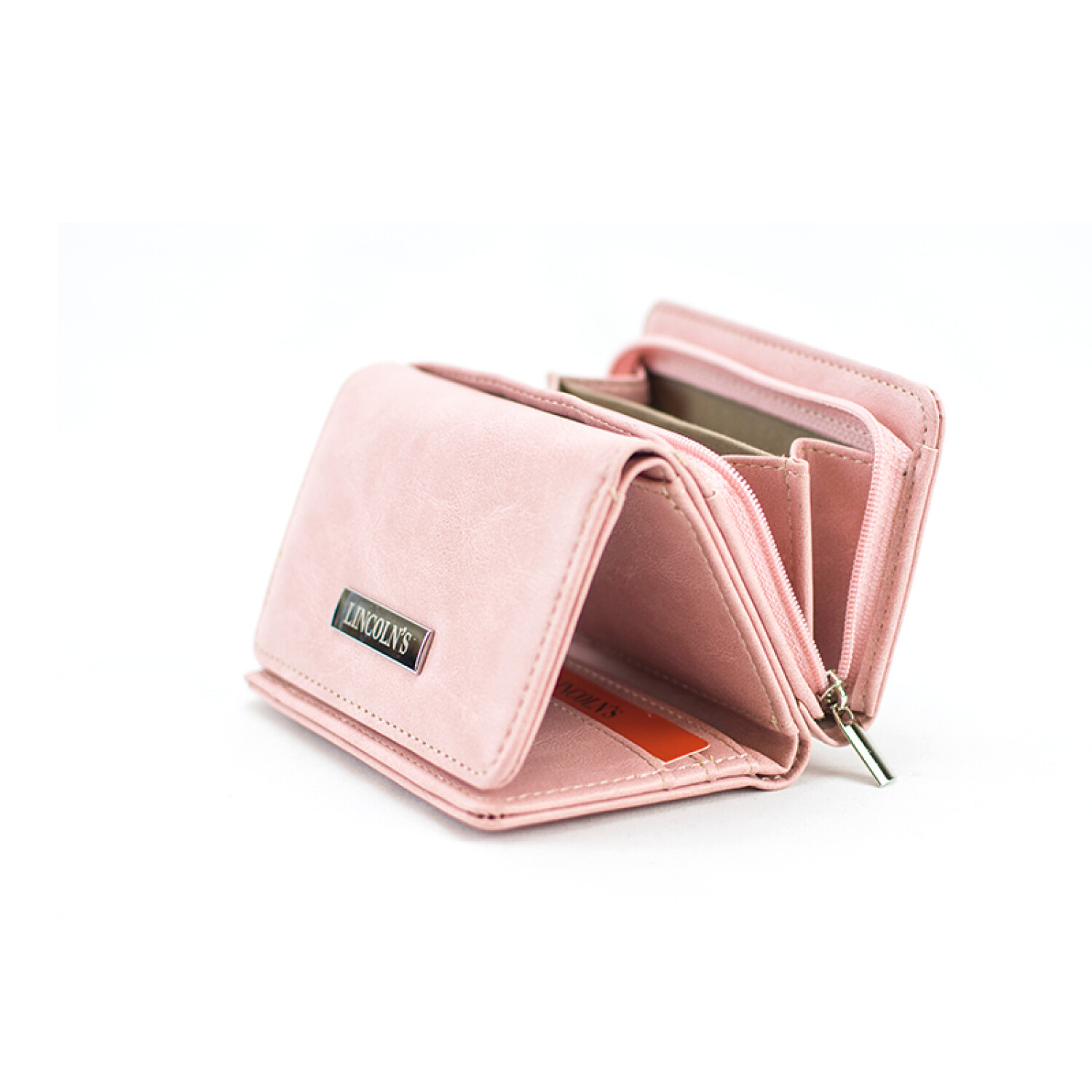Billetera corta con broche a presión. Interior con tarjeteros, visor, bolsillos y repartición para billetes. Compartimento posterior con cierre y dos divisiones internas.