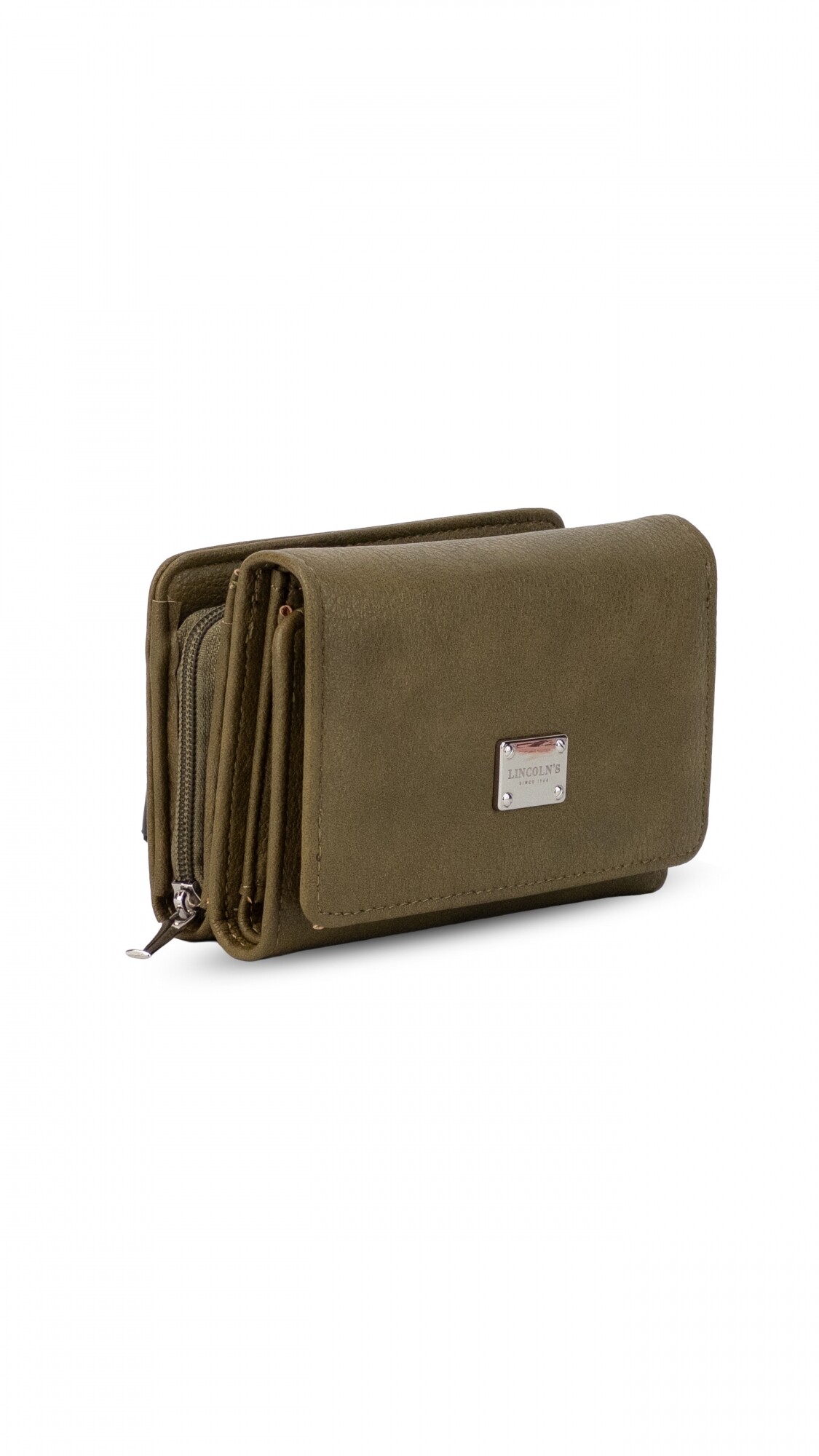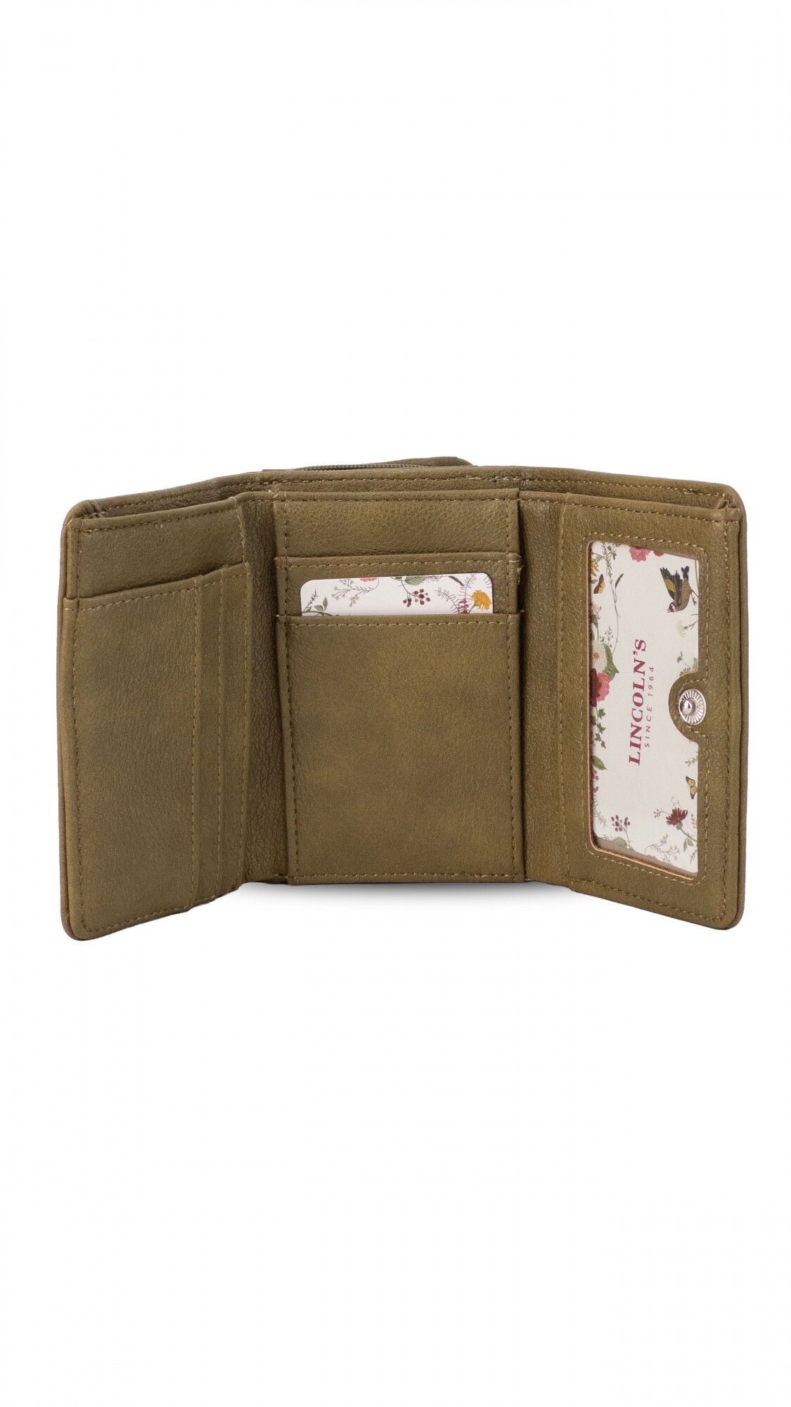 Billetera corta con broche a presión. Interior con tarjeteros, visor, bolsillos y repartición para billetes. Compartimento posterior con cierre y dos divisiones internas.