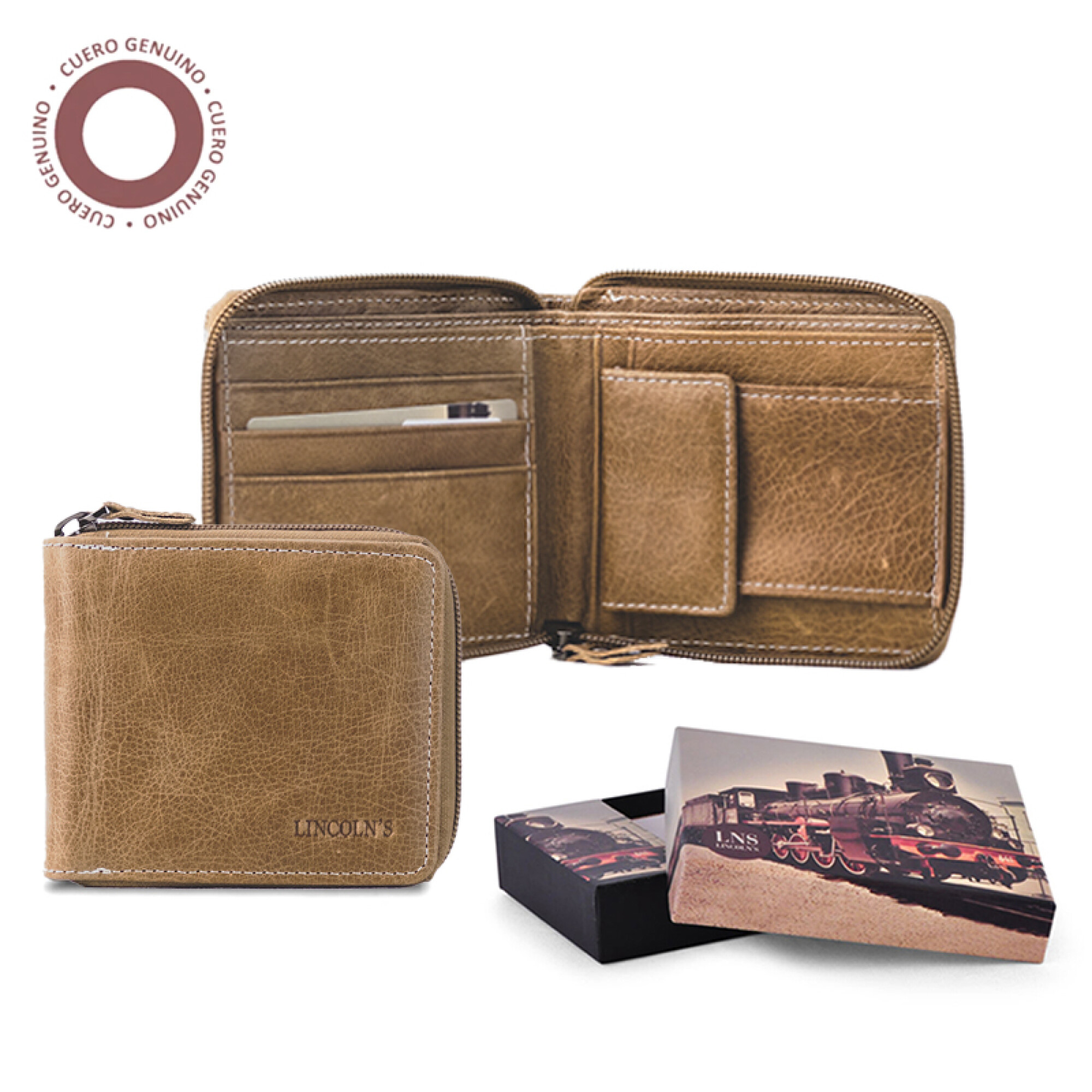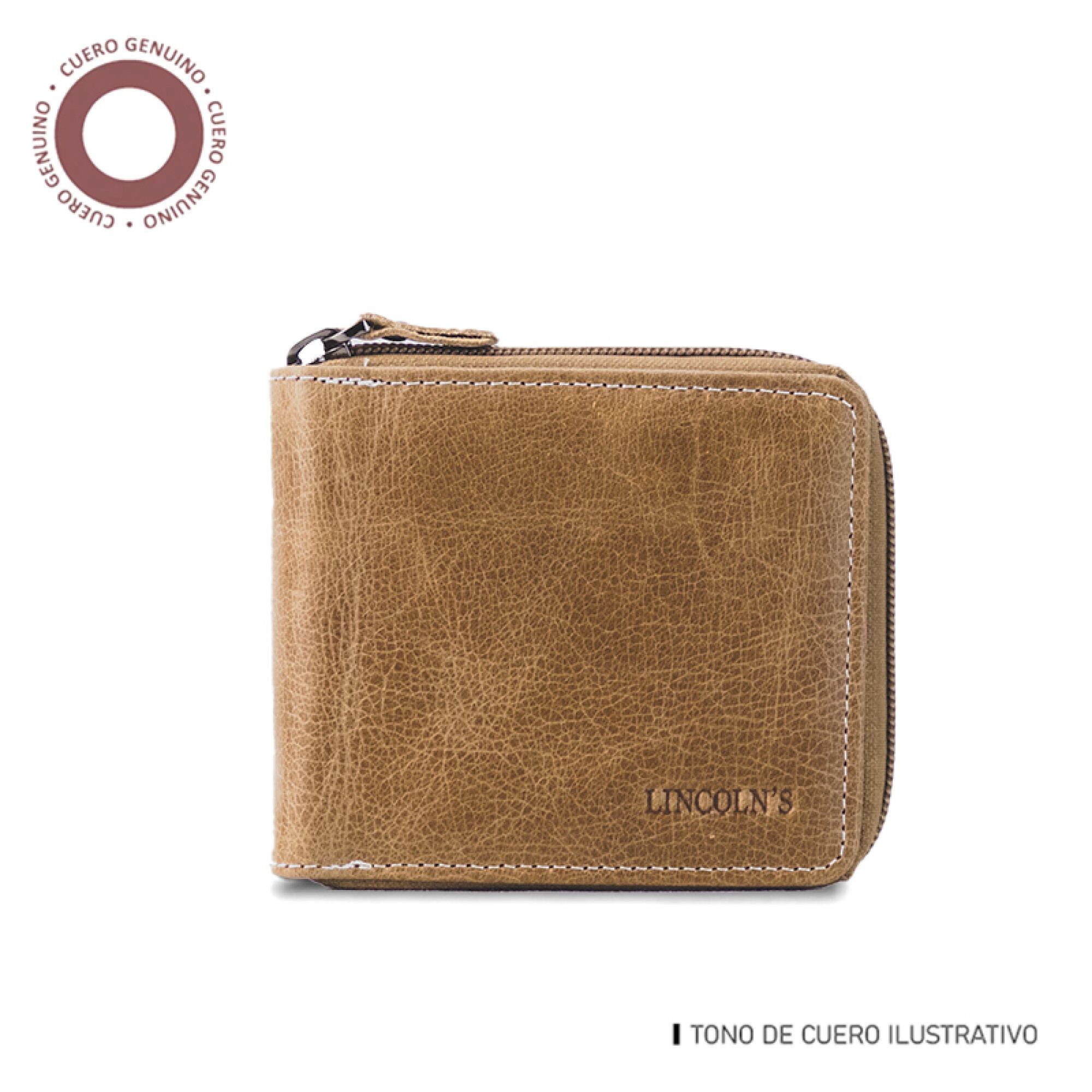 Billetera en cuero con cierre alrededor. Interior con repartición para billetes, tarjeteros y monedero con broche