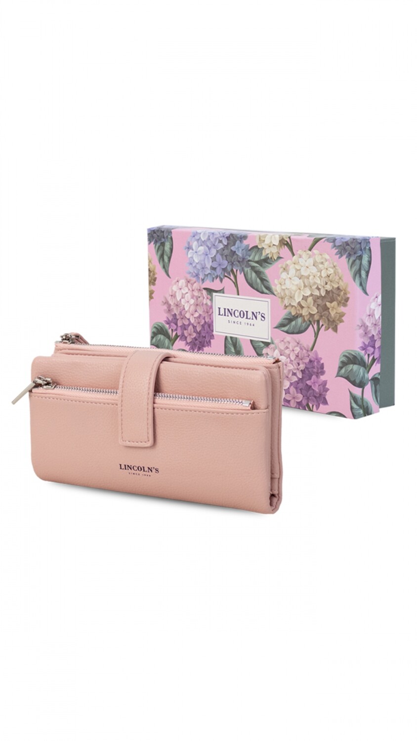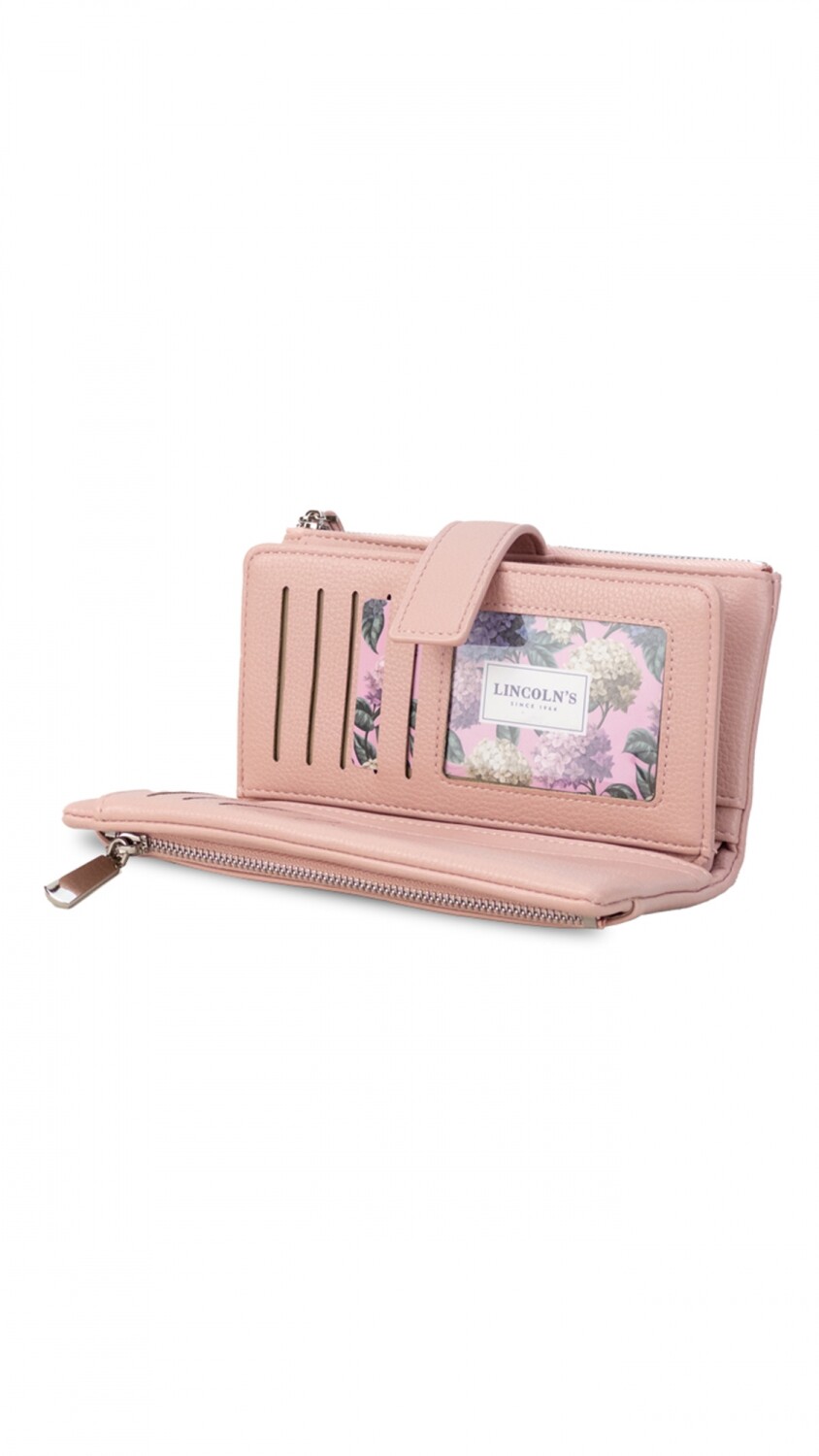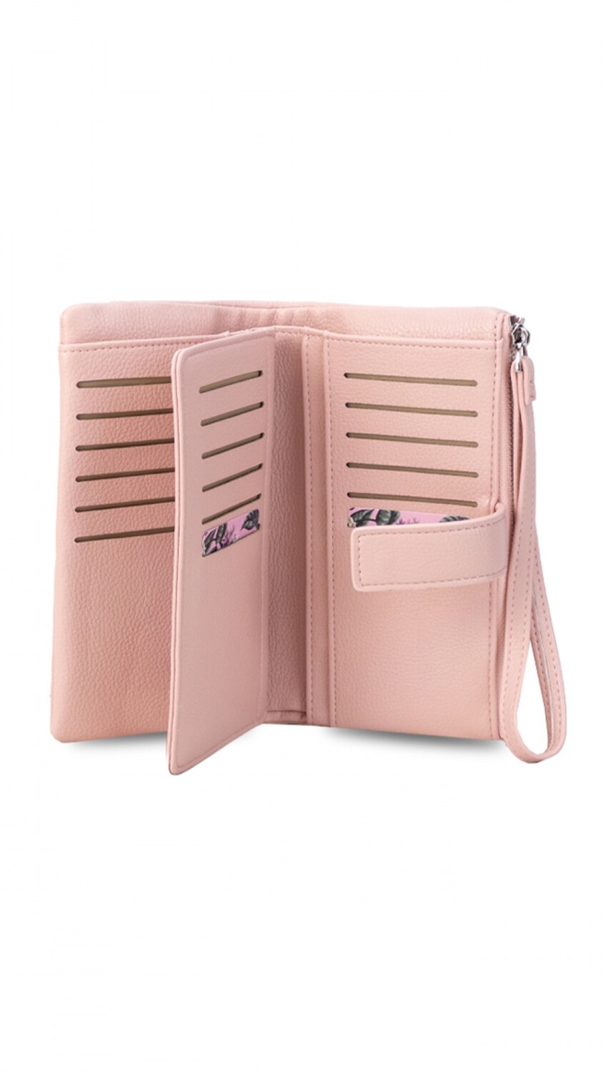 Elegante billetera de mujer con diseño práctico. Cuenta con presilla con broche, correa de mano, tarjeteros internos, monedero con cierre y un bolsillo de gran capacidad para billetes. Perfecta para llevar todo con estilo y organización.