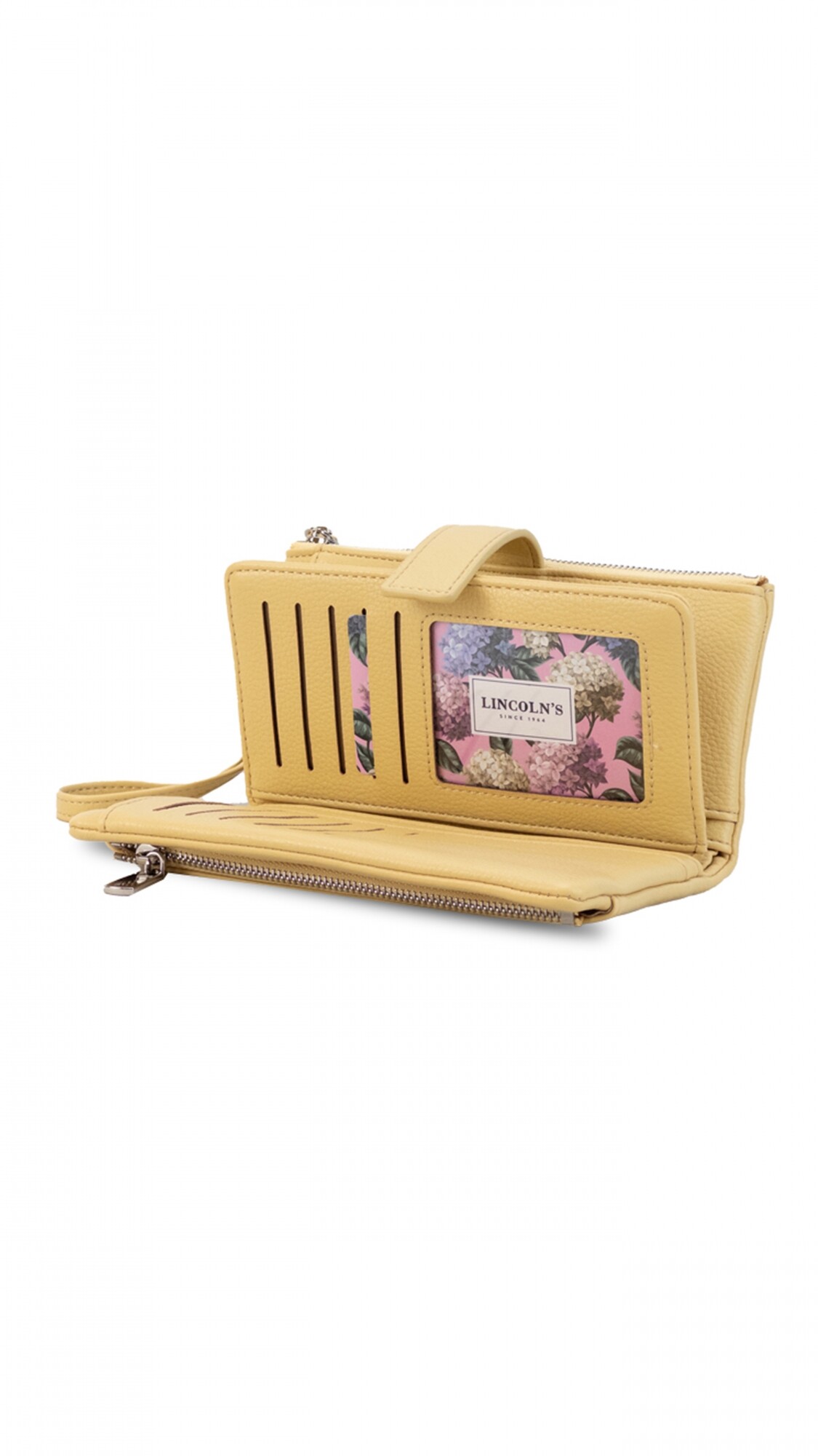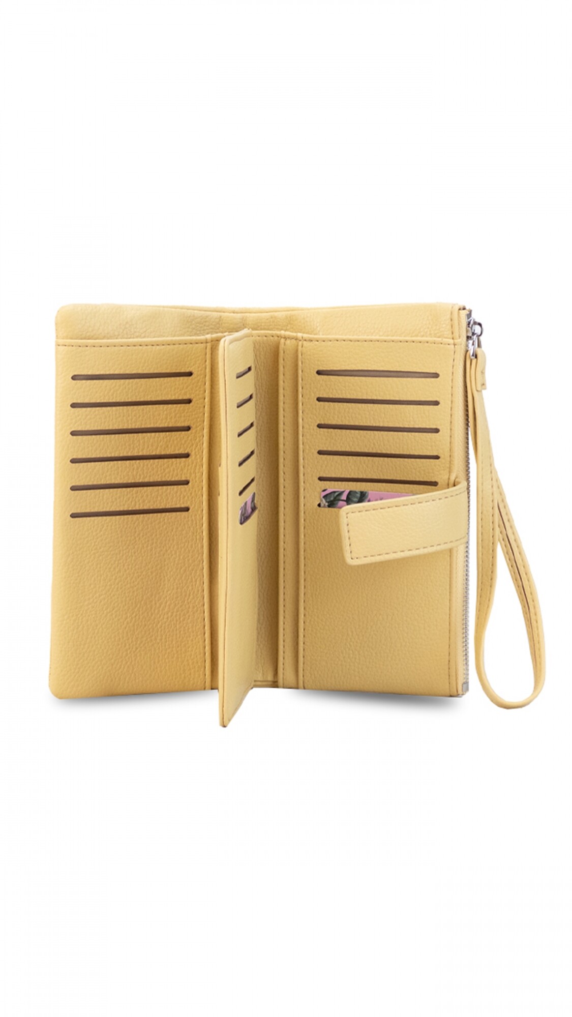 Elegante billetera de mujer con diseño práctico. Cuenta con presilla con broche, correa de mano, tarjeteros internos, monedero con cierre y un bolsillo de gran capacidad para billetes. Perfecta para llevar todo con estilo y organización.