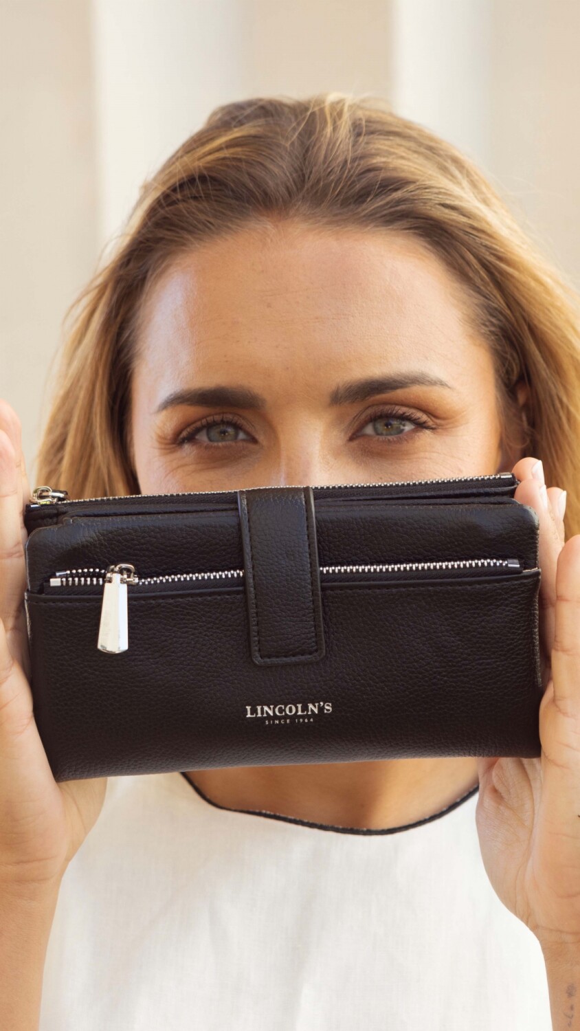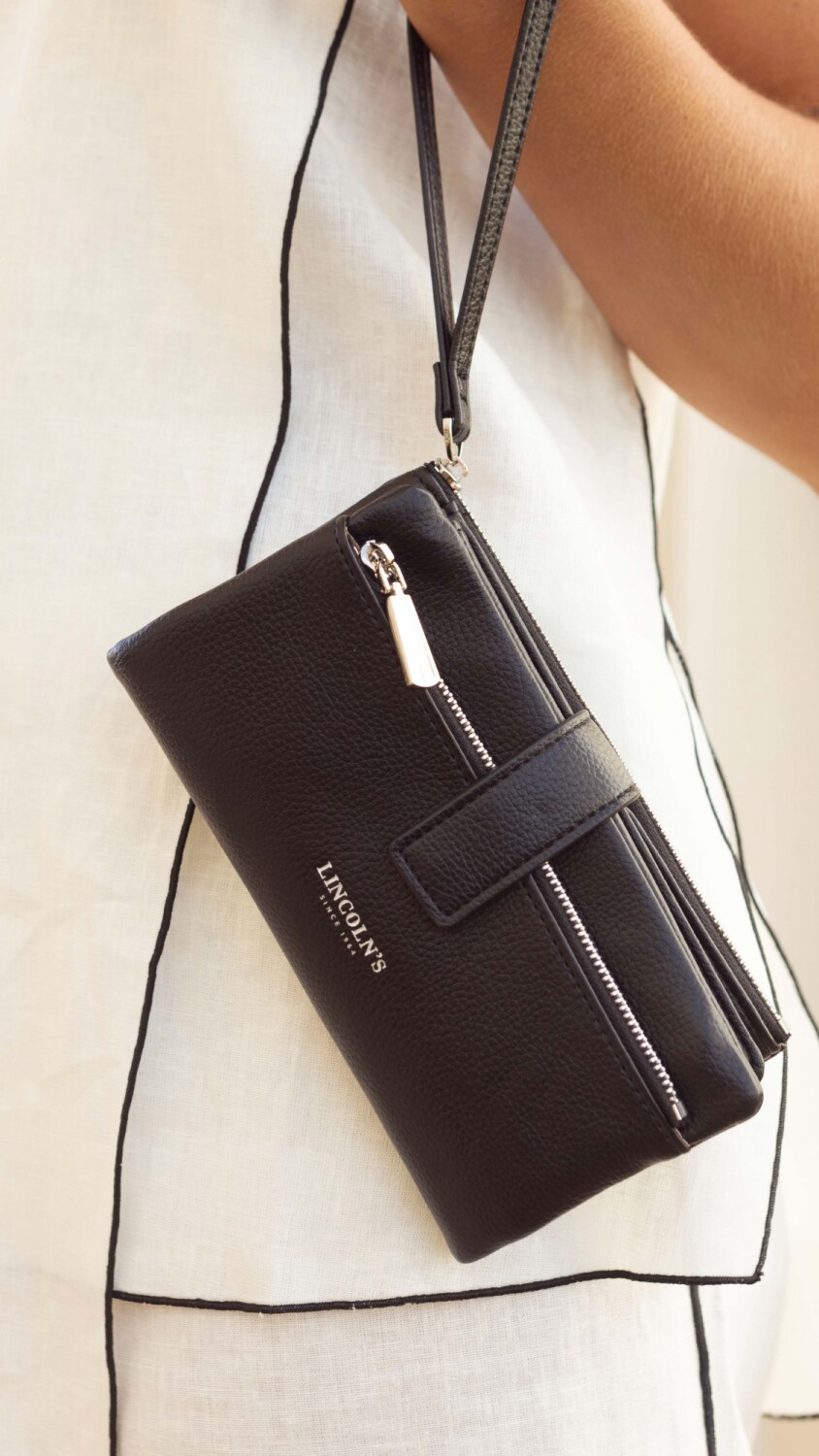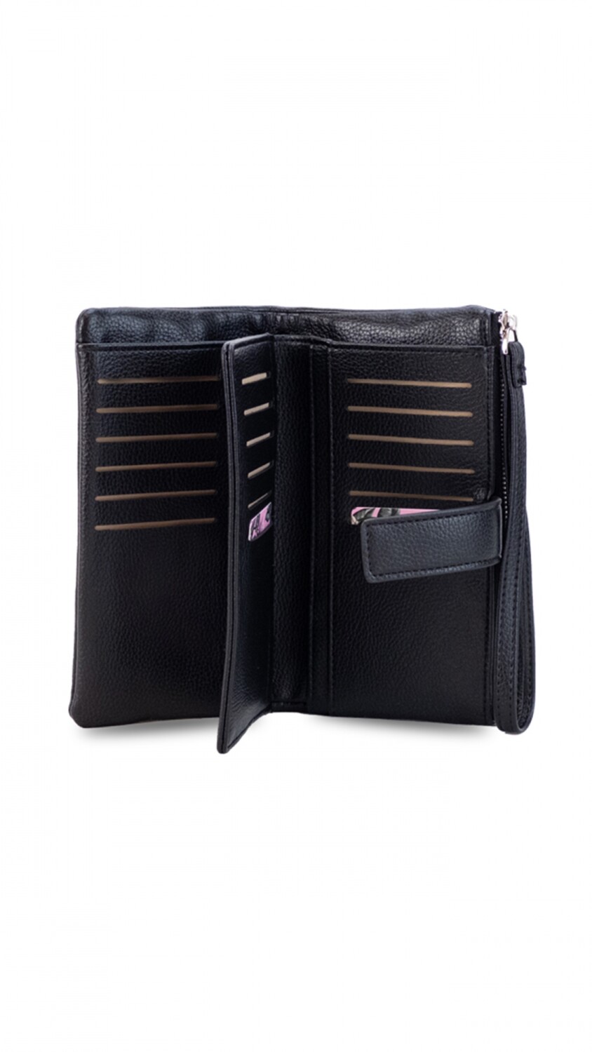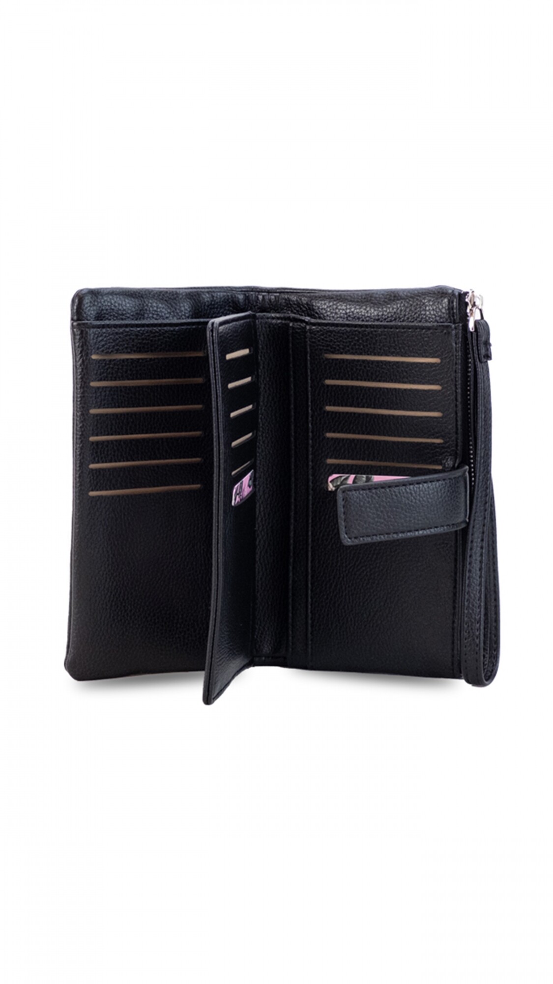 Elegante billetera de mujer con diseño práctico. Cuenta con presilla con broche, correa de mano, tarjeteros internos, monedero con cierre y un bolsillo de gran capacidad para billetes. Perfecta para llevar todo con estilo y organización.