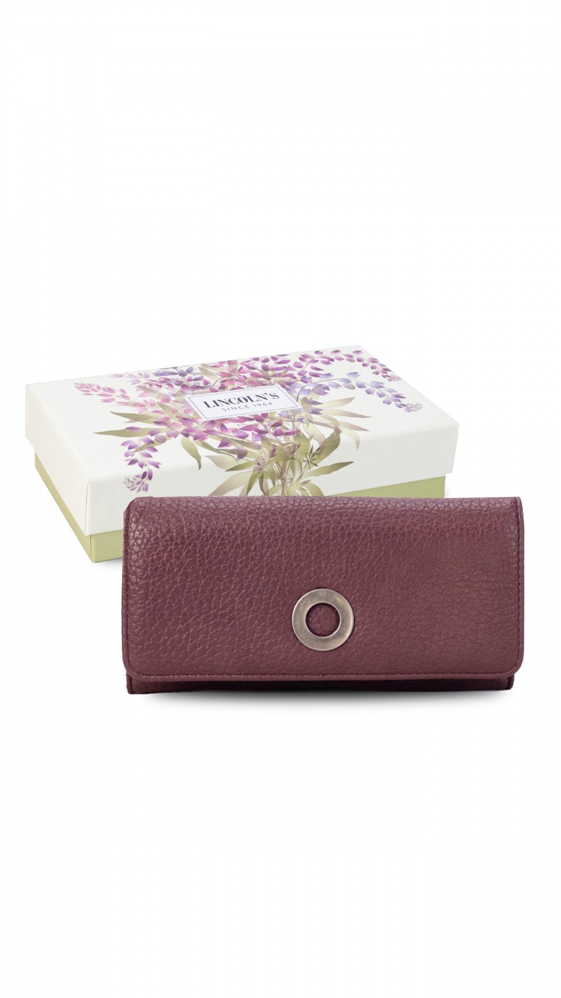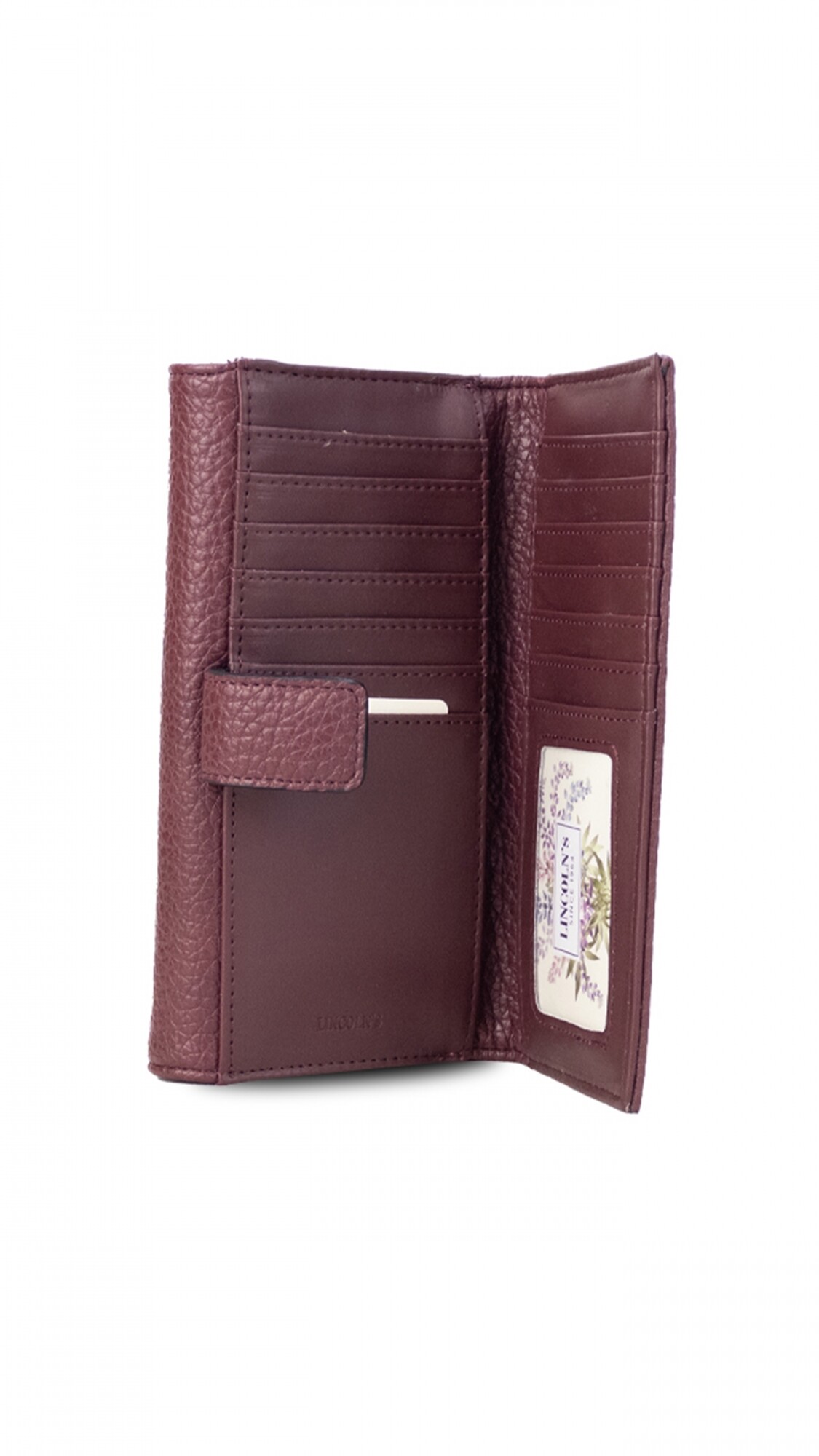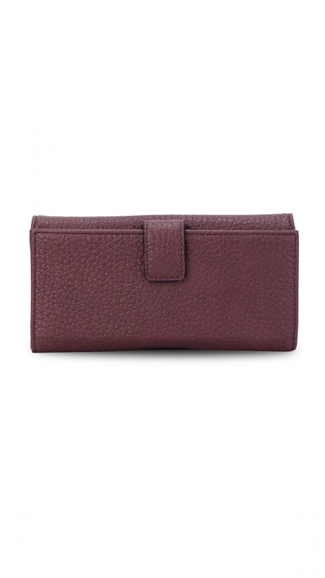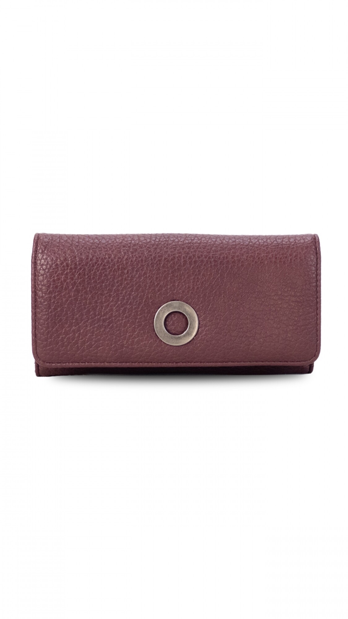 Billetera larga con solapa, aro de metal y repartición con cierre.