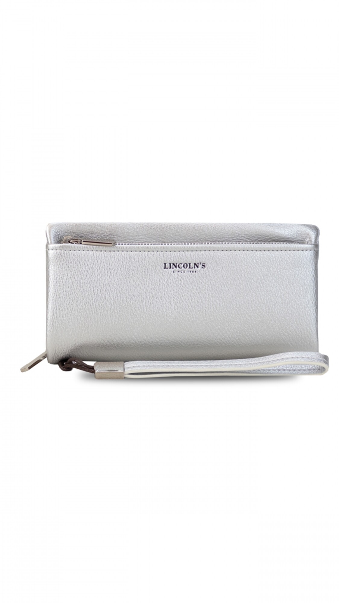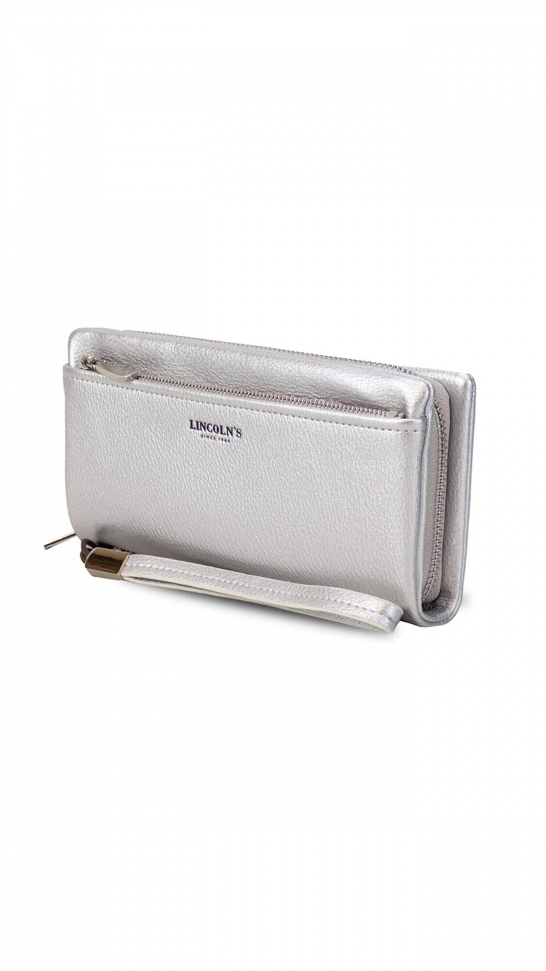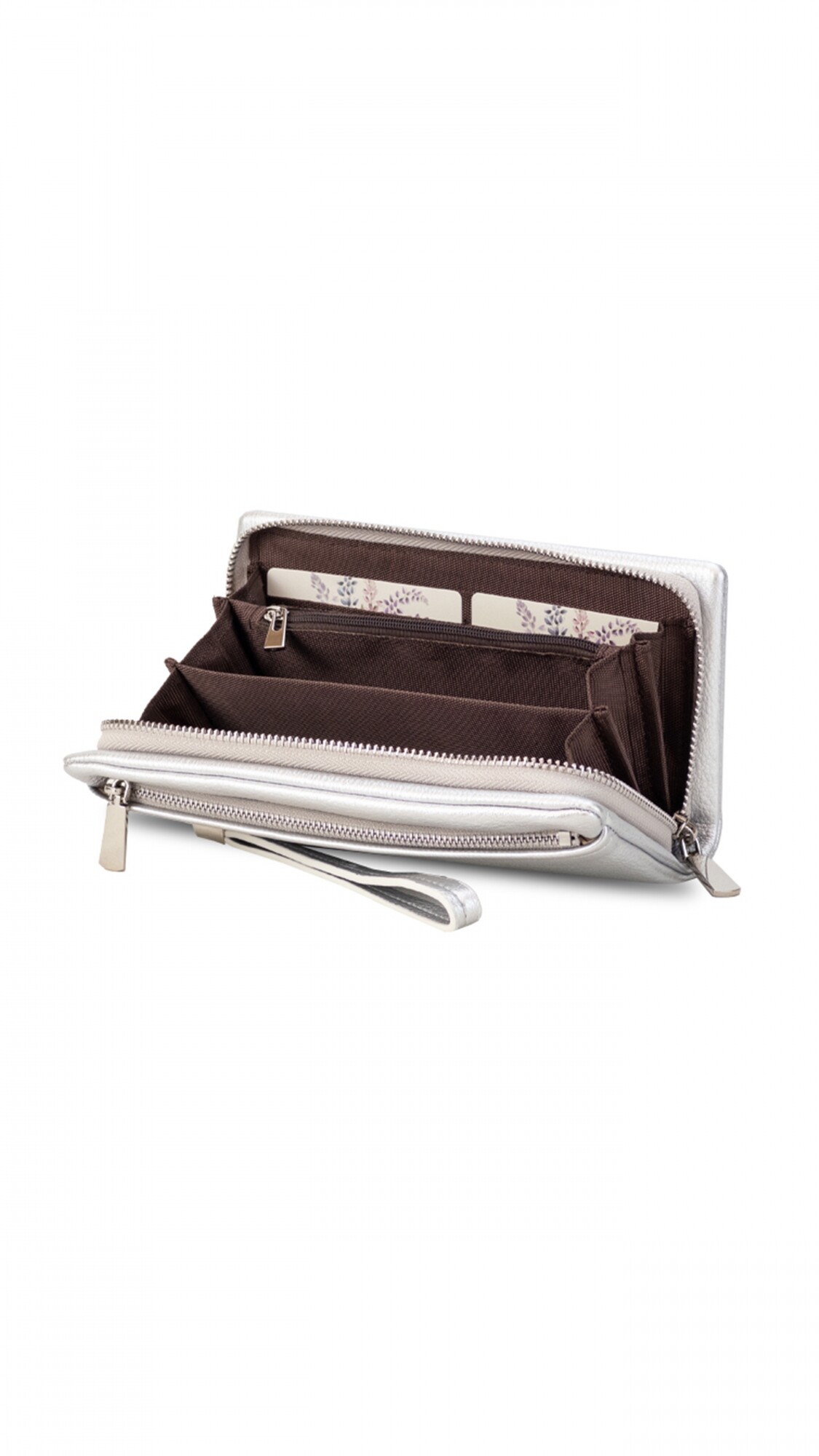 Elegante billetera de mujer con diseño práctico. Cuenta con bolsillo monedero con cierre al frente , correa de mano, tarjeteros internos con divisiones.