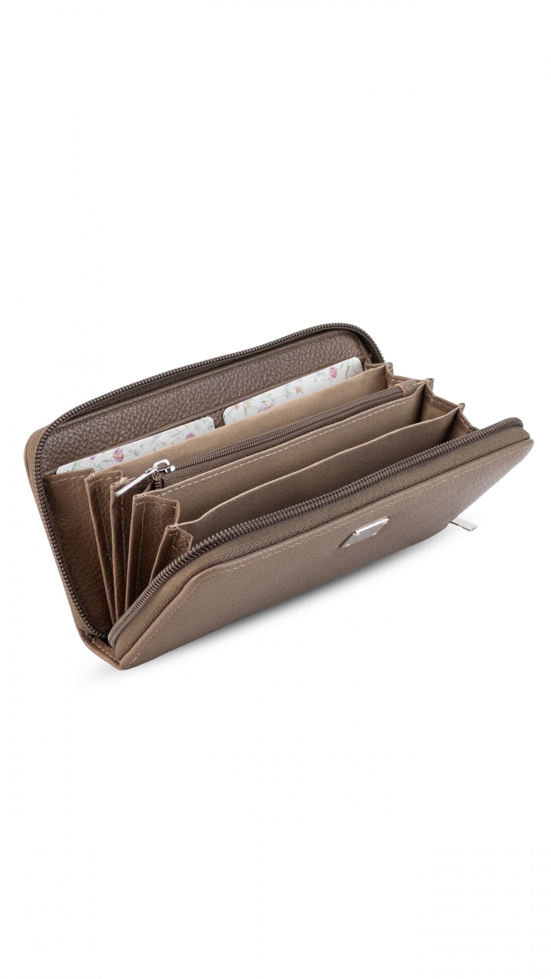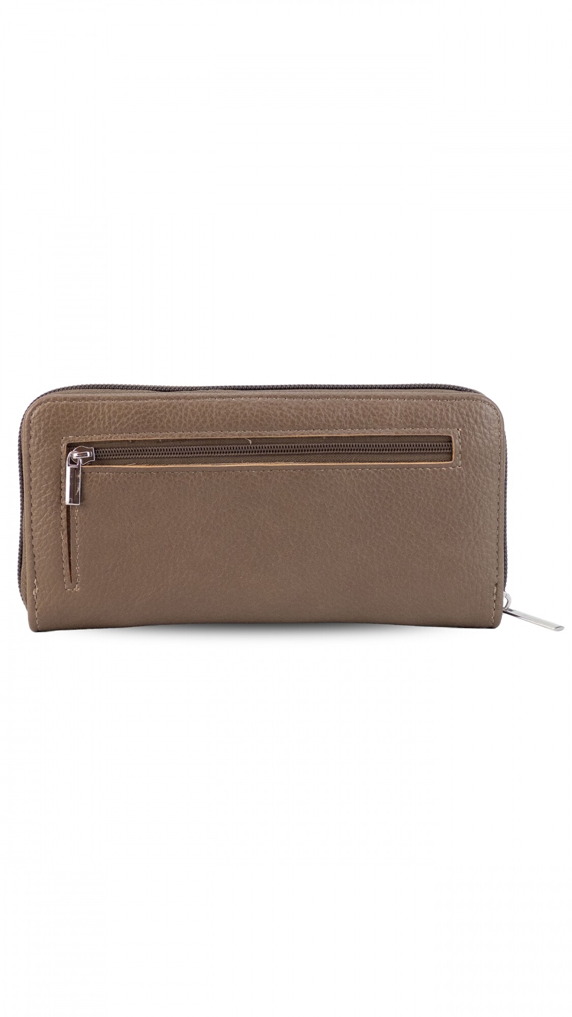 Billetera larga con cierre alrededor. Incluye varias reparticiones con tarjeteros y bolsillos a de más de un bolsillo con cierre en el interior. Monedero con cierre atrás.