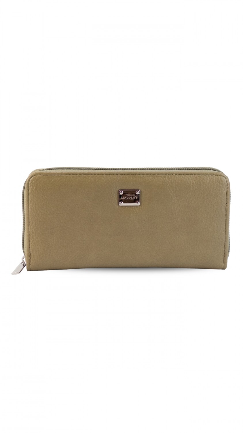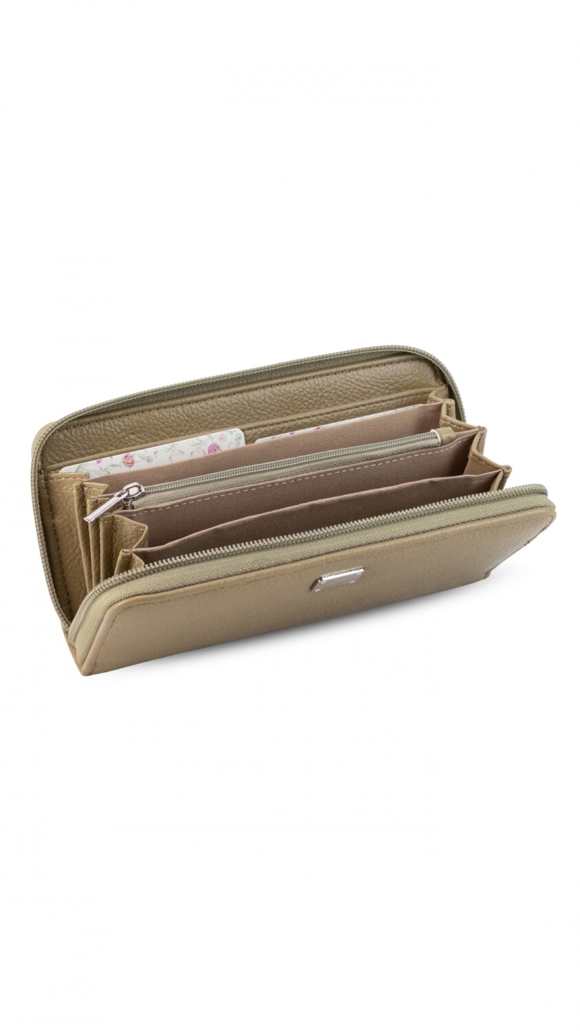 Billetera larga con cierre alrededor. Incluye varias reparticiones con tarjeteros y bolsillos a de más de un bolsillo con cierre en el interior. Monedero con cierre atrás.